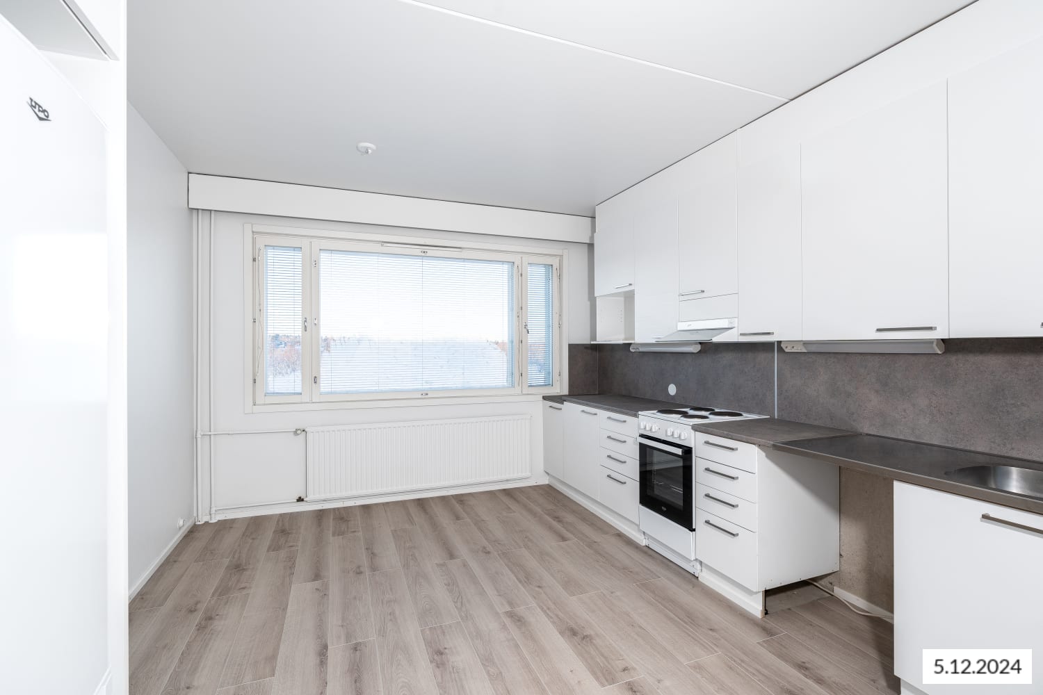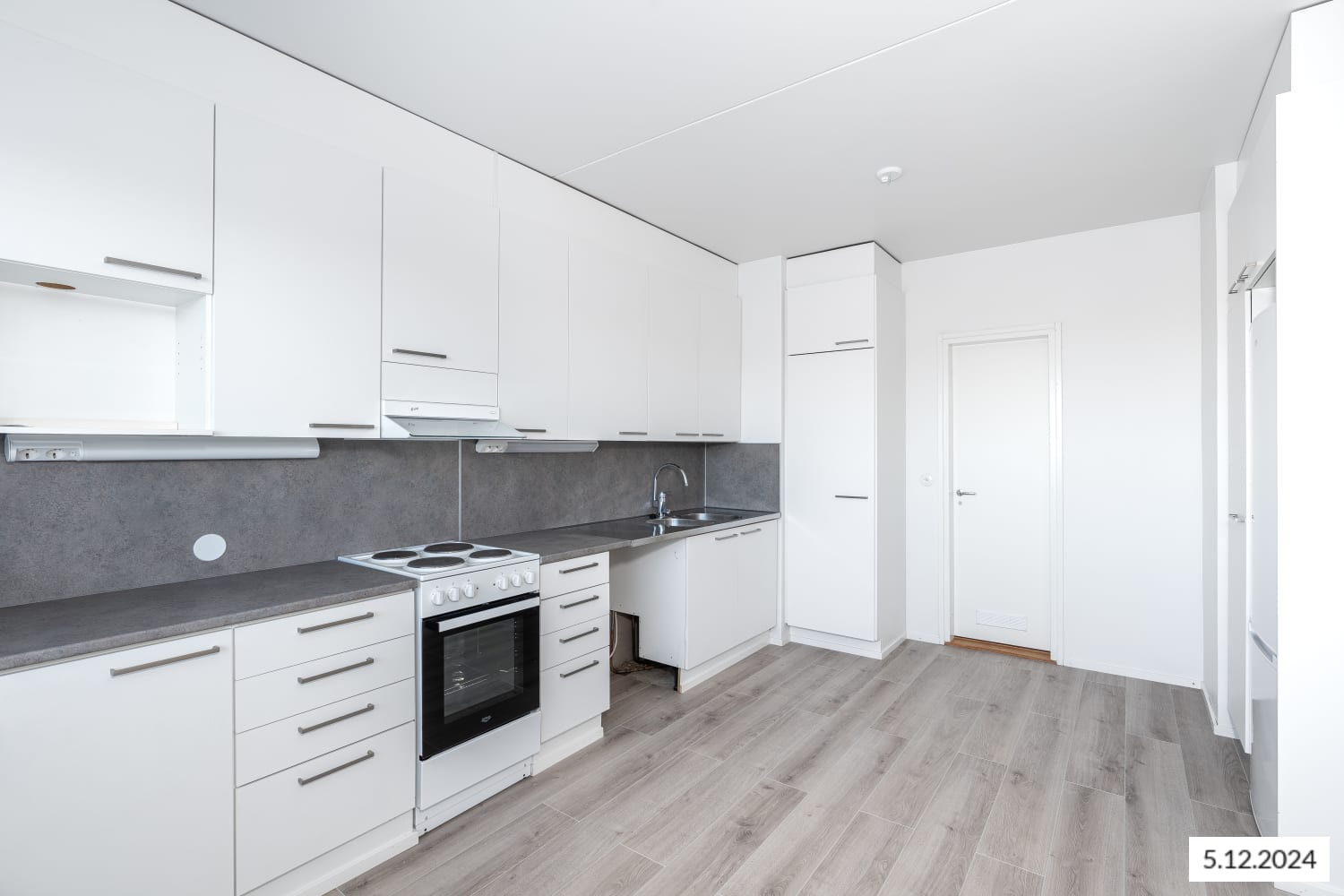The kitchen comfortably accommodates a dining table and is equipped with a fridge-freezer, built-in oven, and stove. A dishwasher can be installed if desired.