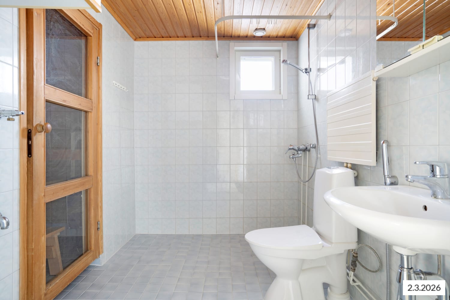 The tiled bathroom has space for a washing machine.