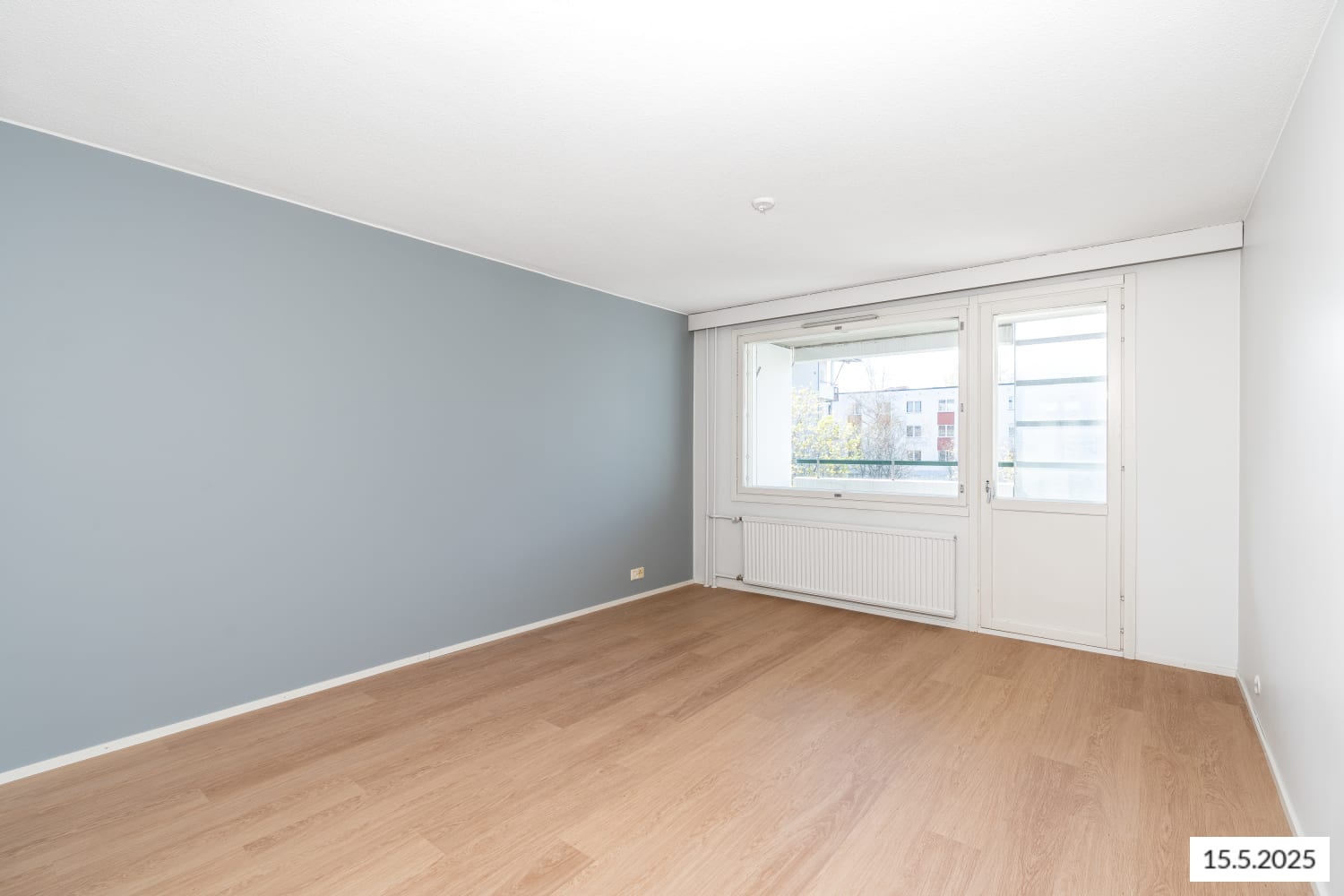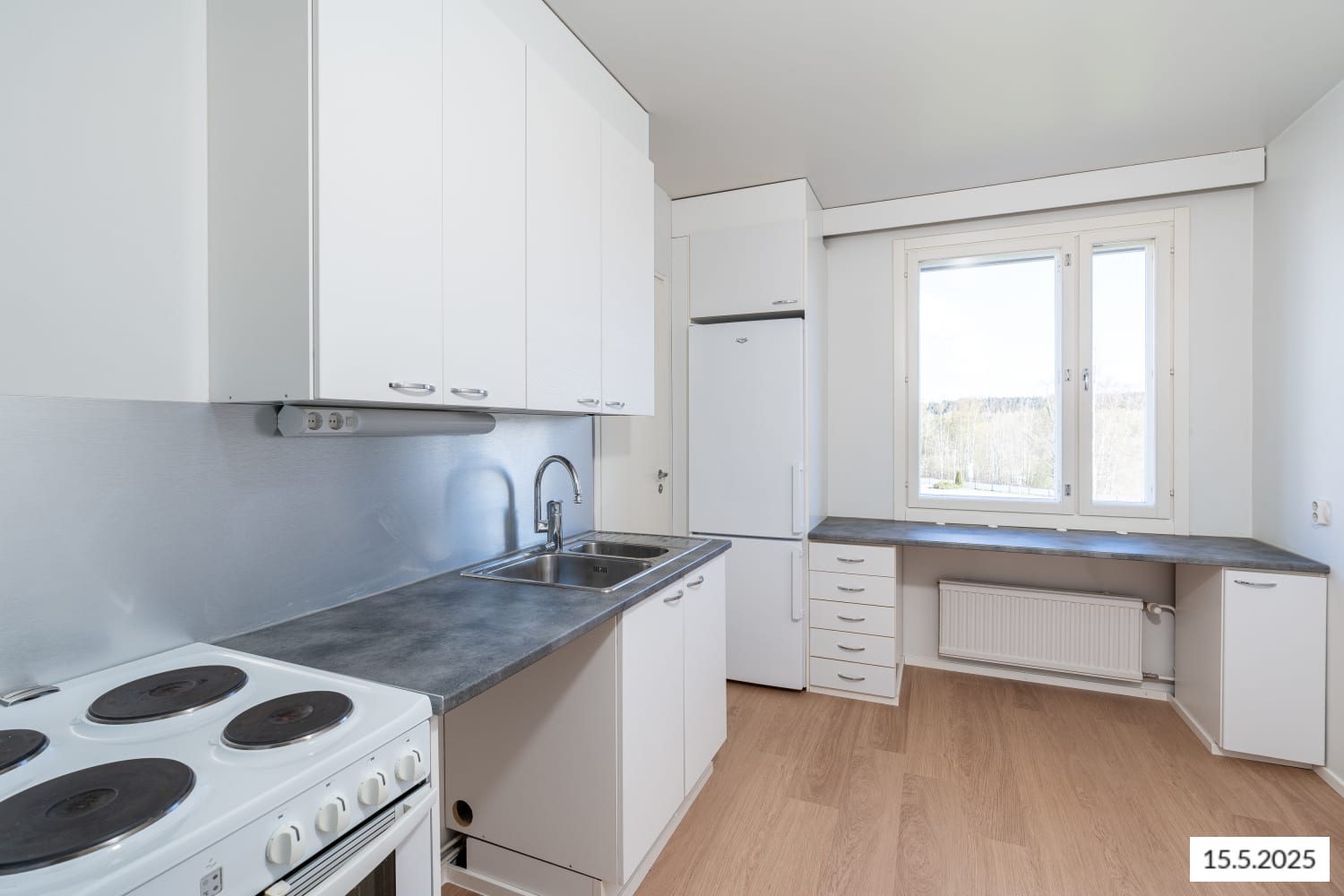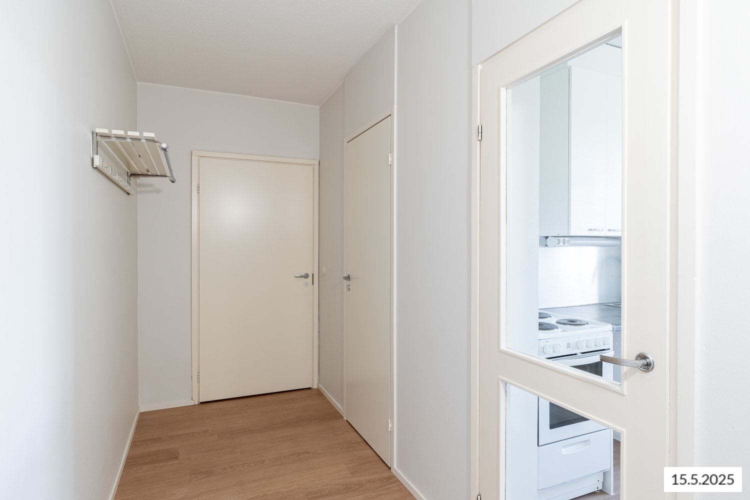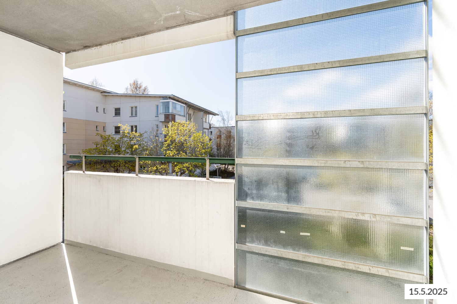 This charming top-floor one-bedroom home features a clear, easily furnishable layout. The windows offer views of Lake Iidesjärvi. From the spacious living room, you can access the south-facing balcony.