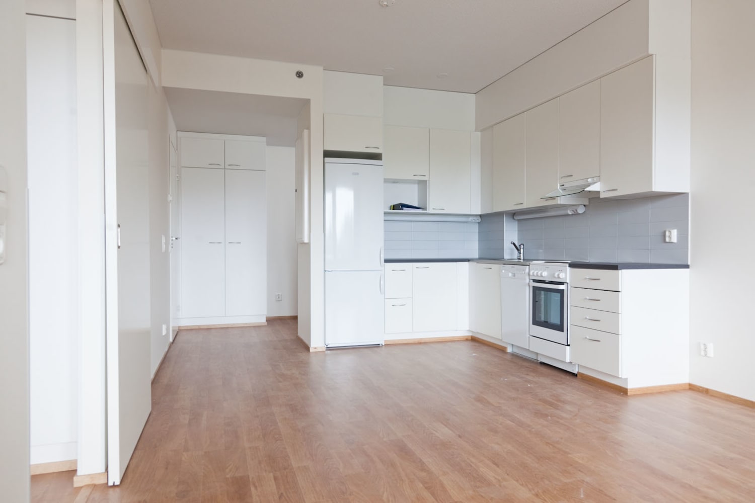 The homes have laminate flooring and tiled bathrooms fitted with underfloor comfort heating. The kitchens are equipped with a fridge-freezer (two appliances in two-bedrooms) as well as four-burner electric cooker. The kitchens have hook-ups in place for dishwasher and space for a microwave, the bathrooms have space for a washing machine and dryer. Some of the ground-floor homes have private yards, the other homes have glassed-in balconies. The building is entirely non-smoking, homes and balconies included.