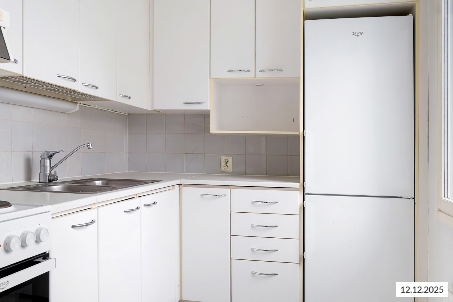 The compact kitchen has a window and the living area features a convenient alcove. The hallway offers both closet space and a separate wardrobe.