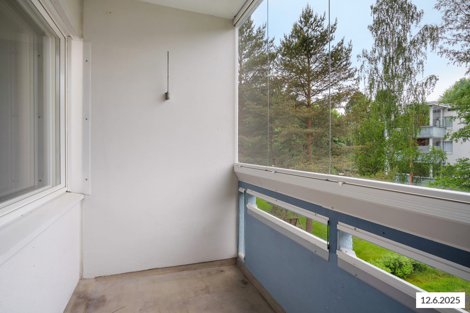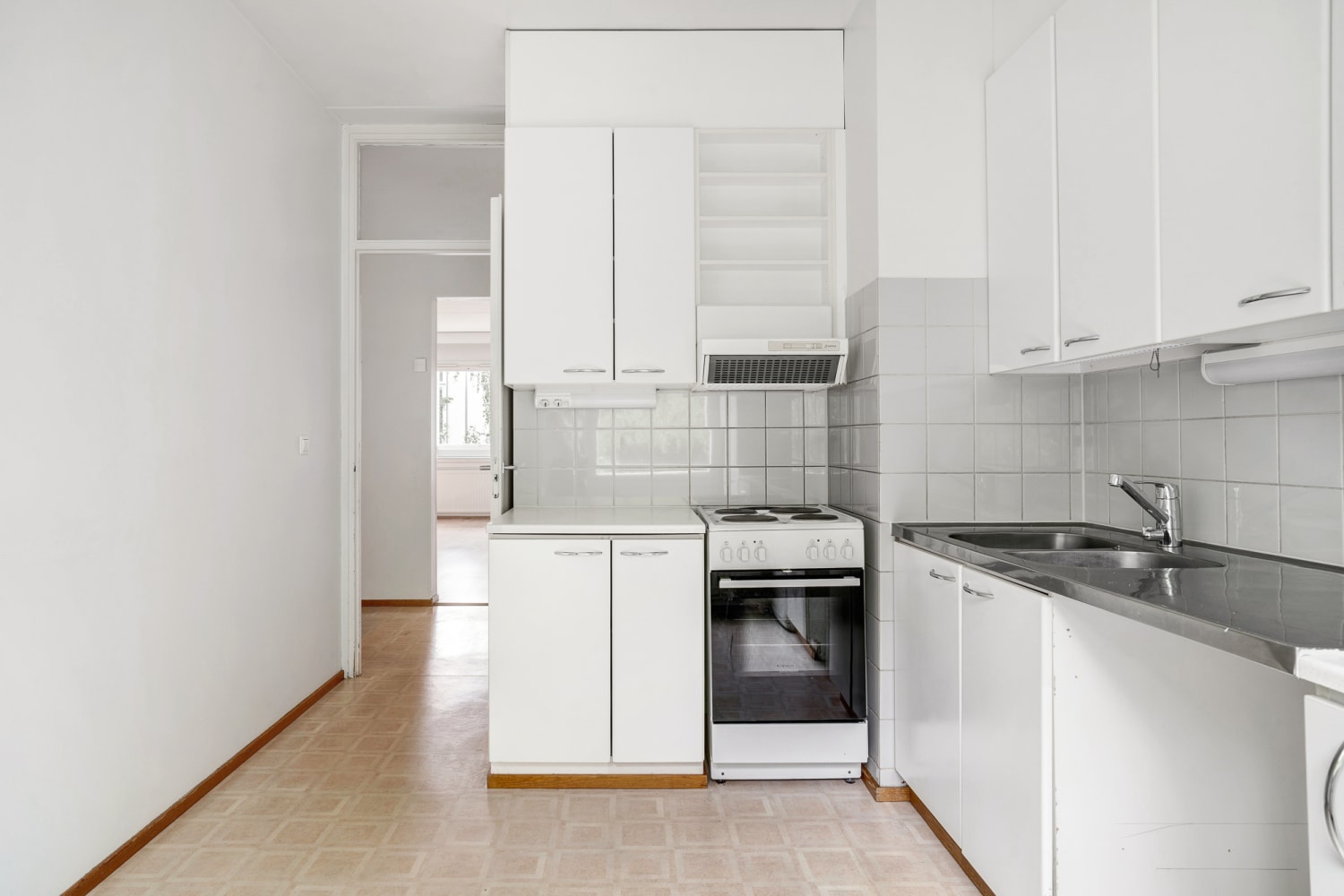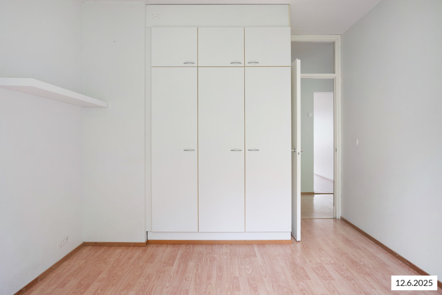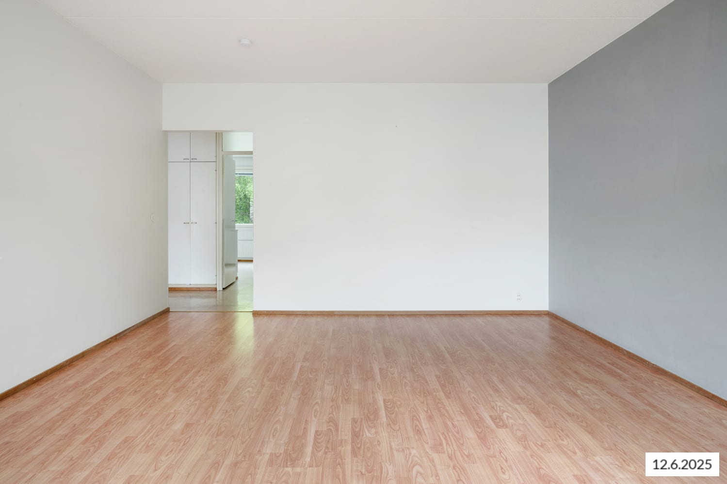 The layout of the spacious two-bedroom home is traditionally functional: you can access the balcony from the living room. There is ample storage space in the wardrobe located next to the entrance hall. In this through-apartment, there is a separate kitchen where you can fit a dining table by the window. The kitchen also has space for your dishwasher, and the bathroom accommodates a washing machine.