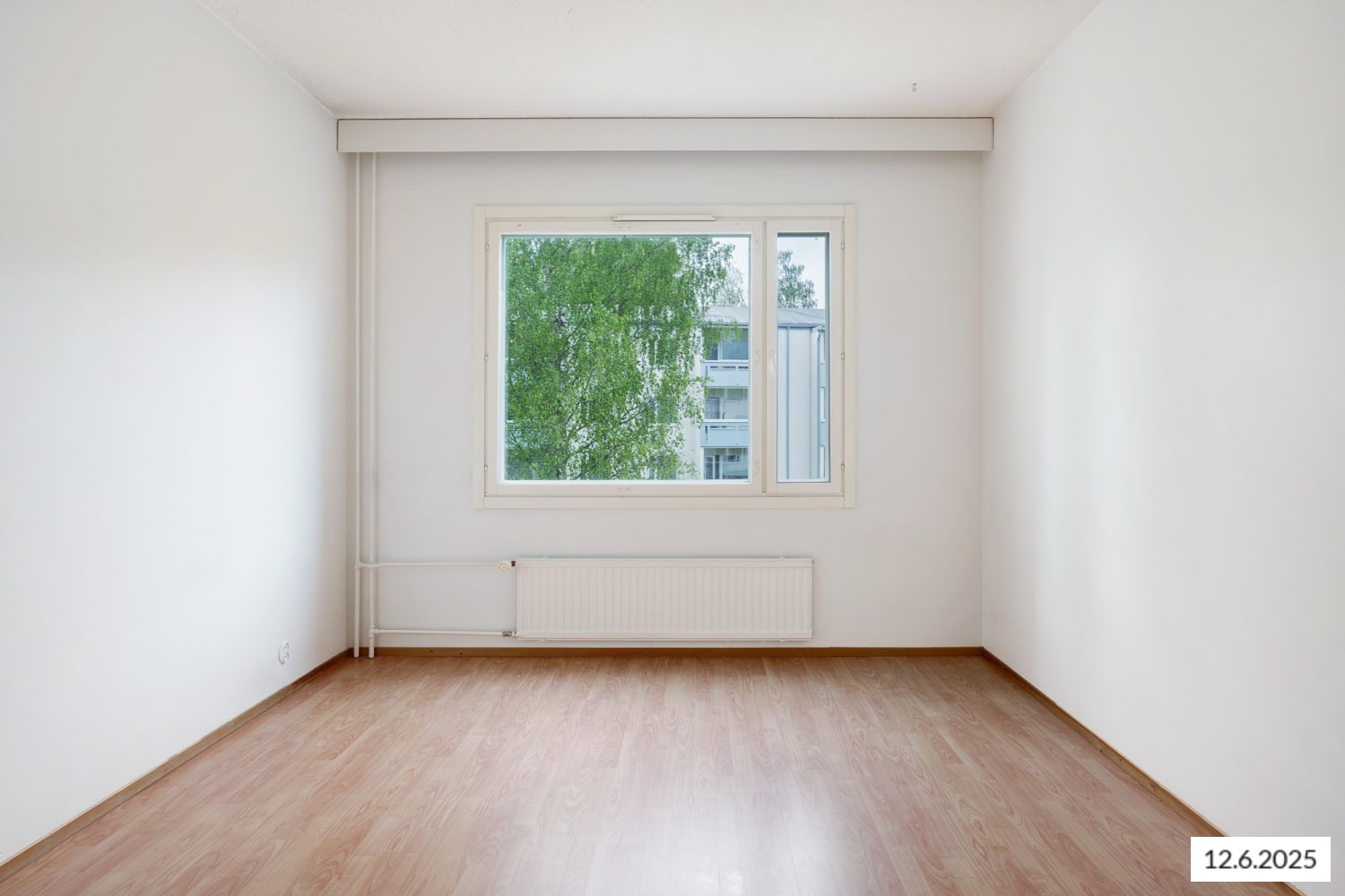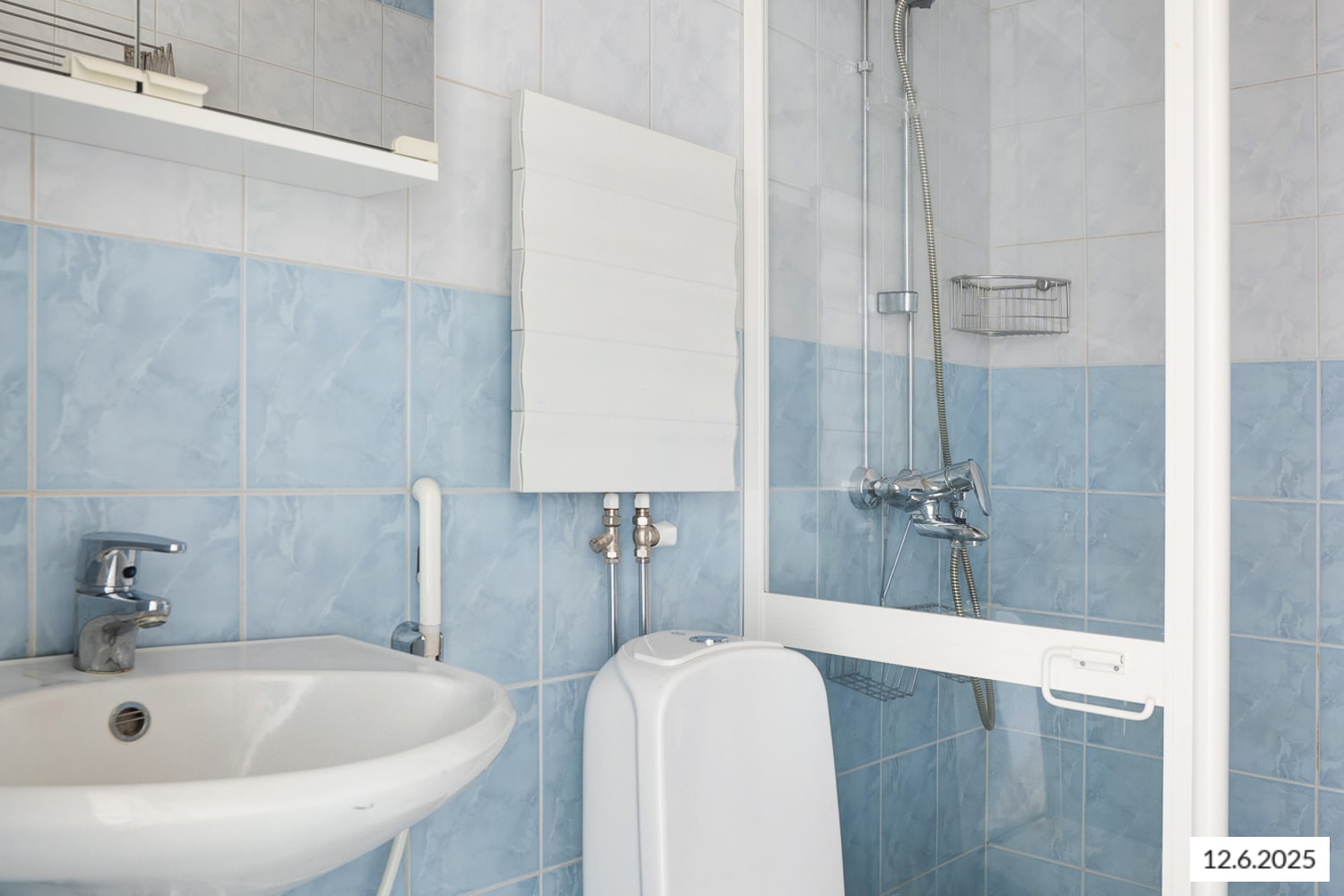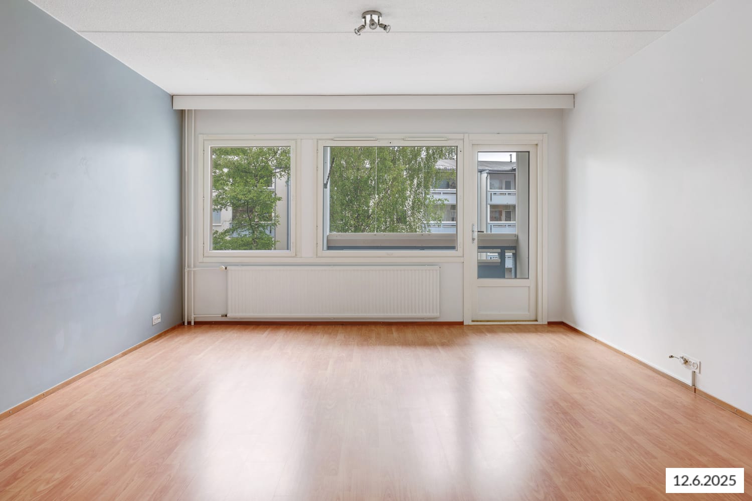 The layout of the spacious two-bedroom home is traditionally functional: you can access the balcony from the living room. There is ample storage space in the wardrobe located next to the entrance hall. In this through-apartment, there is a separate kitchen where you can fit a dining table by the window. The kitchen also has space for your dishwasher, and the bathroom accommodates a washing machine.
