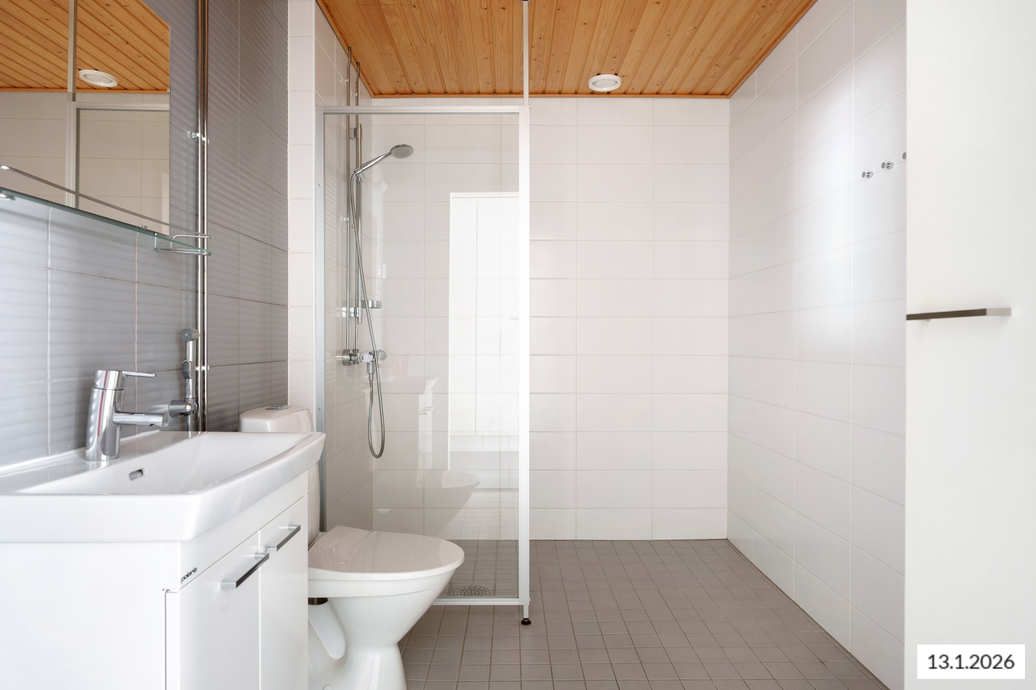 The bathroom walls are tiled with white tiles, and the floors feature grey tiles. The accent walls have subtle embossed grey tiles. There is space reserved for a washing machine and a tumble dryer.