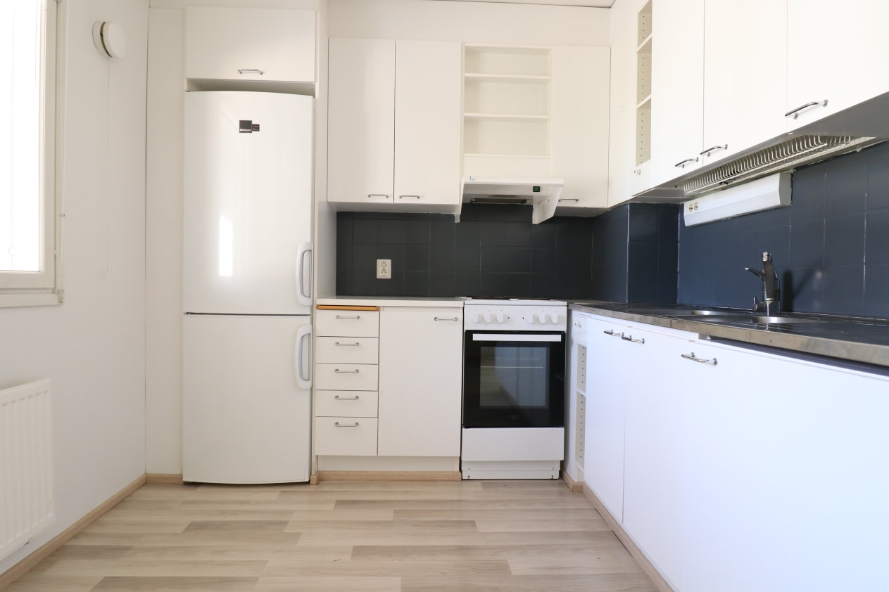 This charming low-rise apartment building is located on Marmorikatu, near Piispanristi, nestled among row houses and detached homes. The cosy, light-coloured one-bedroom home features a practical layout and a private sauna, perfect for cooling off on the apartment's balcony. The bedroom includes ample storage space with tall cupboards. The home has clean laminate flooring and painted walls.