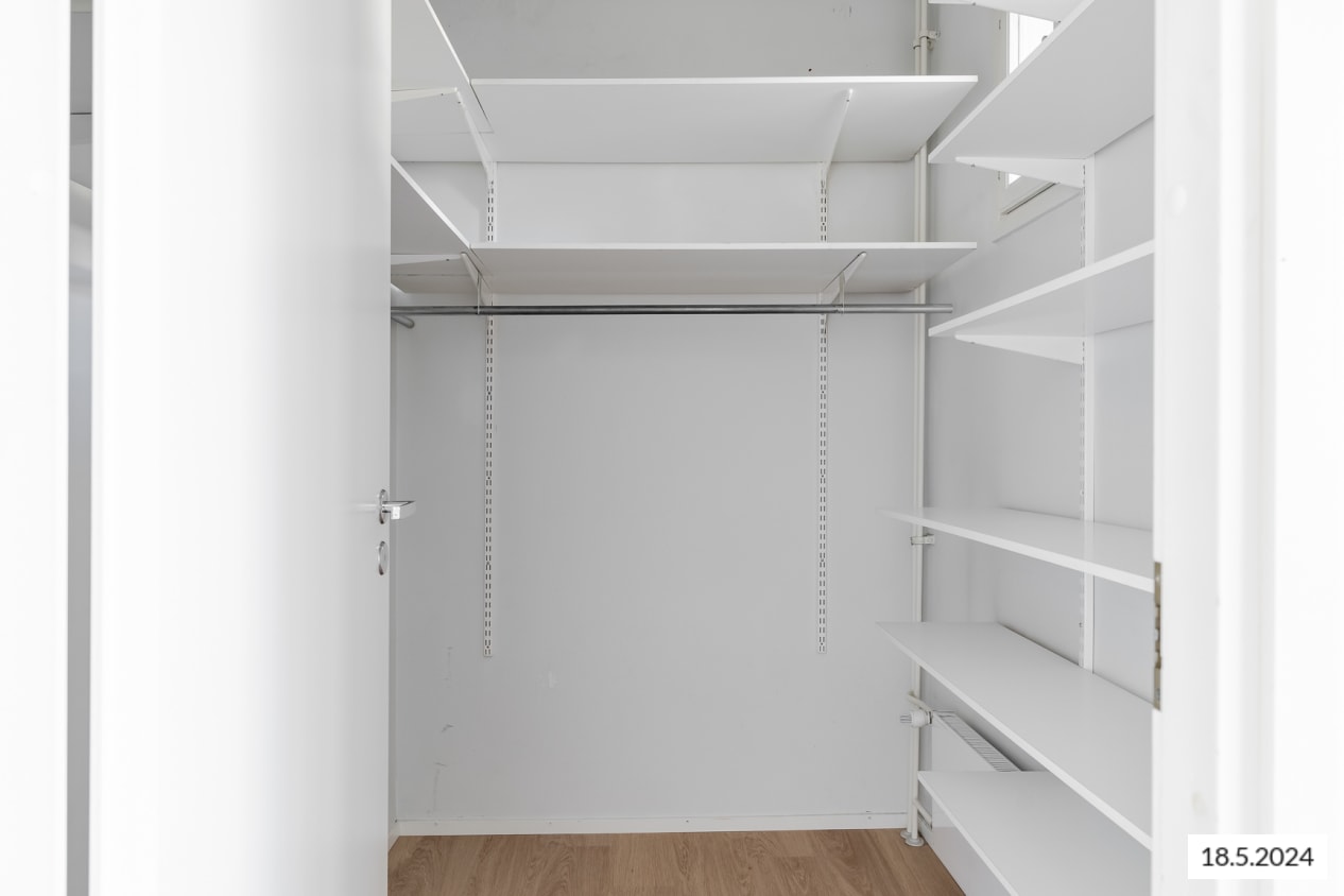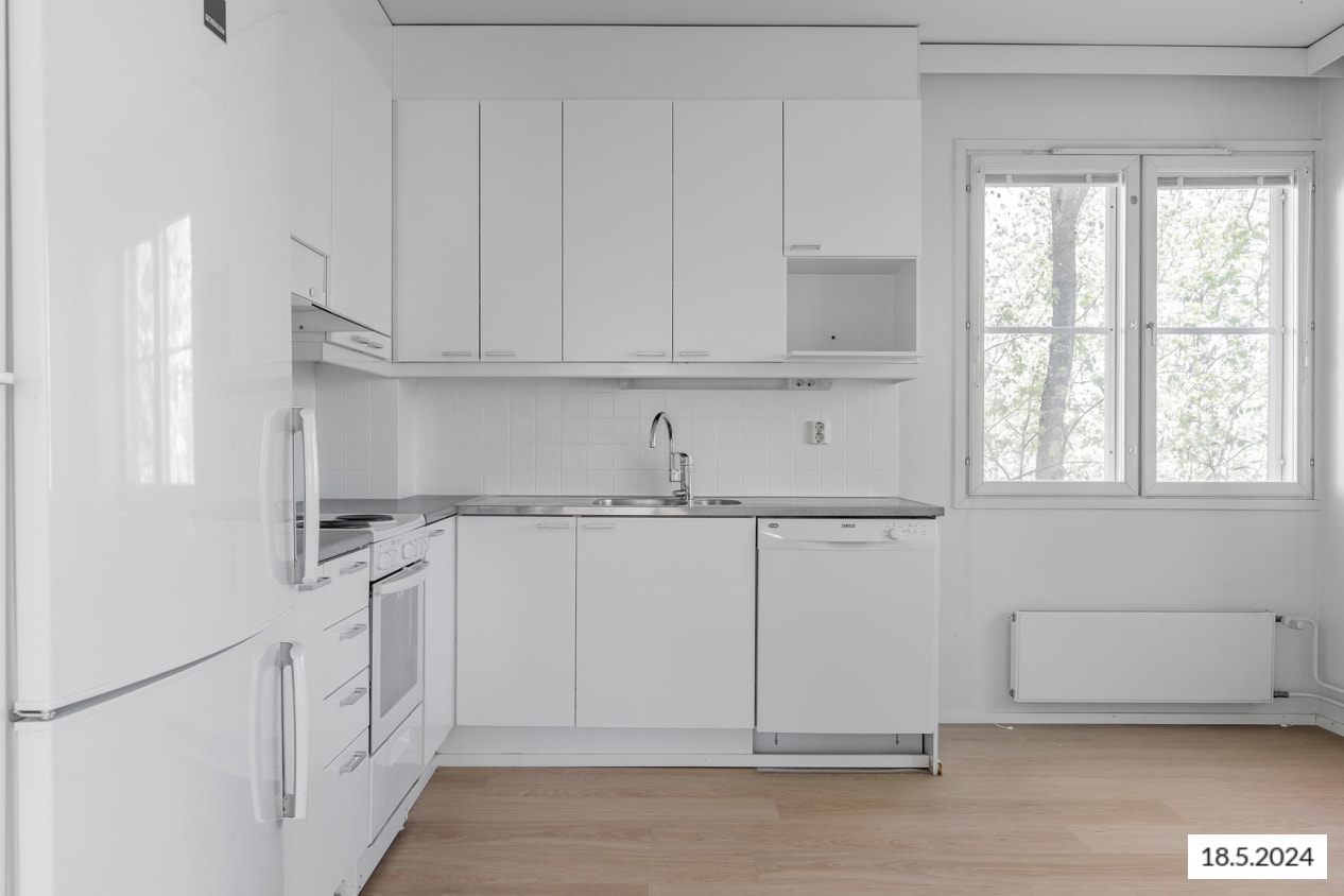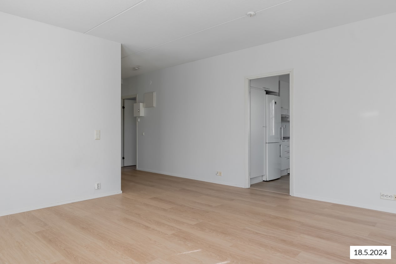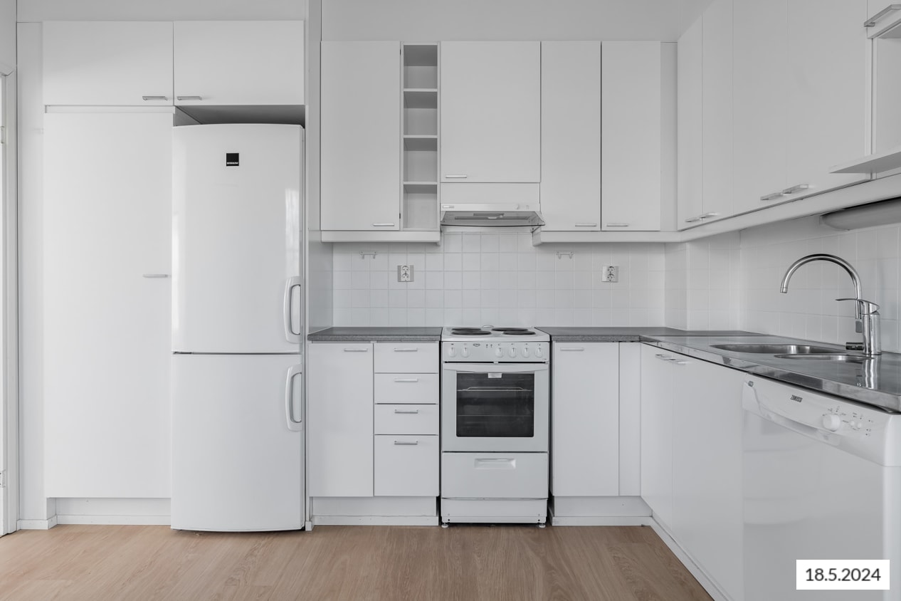 This bright one-bedroom apartment offers ample space and light-filled surroundings. Beautiful, light-toned surfaces ensure that the home is easy to decorate to your personal taste. The floors are oak-colored laminate, and the walls are painted. The bathroom, on the other hand, is stylishly tiled throughout. The kitchen cabinets and appliances are white, and the space between the upper and lower cabinets is tiled.