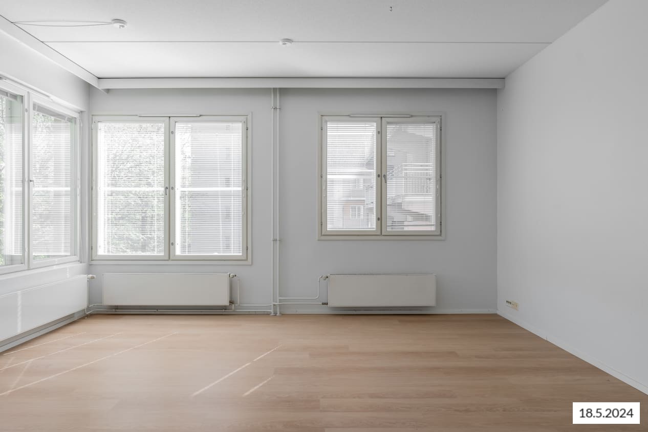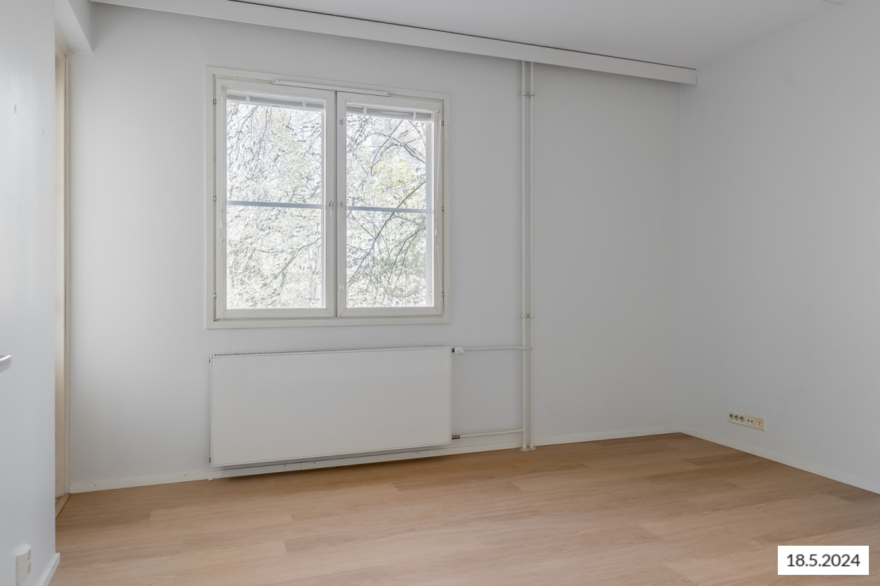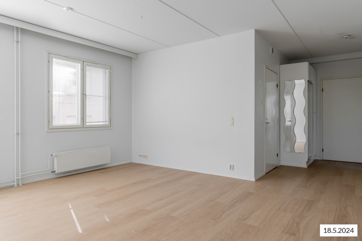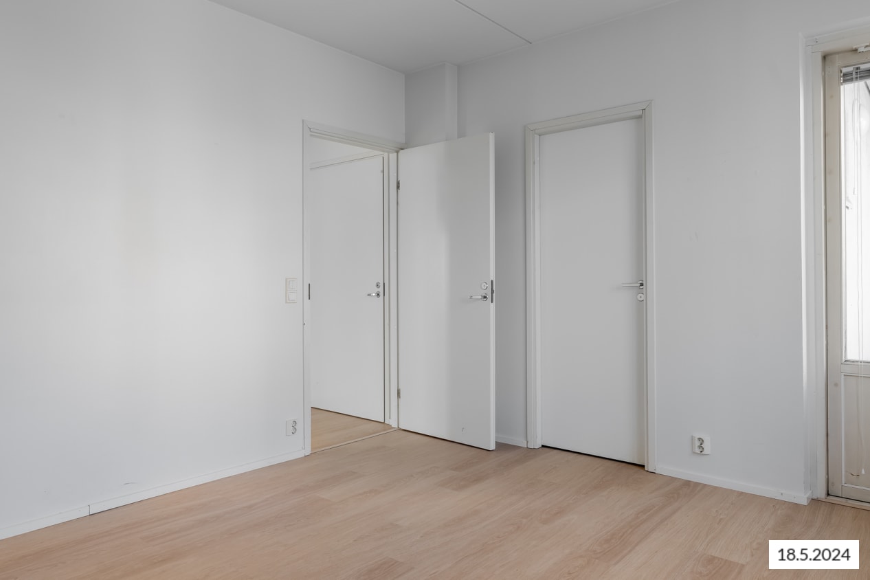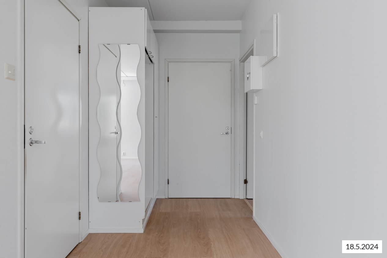 This bright one-bedroom apartment offers ample space and light-filled surroundings. Beautiful, light-toned surfaces ensure that the home is easy to decorate to your personal taste. The floors are oak-colored laminate, and the walls are painted. The bathroom, on the other hand, is stylishly tiled throughout. The kitchen cabinets and appliances are white, and the space between the upper and lower cabinets is tiled.