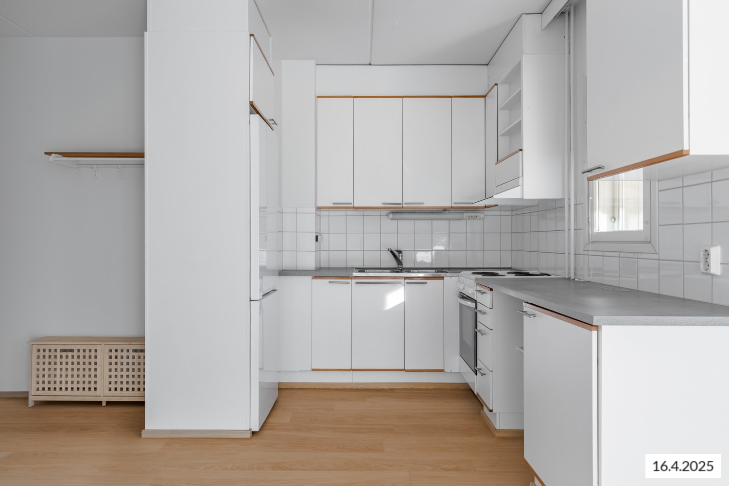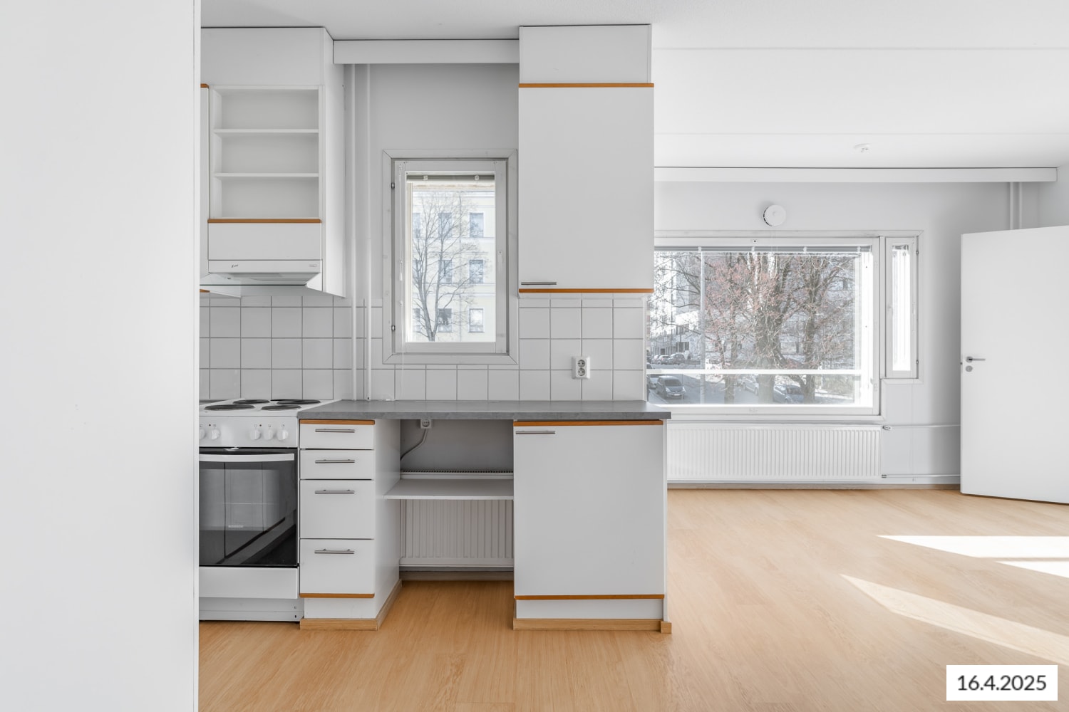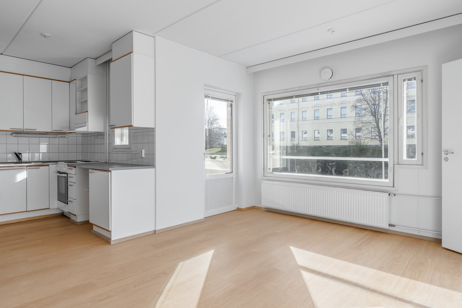 The kitchen, in light tones, includes a freezer-refrigerator and a traditional stove, with a view to the balcony while you cook. The bathroom is equipped with furniture from the Finnish Kide collection, designed for durability, and there are connections for a washing machine.