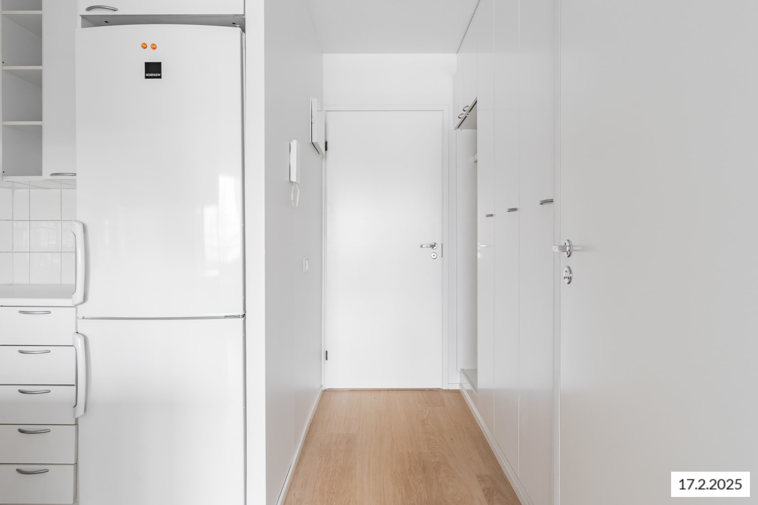 The apartment features neat wood laminate floors, and the walls are painted. The kitchen is equipped with a refrigerator, freezer, floor oven, and a traditional 4-burner stove.