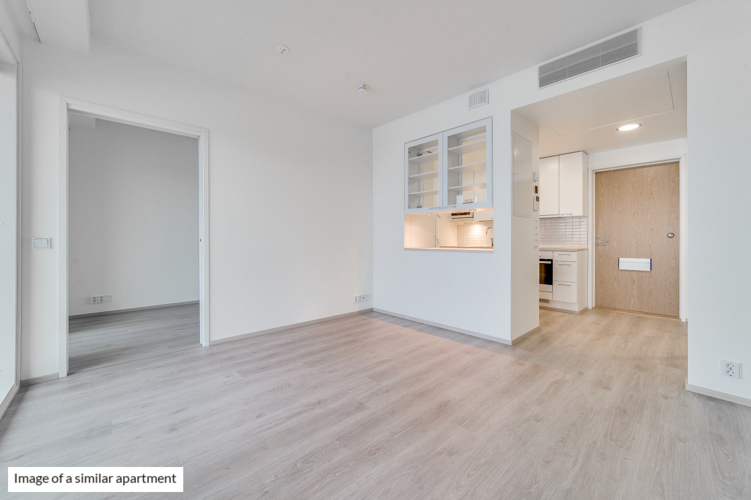 The flooring in the living areas is light grey laminate that mimics oak planks. The kitchen cabinet doors are crisp white, and the space between the upper and lower cabinets is tiled with white mosaic tiles. The countertop is laminate in a light oak shade. The kitchen is equipped with a ceramic hob and separate oven, microwave, dishwasher, and freezer-refrigerator.