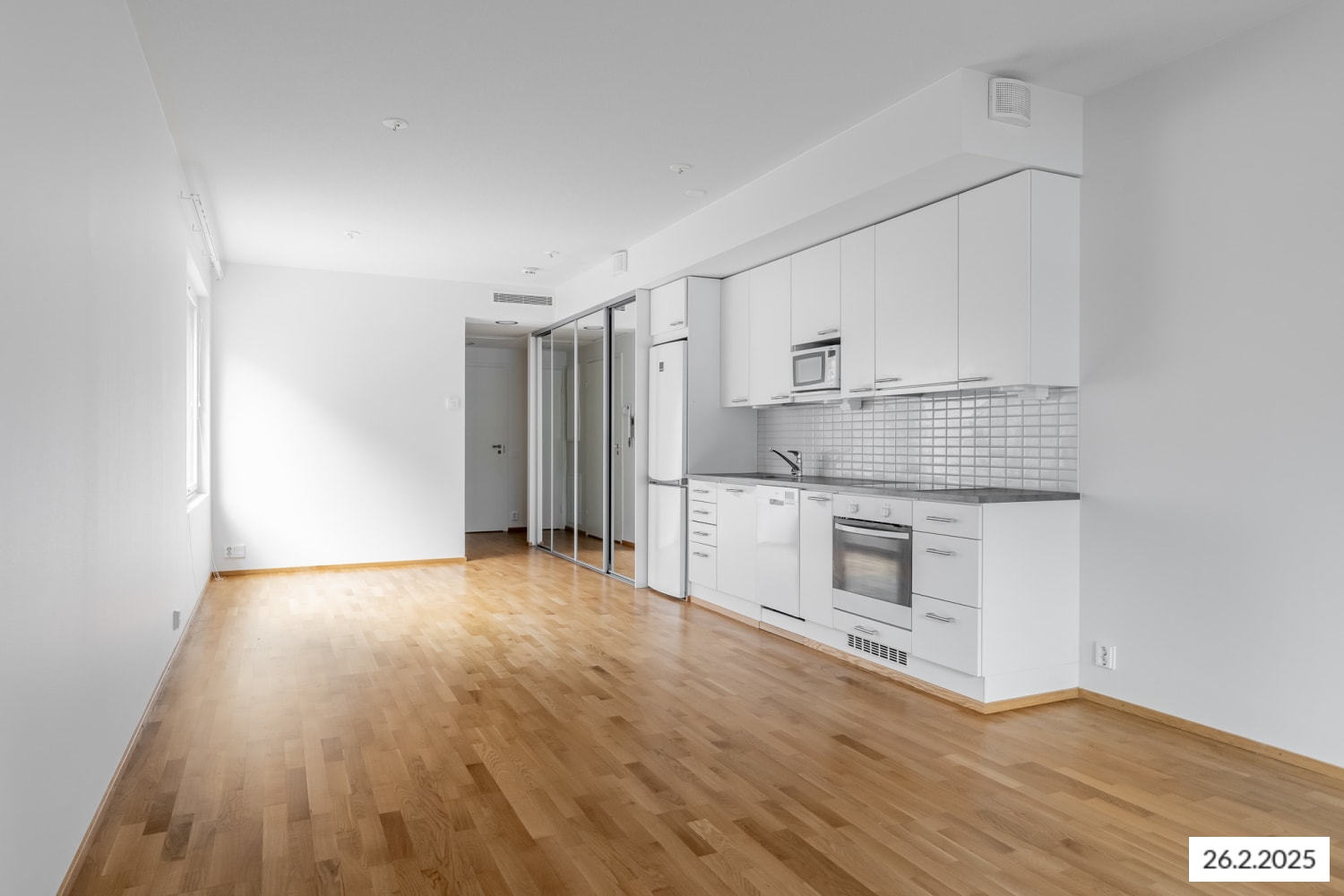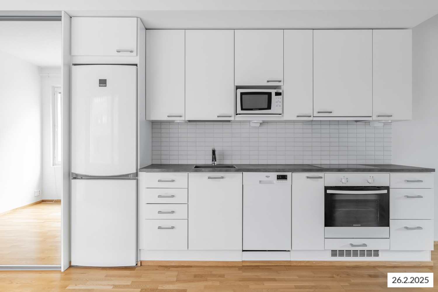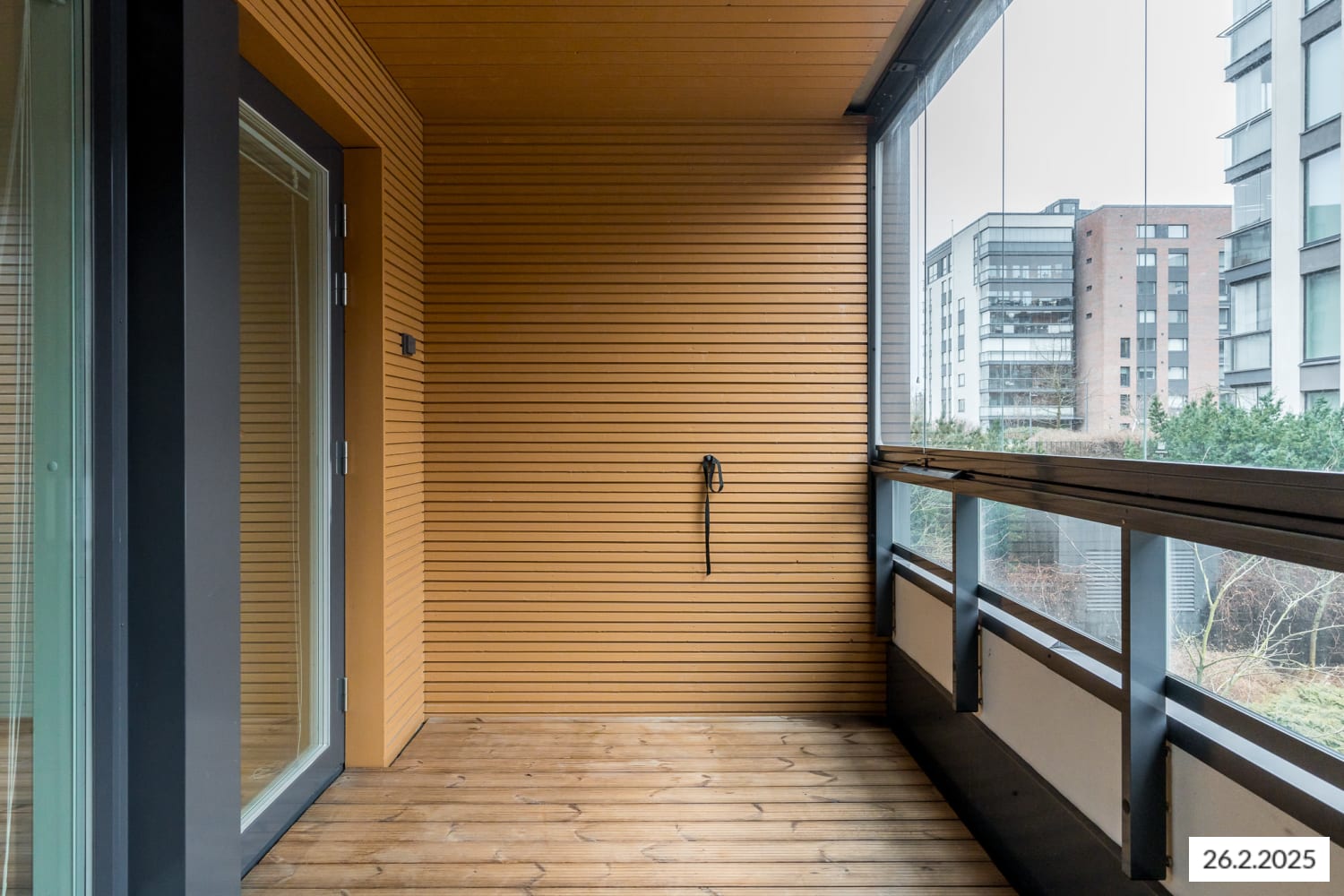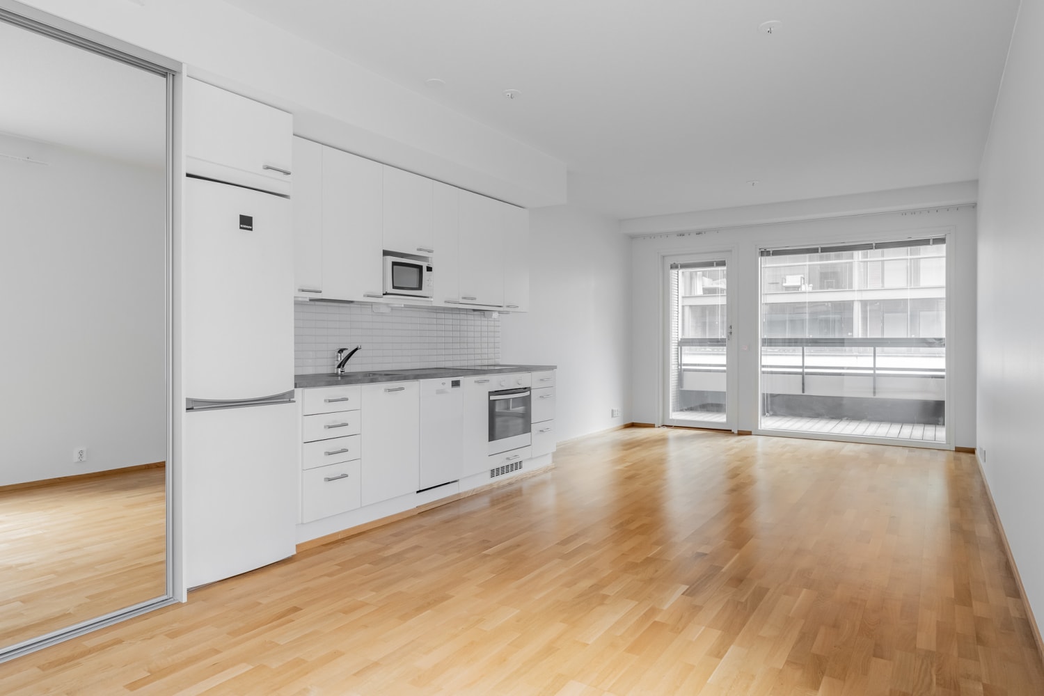 This eight-storey building on the Kupittaanpuisto block has thirty attractive rental homes, both studios and one-bedrooms, as well as owner-occupied homes. The homes have glassed-in balconies with clear-glass railings, for lots of natural light, and wood floor grates. The kitchens feature white cabinetry and laminate countertops and are equipped with a ceramic cooktop, separate oven, microwave, dishwasher and fridge-freezer. All appliances are white. The bathrooms have space for a washing machine and dryer. The units have underfloor heating and individual forced air ventilation system with separate cooling unit.