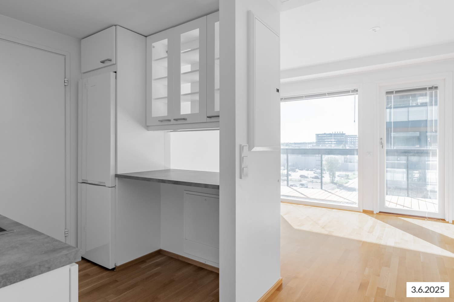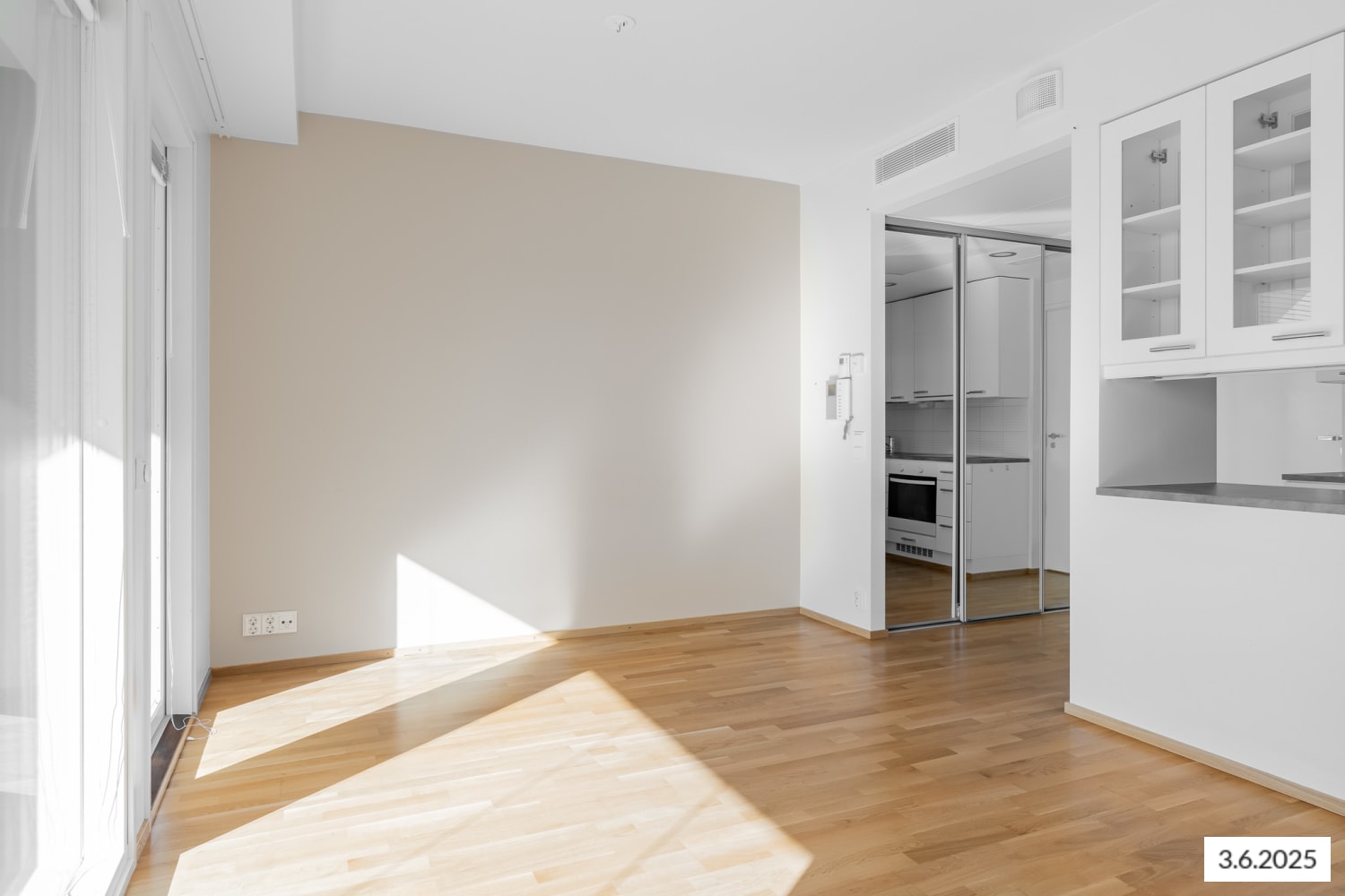 The focal point of this compact one-bedroom home is the bright living area, which connects to the kitchen. Additional living space is available on the generously sized glazed balcony with clear glass railings and wooden grates on the floor. The hallway and bedroom offer storage space with a wardrobe featuring mirrored sliding doors. The flooring in the living areas is oak-toned plank parquet.