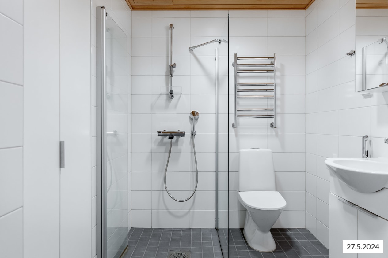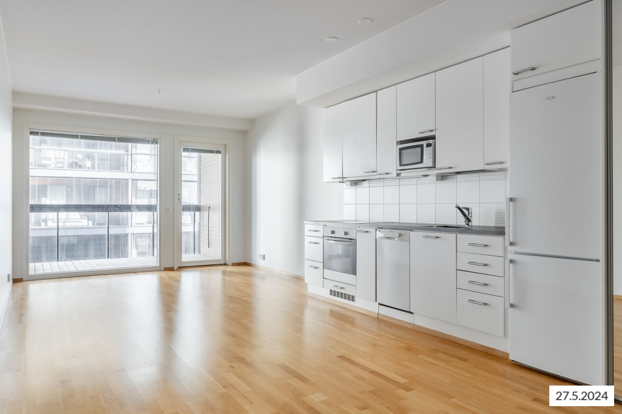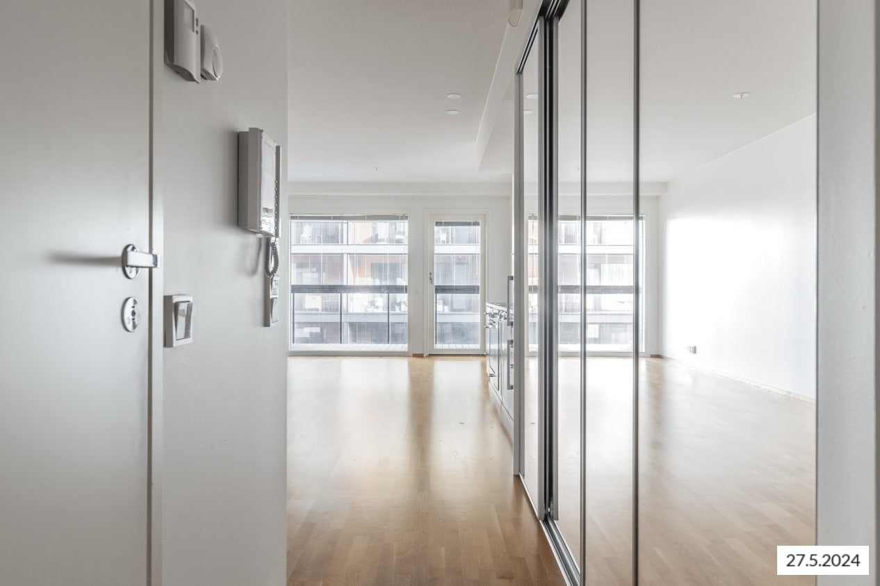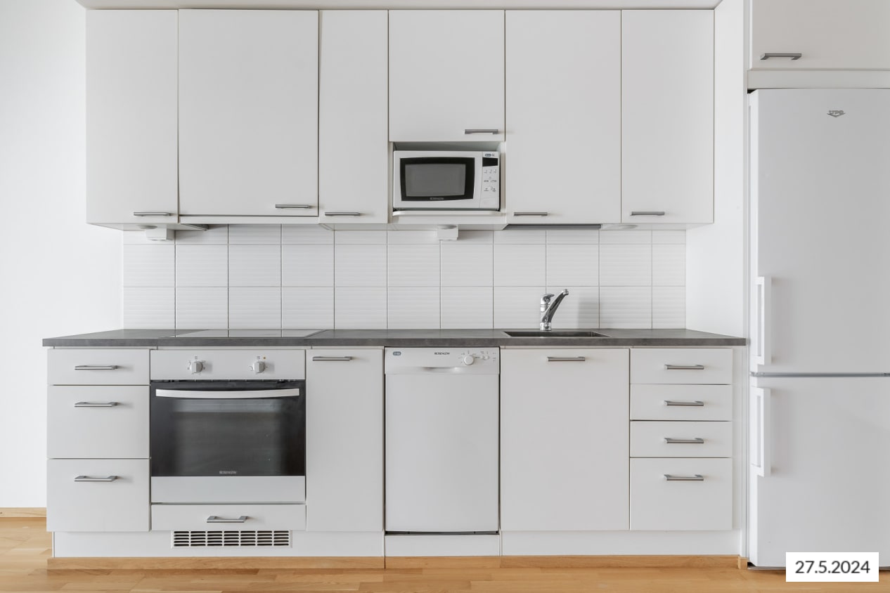 This eight-storey building on the Kupittaanpuisto block has thirty attractive rental homes, both studios and one-bedrooms, as well as owner-occupied homes. The homes have glassed-in balconies with clear-glass railings, for lots of natural light, and wood floor grates. The kitchens feature white cabinetry and laminate countertops and are equipped with a ceramic cooktop, separate oven, microwave, dishwasher and fridge-freezer. All appliances are white. The bathrooms have space for a washing machine and dryer. The units have underfloor heating and individual forced air ventilation system with separate cooling unit.
