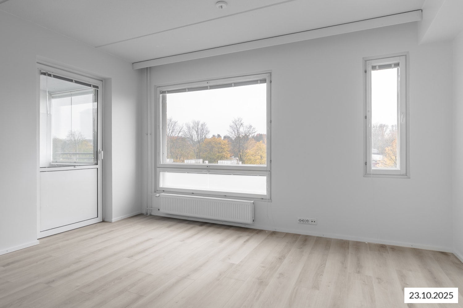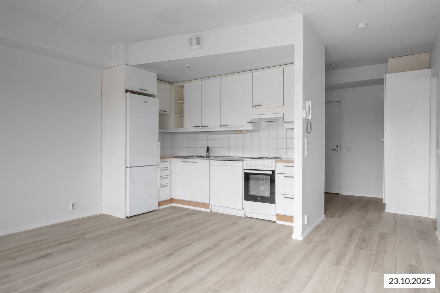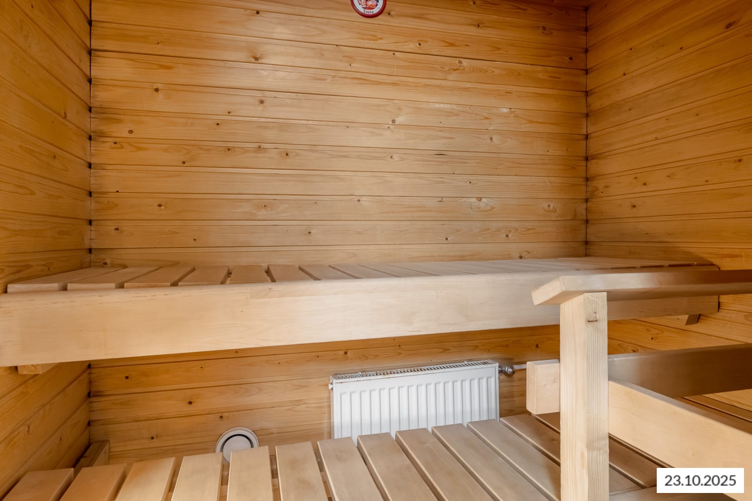 The light-coloured kitchen is equipped with a freezer-refrigerator, cooker and dishwasher. The bathroom features domestic Kide collection furniture and includes space for a washing machine. Enjoy relaxing in the sauna at your convenience, and cool down on your own balcony, which offers expansive views.