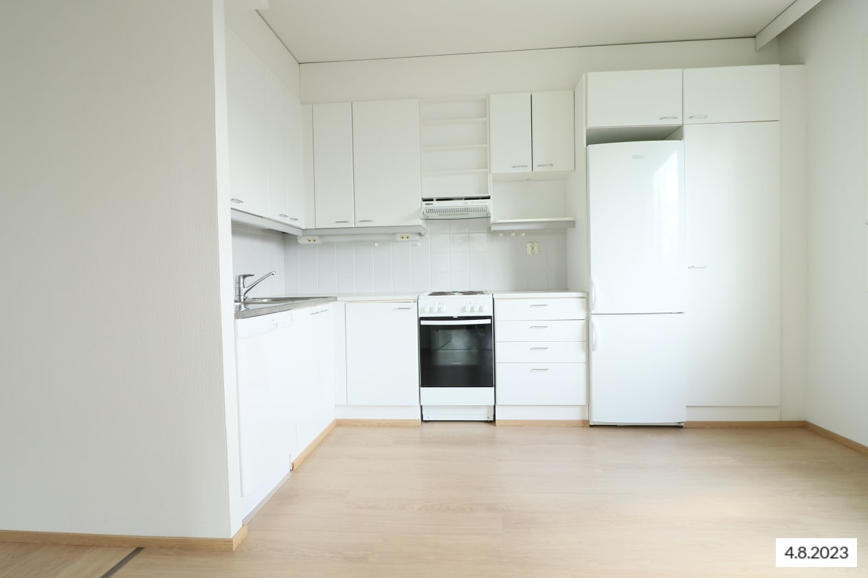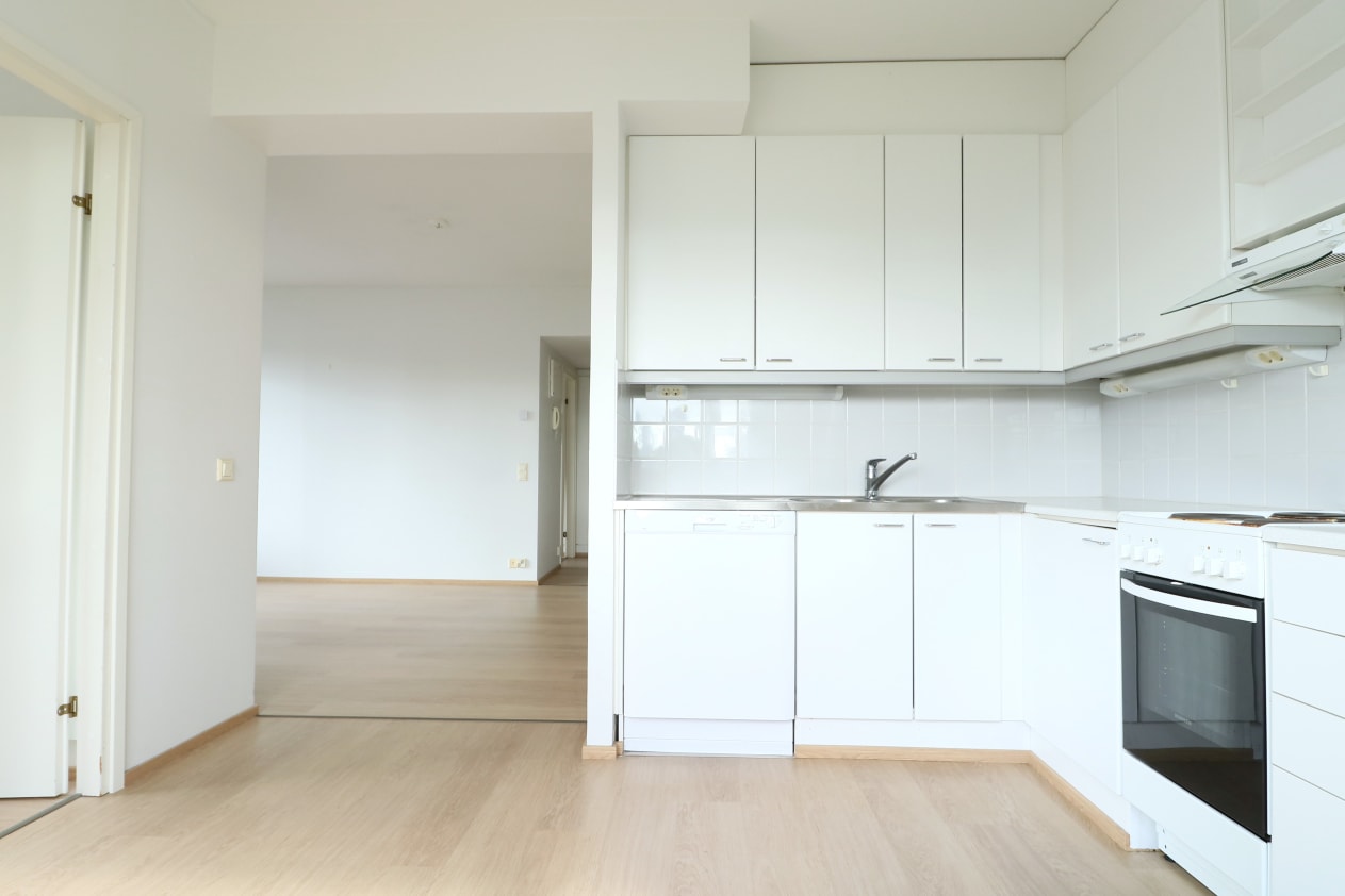 The living areas feature laminate flooring and the walls are painted white. The separate kitchen accommodates a dining table by the window. The kitchen cabinets are white, with a white tiled backsplash. It is equipped with a dishwasher, cooker and freezer-refrigerator.