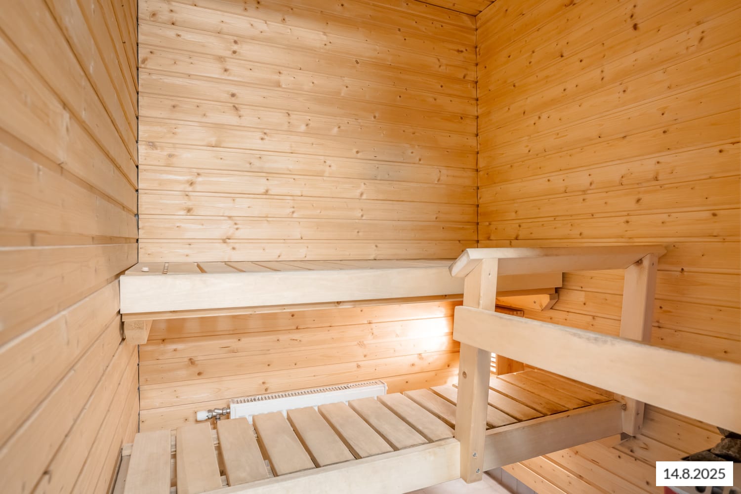 The bathroom leads to your own sauna, allowing you to relax whenever it suits you best. There is also space for a washing machine.