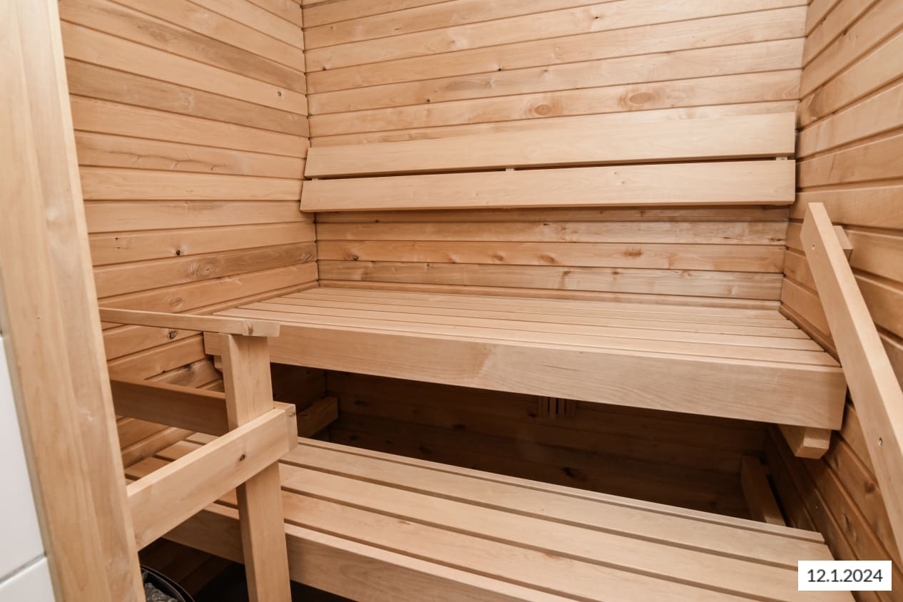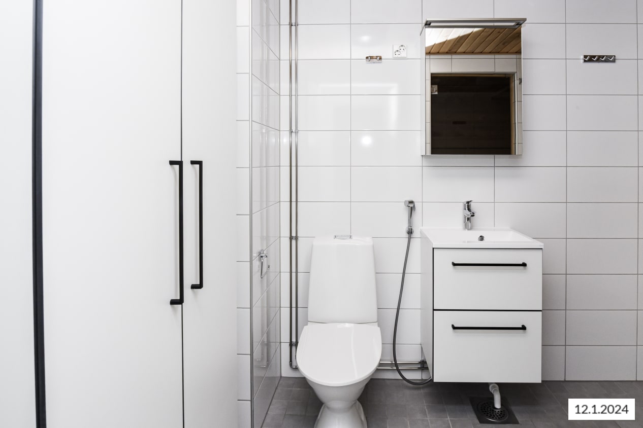 The fresh bathroom has room for relaxation and is combined with your own private sauna you can heat to just the right temperature. The white-tiled walls and grey-tiled floor create a stylish space. The durable Kide range bathroom furniture is white and made in Finland. There are also hookups and space for a washing machine and a dryer. There is also another, separate toilet for added everyday convenience.