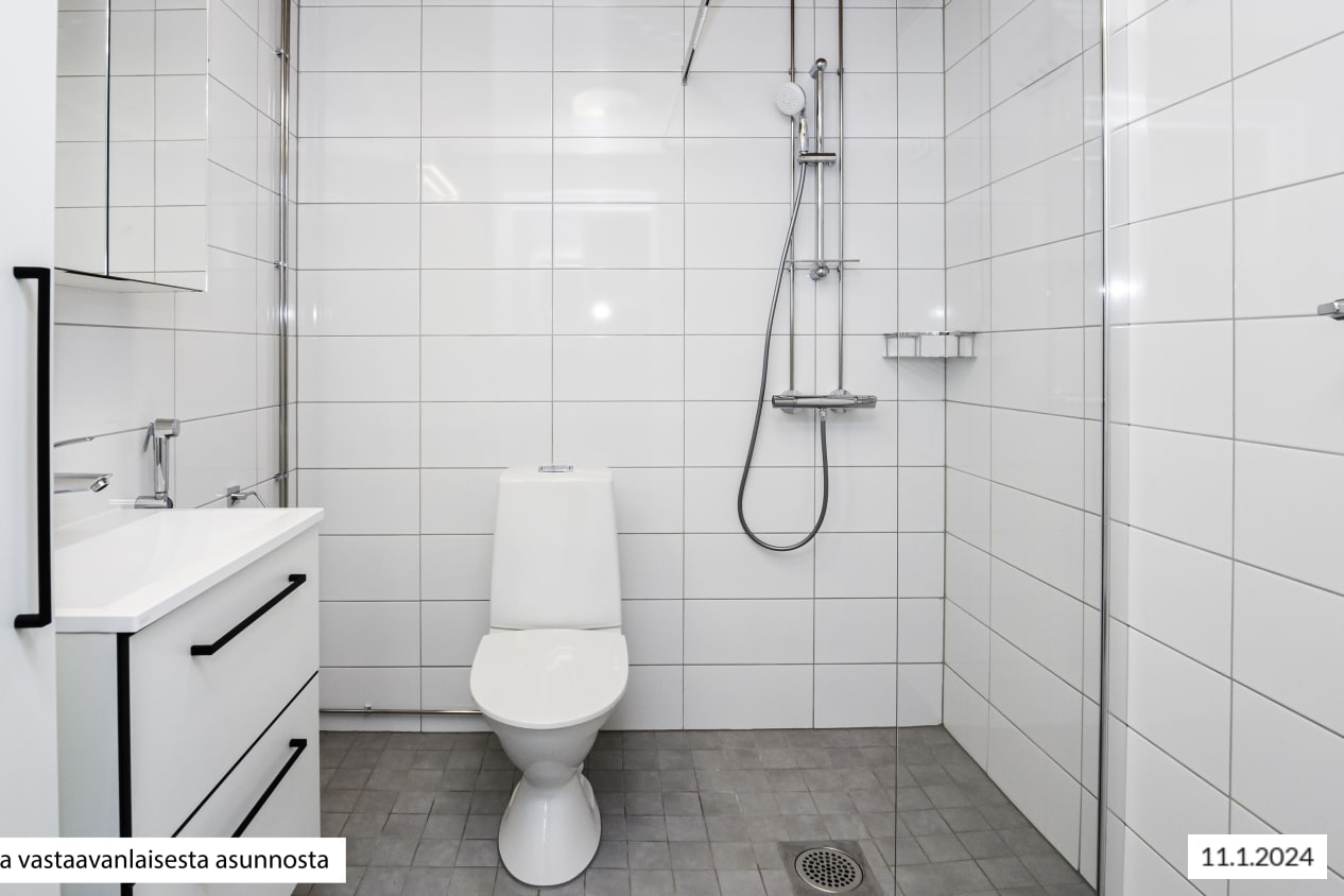 The fresh bathroom has room for relaxation and enjoying your spa moments at home. The white-tiled walls and grey-tiled floor create a stylish space. The durable Kide range bathroom furniture is white and made in Finland. There are also hookups and space for a washing machine and a dryer.