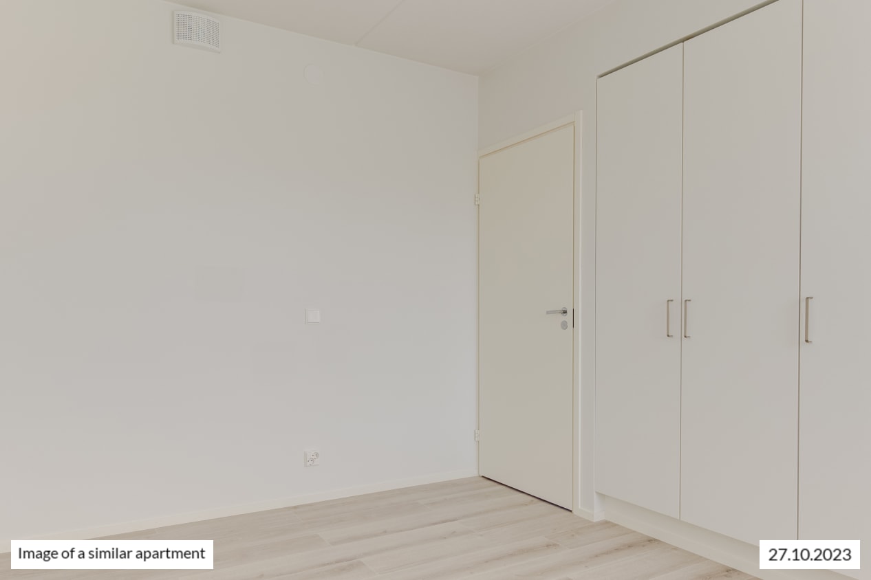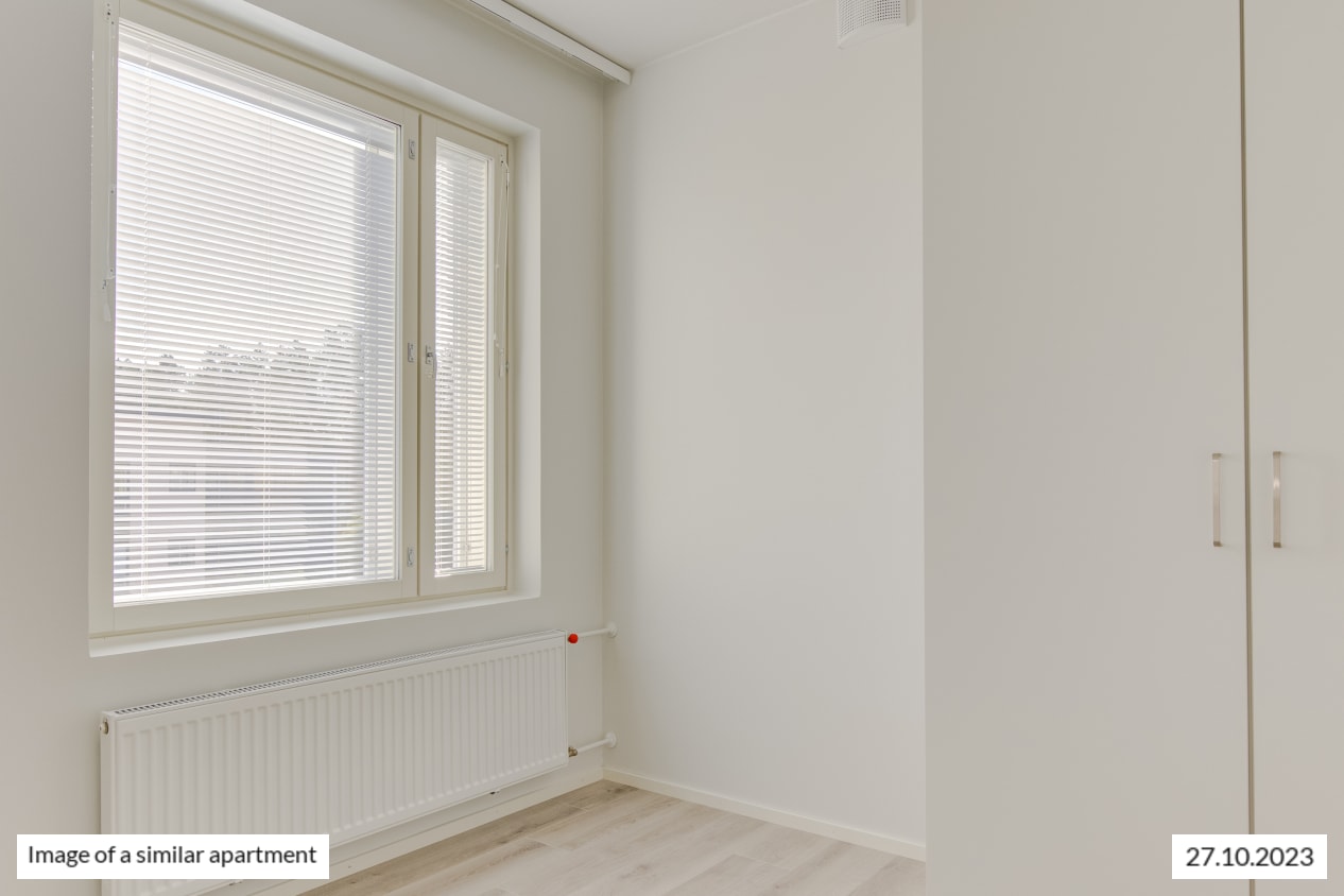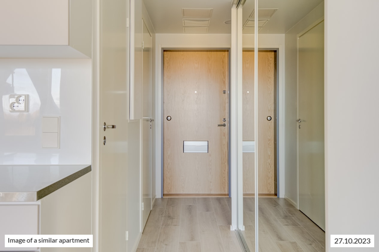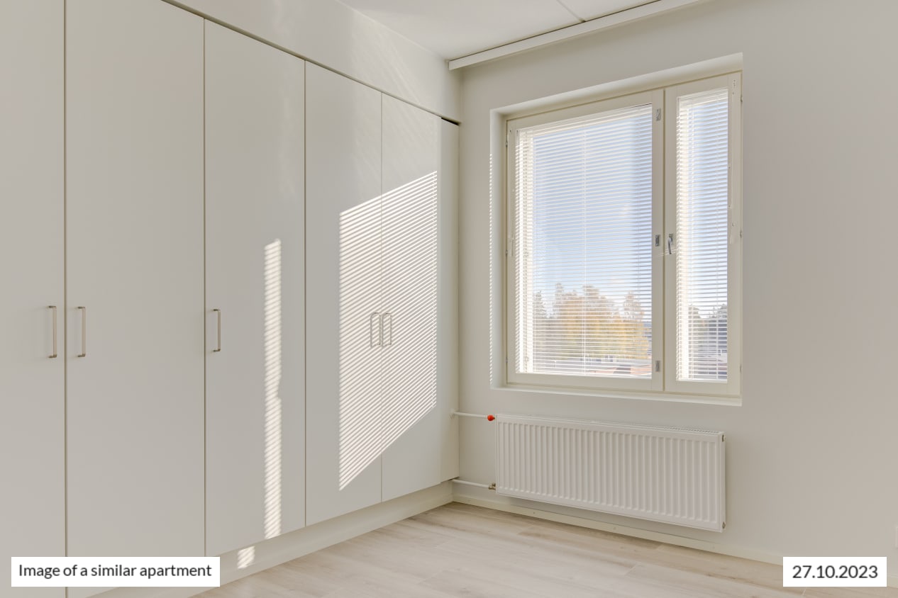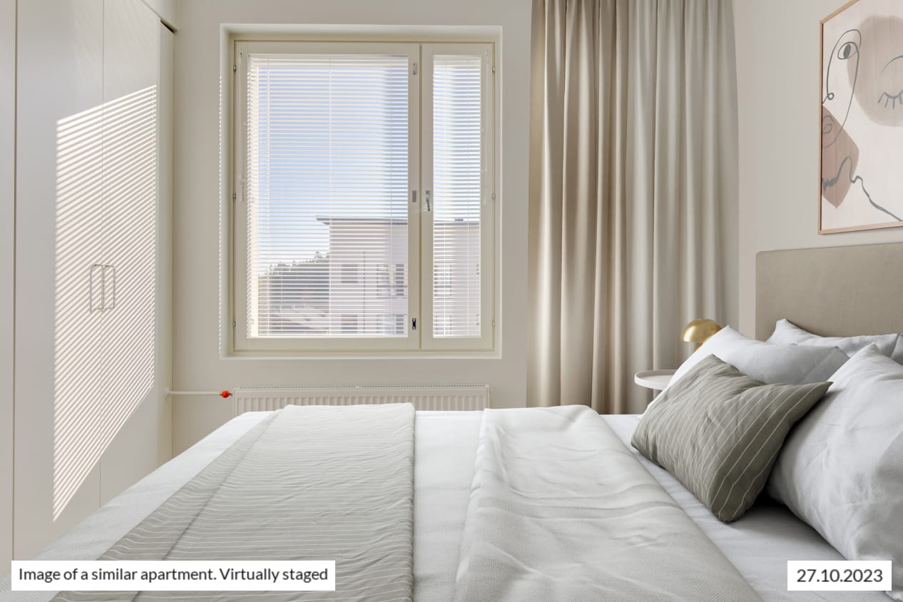 This light-filled corner apartment with two bedrooms has a harmonious colour scheme that provides a neutral backdrop for your personal style. There is storage space for clothes in the entrance hallway as well as in both of the bedrooms. The glassed-in southeast-facing balcony overlooks the courtyard forest area, while the windows on the other side face southwest over the grounds between the building.