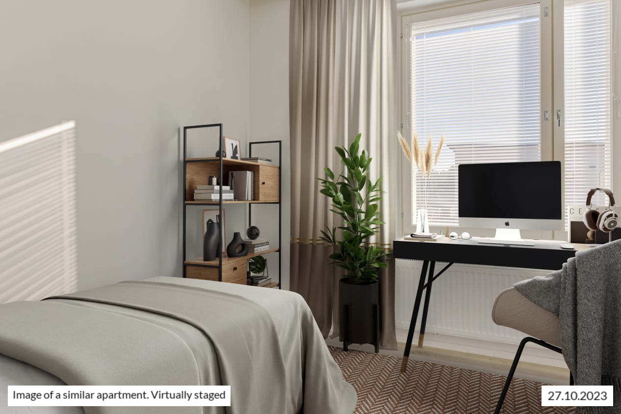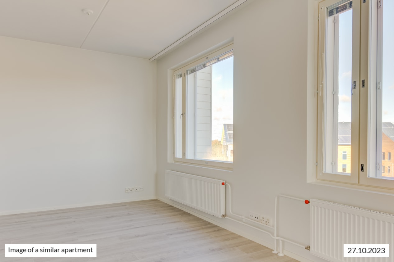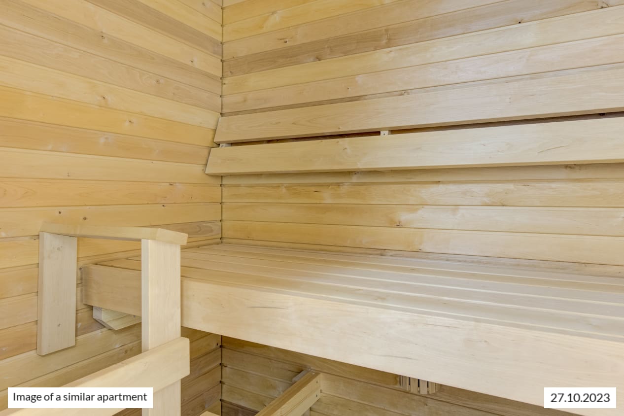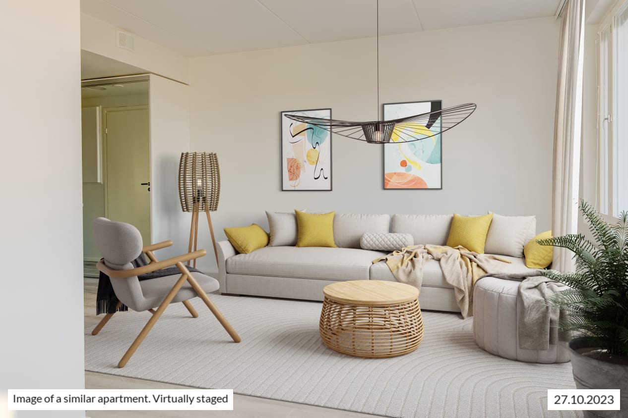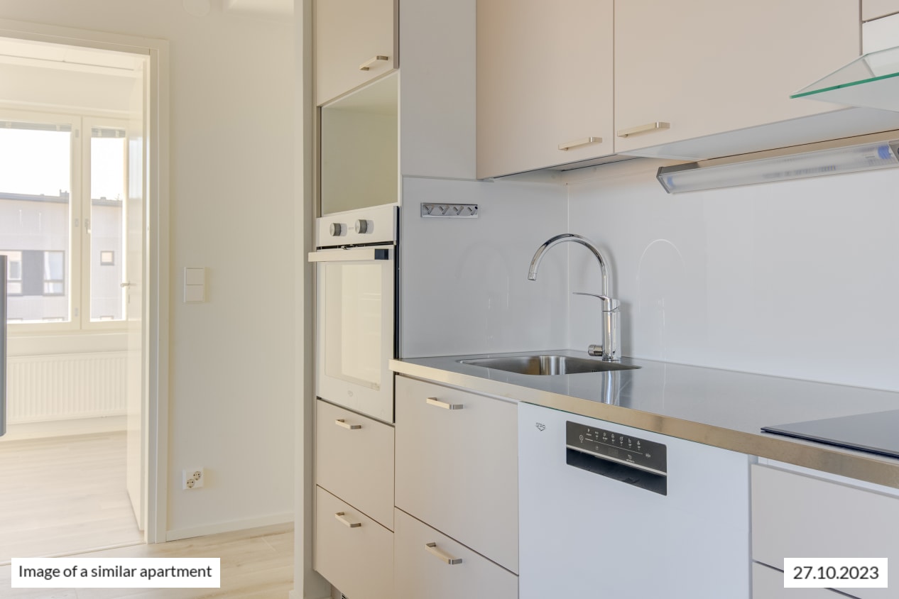 This light-filled corner apartment with two bedrooms has a harmonious colour scheme that provides a neutral backdrop for your personal style. There is storage space for clothes in the entrance hallway as well as in both of the bedrooms. The glassed-in southeast-facing balcony overlooks the courtyard forest area, while the windows on the other side face southwest over the grounds between the building.