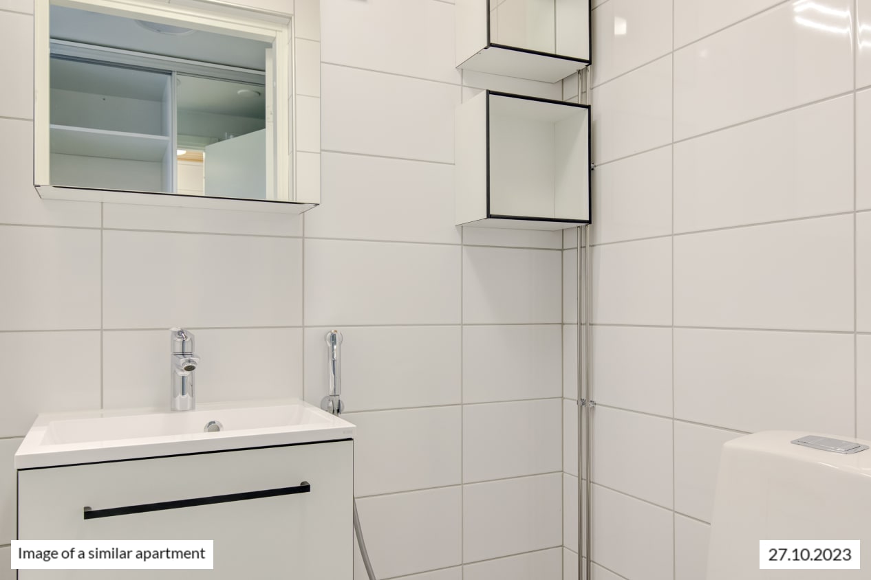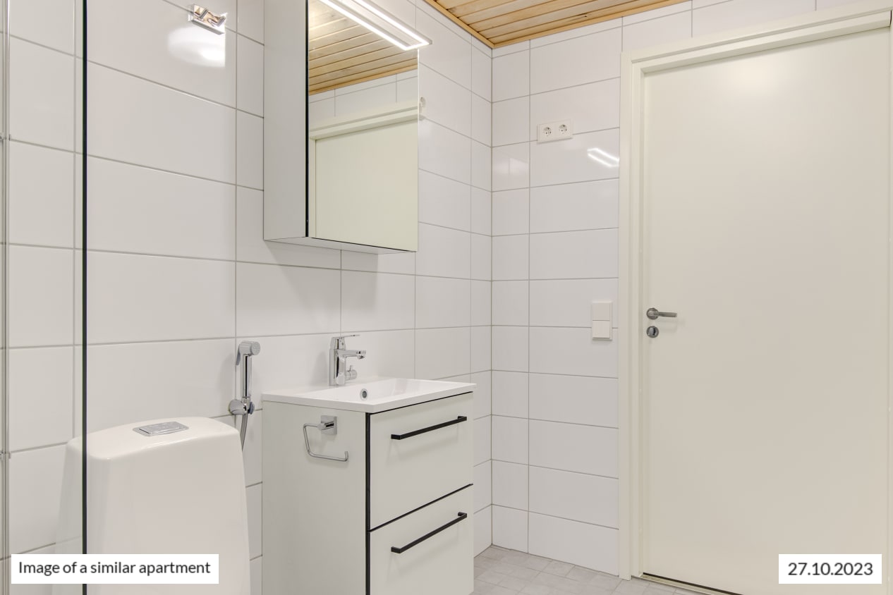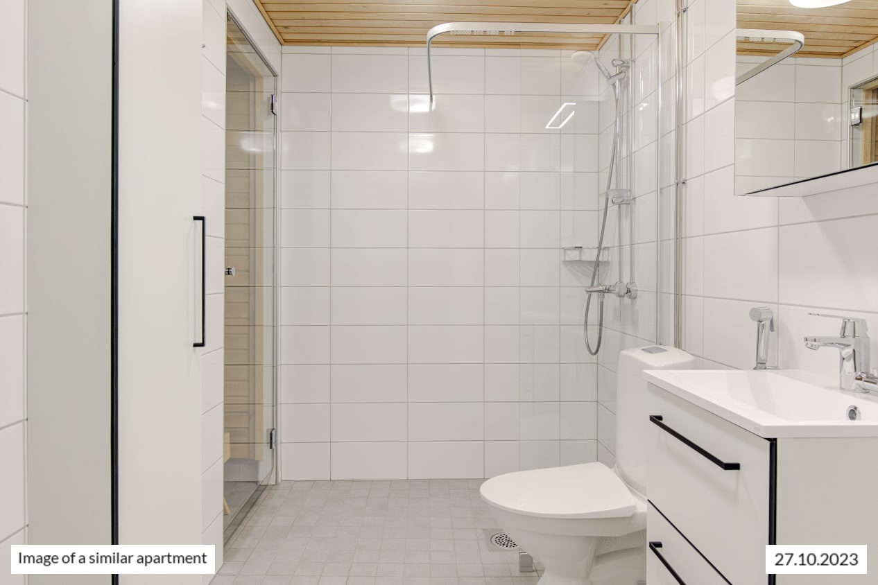 The fresh bathroom has room for relaxation and enjoying your spa moments at home. The white-tiled walls and grey-tiled floor create a stylish space. The durable Kide range bathroom furniture is white and made in Finland. There are also hookups and space for a washing machine and a dryer.