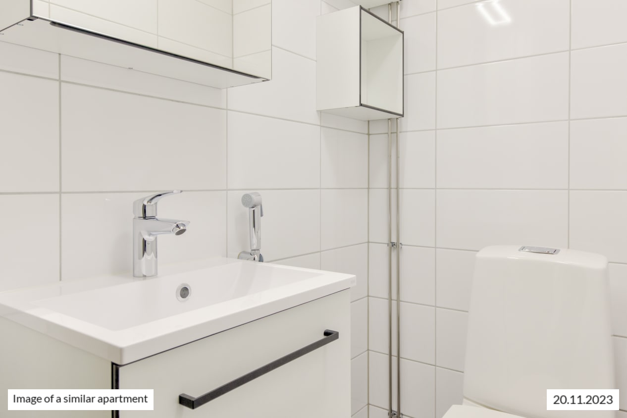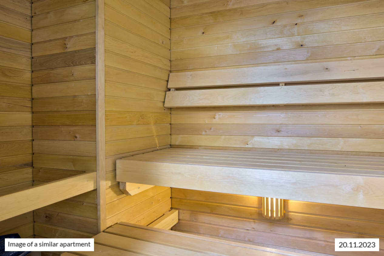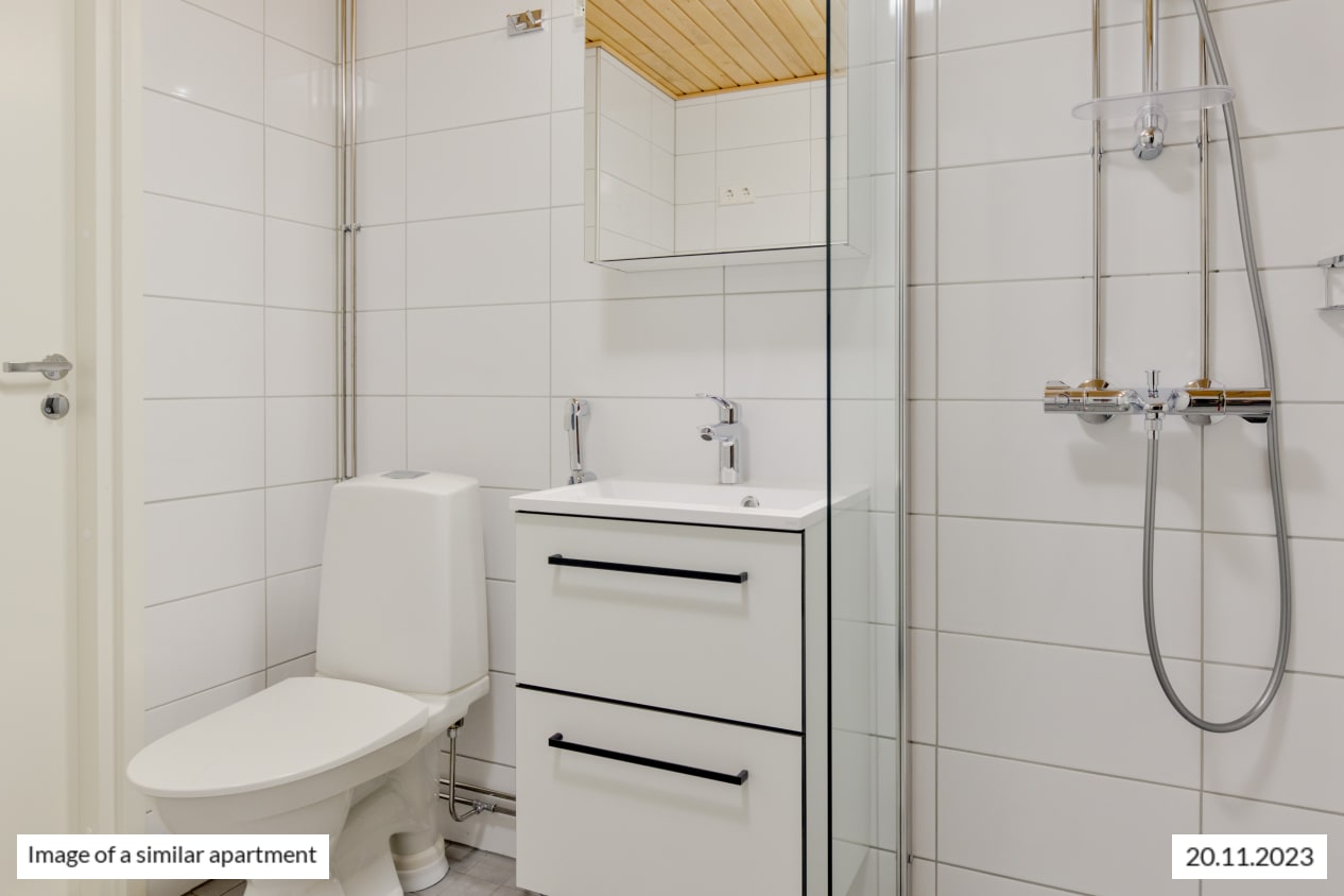 The fresh bathroom has room for relaxation and is combined with your own private sauna. The white-tiled walls and grey-tiled floor create a stylish space. The durable Kide range bathroom furniture is white and made in Finland. There are also hookups and space for a washing machine and a dryer.
