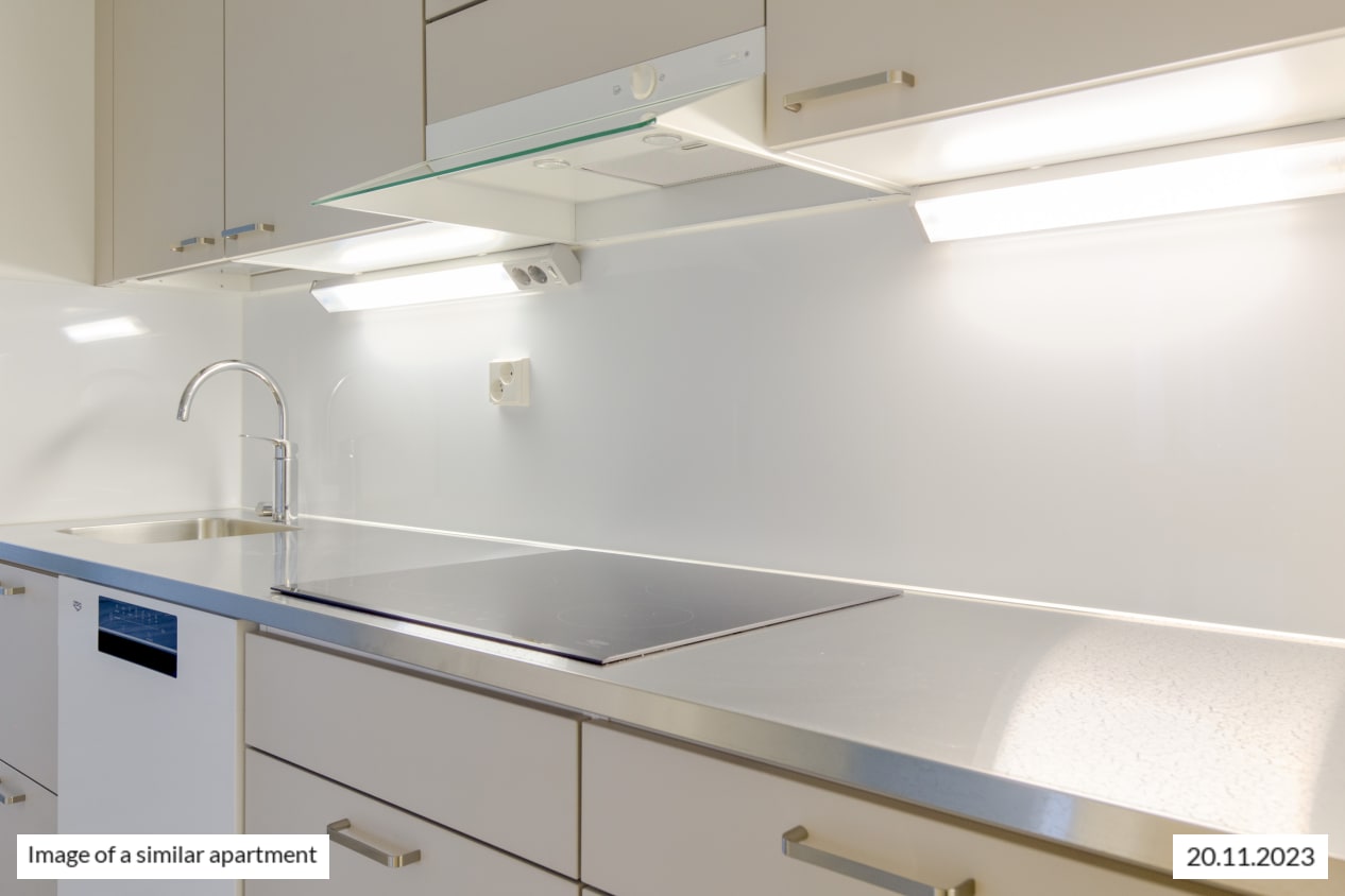 This light-filled corner apartment with three bedrooms has a harmonious colour scheme that provides a neutral backdrop for your personal style. There is storage space for clothes in the entrance hallway as well as in all of the bedrooms. The glassed-in balcony and the apartment windows face two different directions overlooking the Rykmentinpuisto area and the grounds between the buildings.