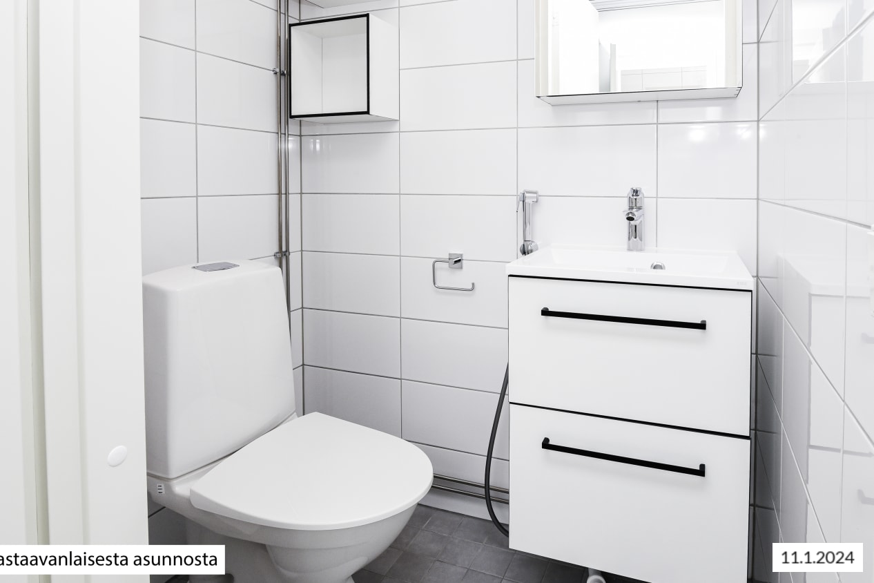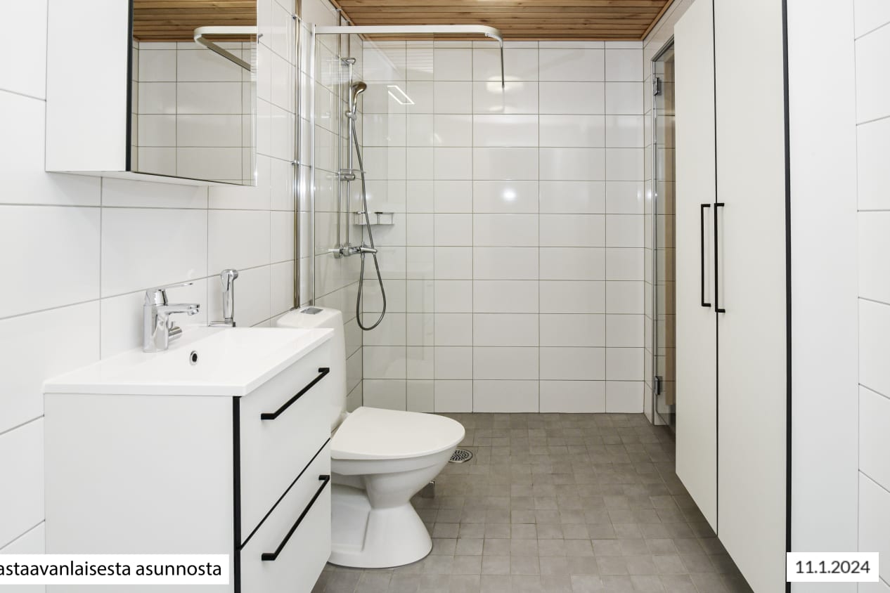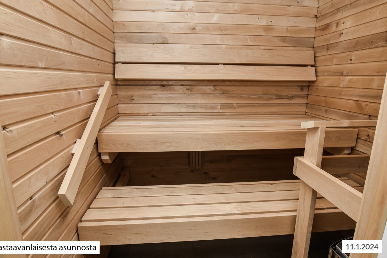 The fresh bathroom has room for relaxation and is combined with your own private sauna you can heat to just the right temperature. The white-tiled walls and grey-tiled floor create a stylish space. The durable Kide range bathroom furniture is white and made in Finland. There are also hookups and space for a washing machine and a dryer. There is also another, separate toilet for added everyday convenience.