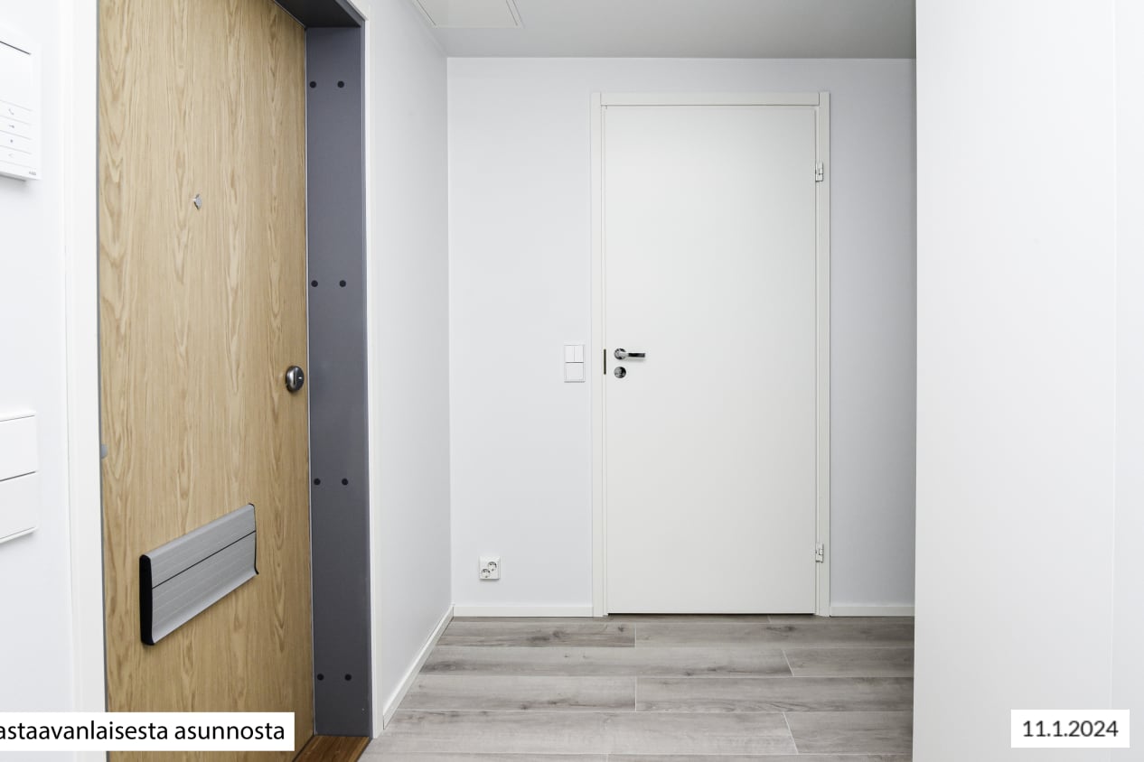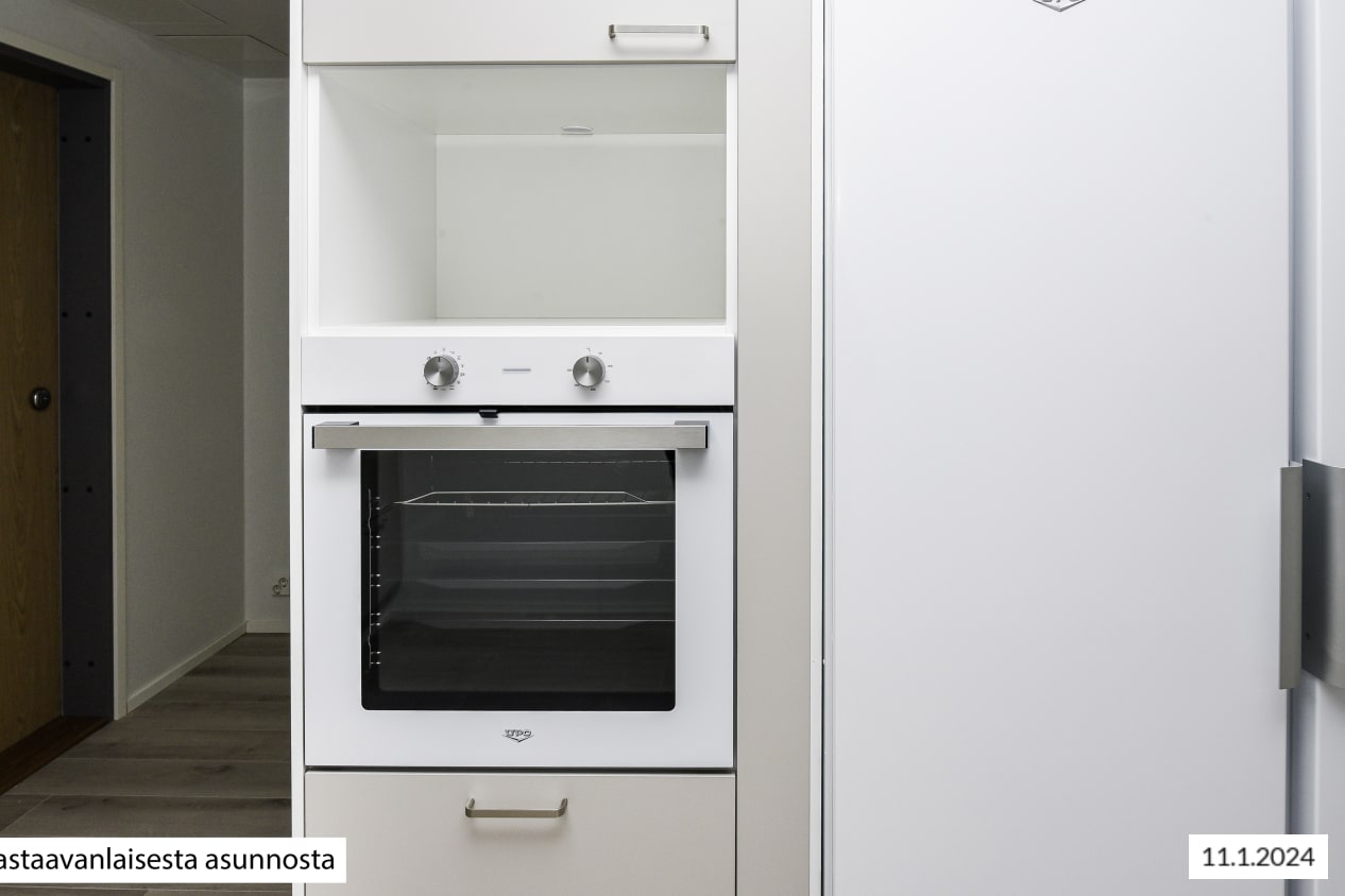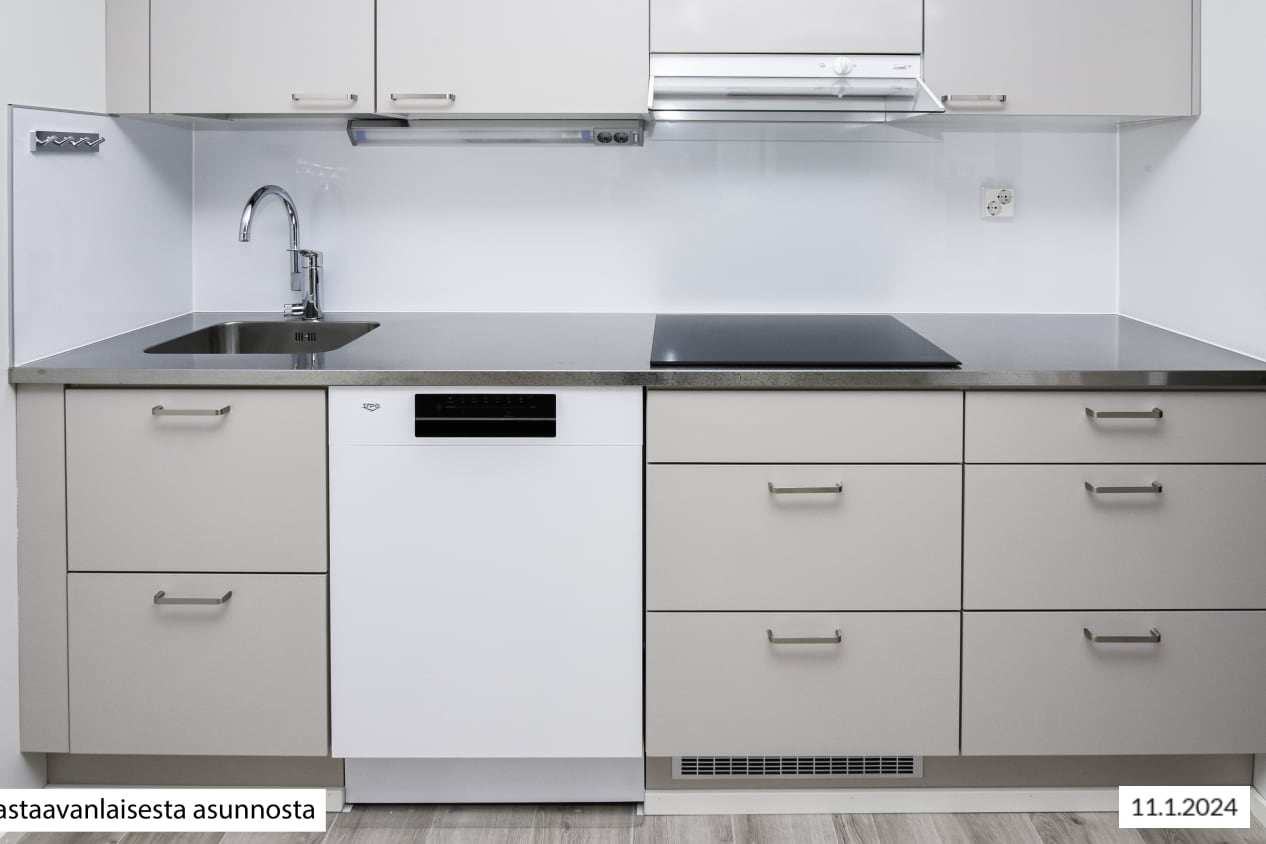 The fresh bathroom has room for relaxation and is combined with your own private sauna you can heat to just the right temperature. The white-tiled walls and grey-tiled floor create a stylish space. The durable Kide range bathroom furniture is white and made in Finland. There are also hookups and space for a washing machine and a dryer. There is also another, separate toilet for added everyday convenience.