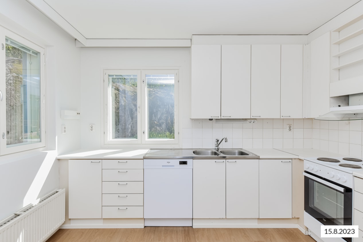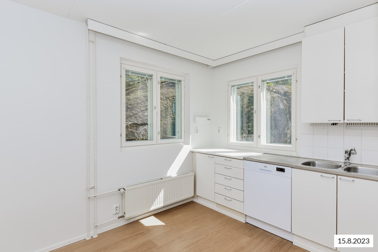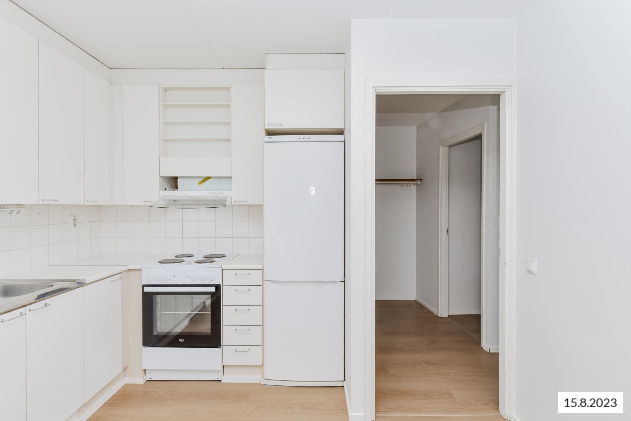 The kitchen is equipped with a dishwasher, cooker, and freezer-refrigerator. Everyday storage is made easier with a walk-in wardrobe located in the bedroom. The generously sized bathroom has space for a washing machine.