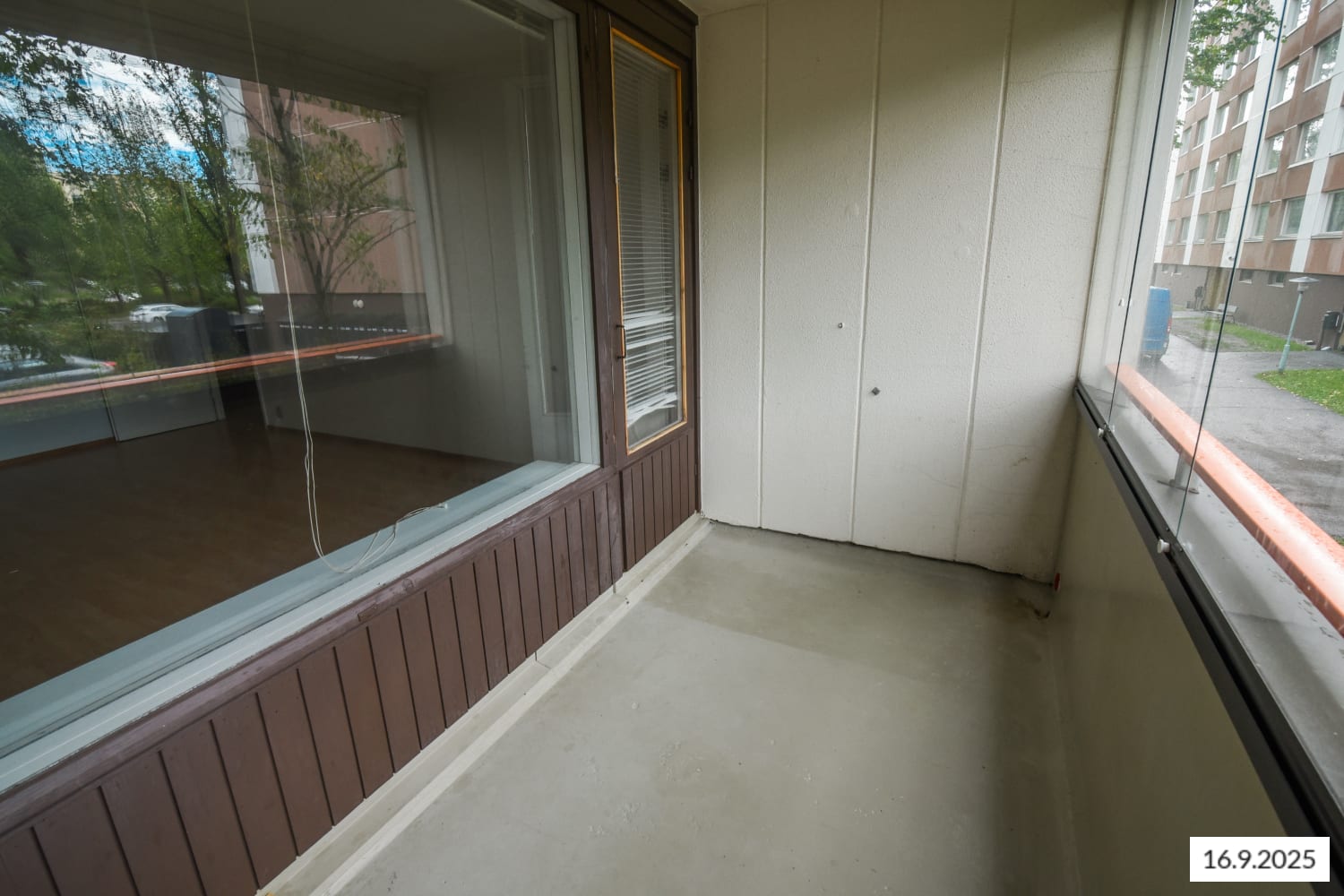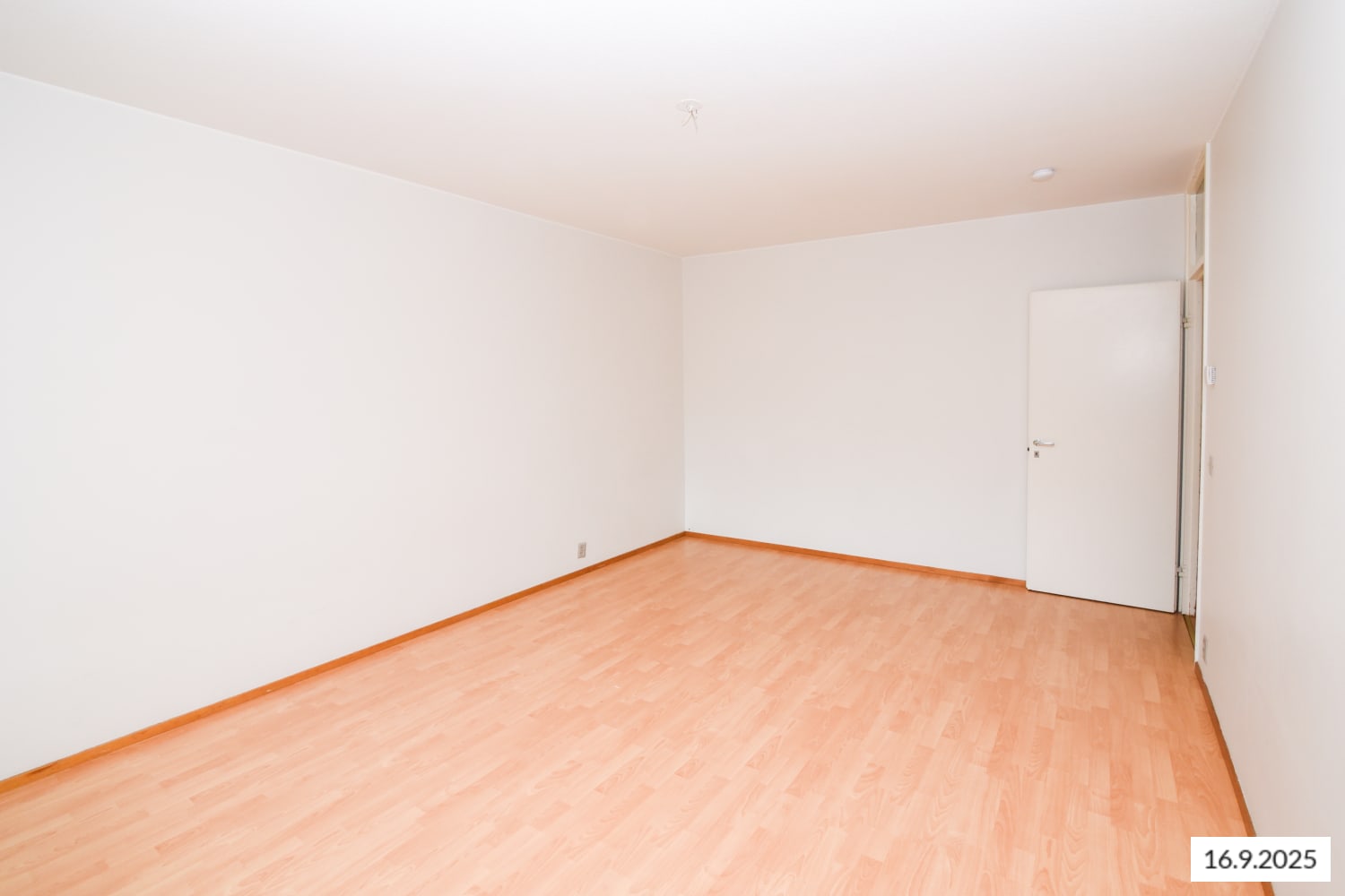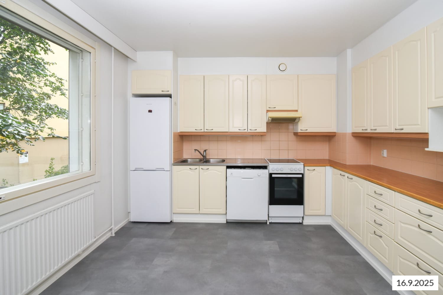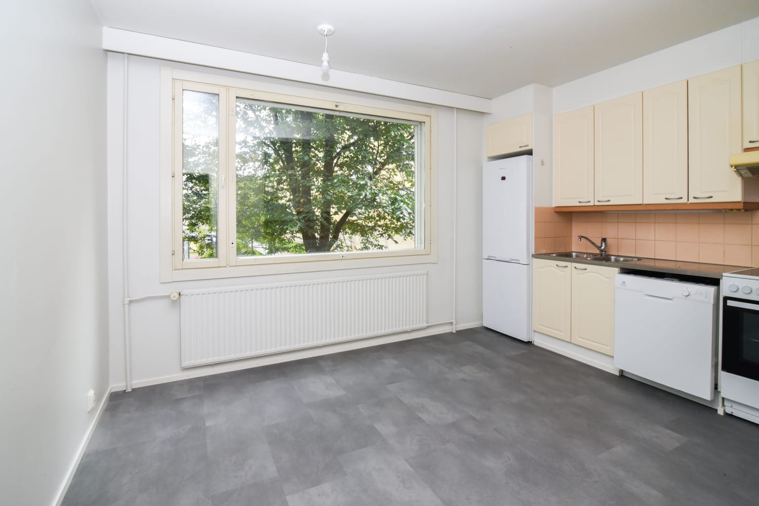 The flooring in the living areas is laminate. The neat separate kitchen provides ample space for home cooks, and a proper dining table fits nicely by the window. The kitchen cabinets are vanilla-coloured, and the equipment includes a stove and a freezer-refrigerator.