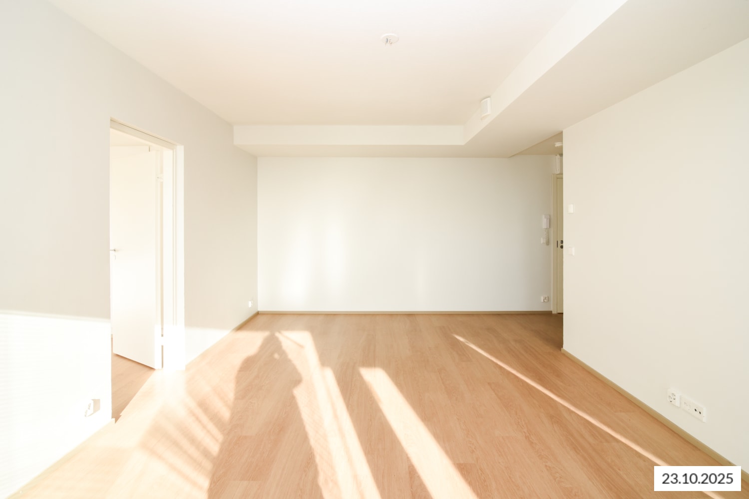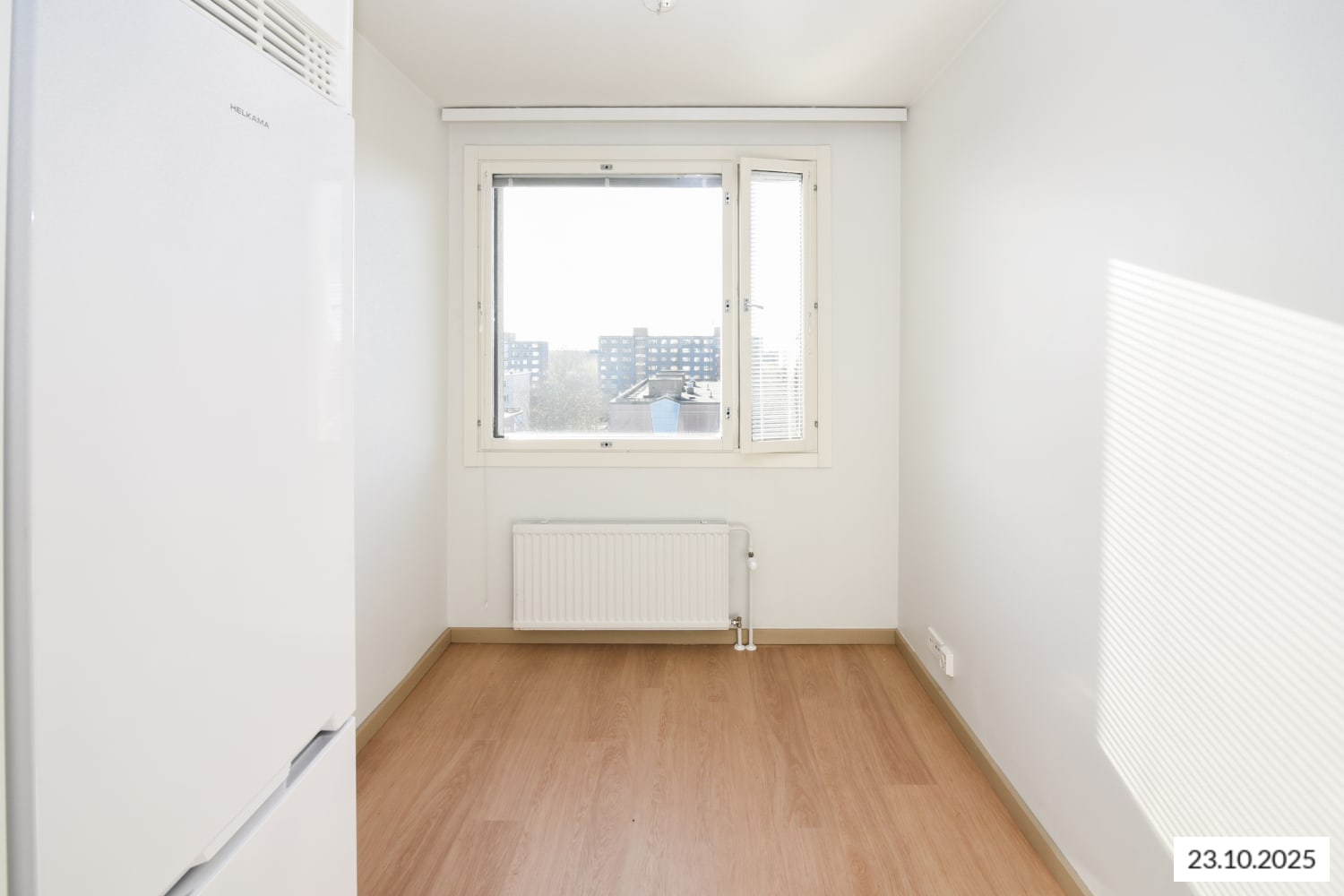 The light surfaces of this renovated one-bedroom home are pleasing to the eye and easy to furnish into your own home. The living room has access to the south-facing glazed balcony, which acts as an extra room during the summer months. The home's light surfaces, including laminate flooring resembling light oak planks and white walls, create a fresh and clear atmosphere.