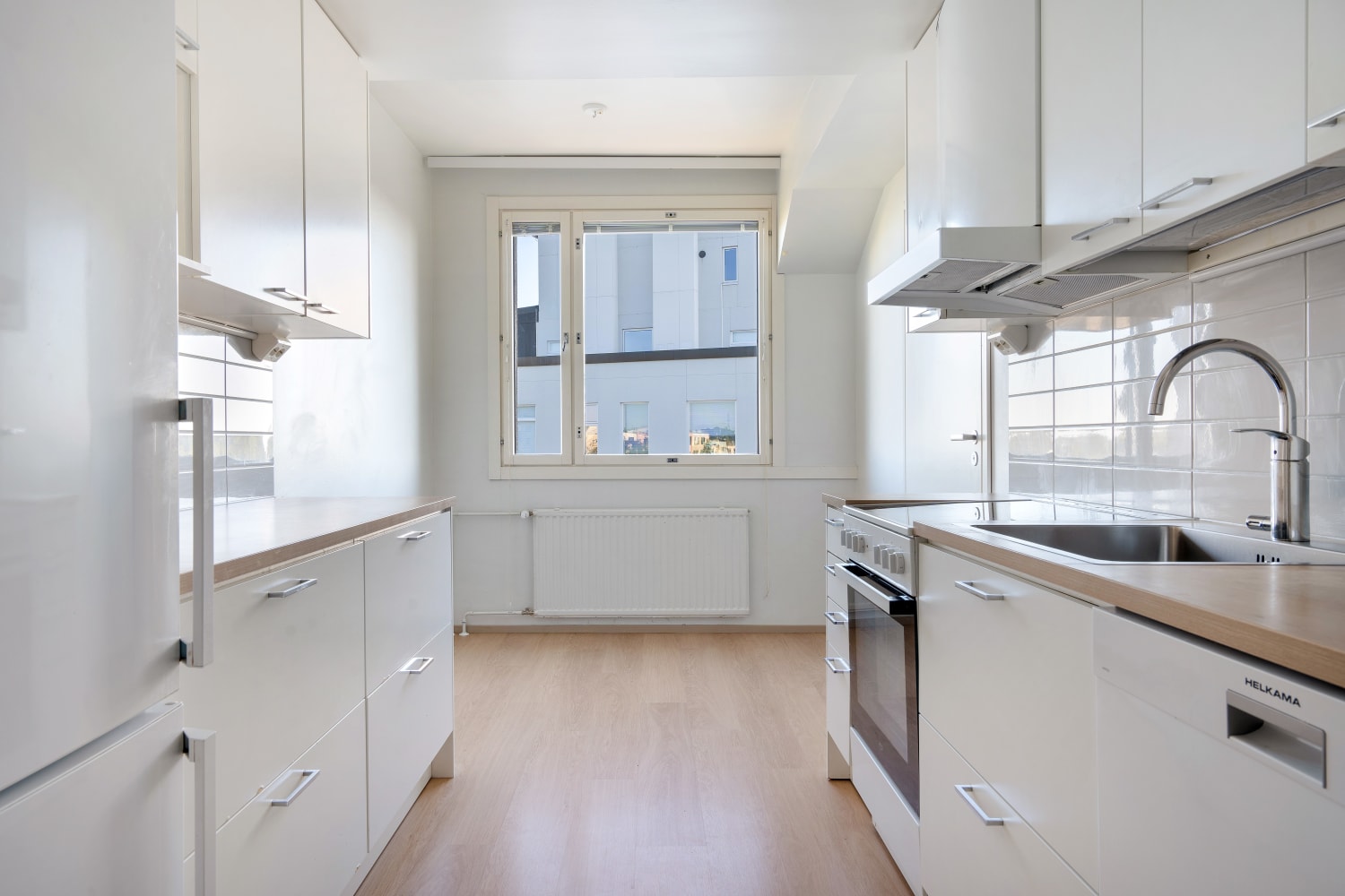 Raudikkokuja 3 is a nine-storey building close to Hakunila shopping centre in eastern Vantaa. Completed in 1970, these homes have been fully renovated to give them a fresh new look. The bright apartments have the large windows and clean and easily furnished layouts typical of 1970s homes. The apartments with two and three bedrooms extend through the building while the studios and one-bedroom apartments have southern exposures. All homes feature a sunny glassed-in balcony where you can create a potted-plant oasis or just sit back to enjoy a cup of coffee. The topmost floors offer stunning views across Hakunila.