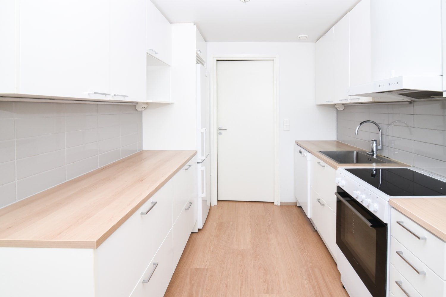 The kitchen furnishings are white, with light grey tiling between the upper and lower cabinets. The worktop is light laminate. The kitchen includes a freezer-refrigerator, dishwasher, stove, and cooker hood, with a provision for a microwave.