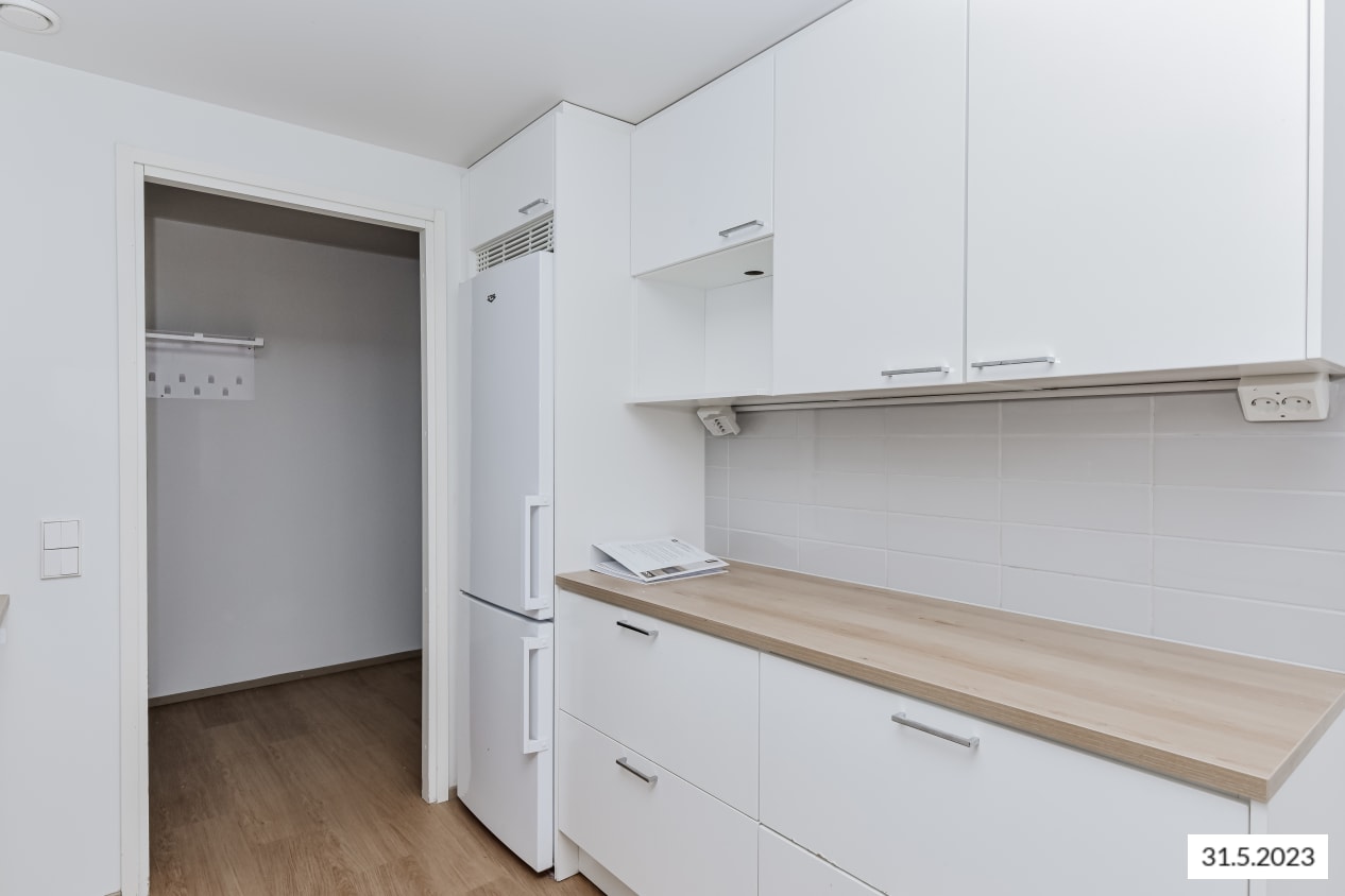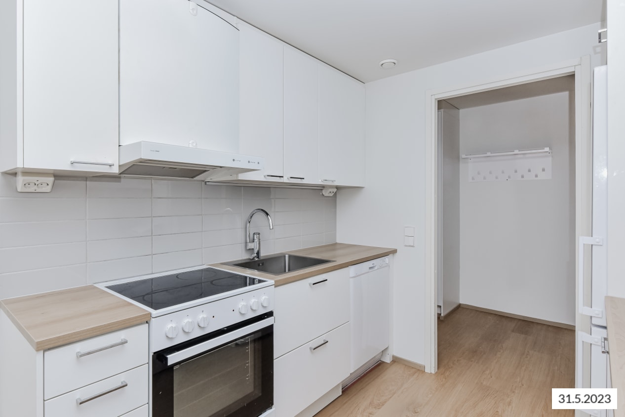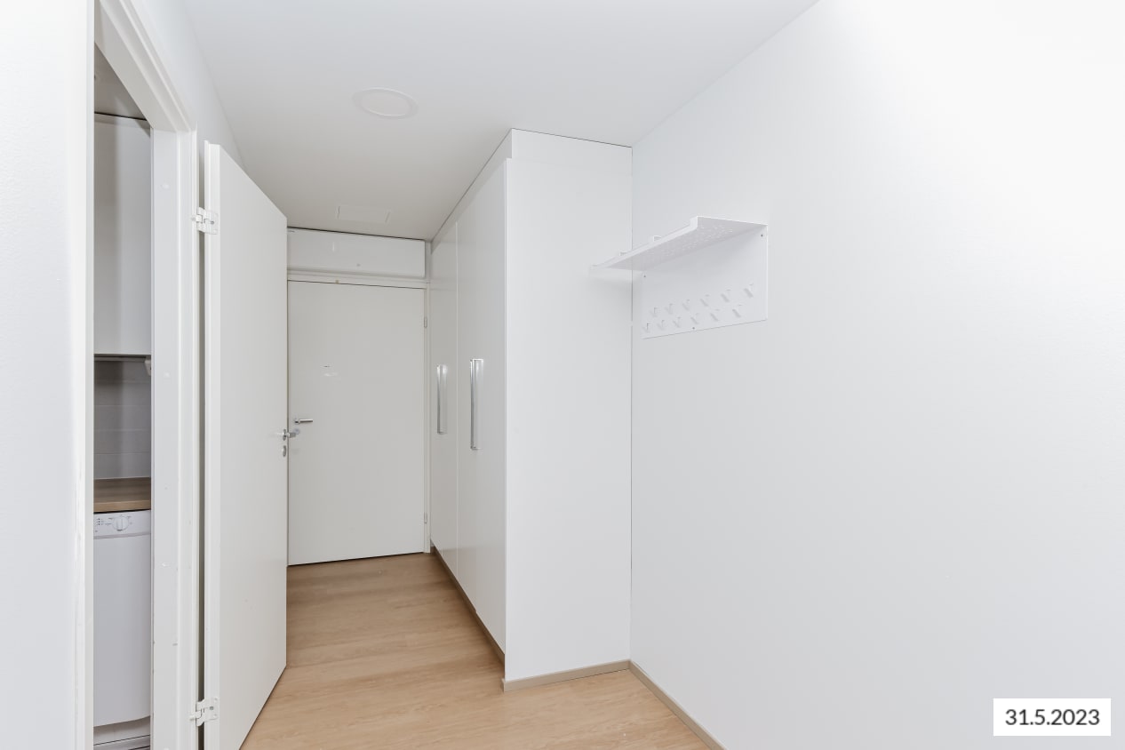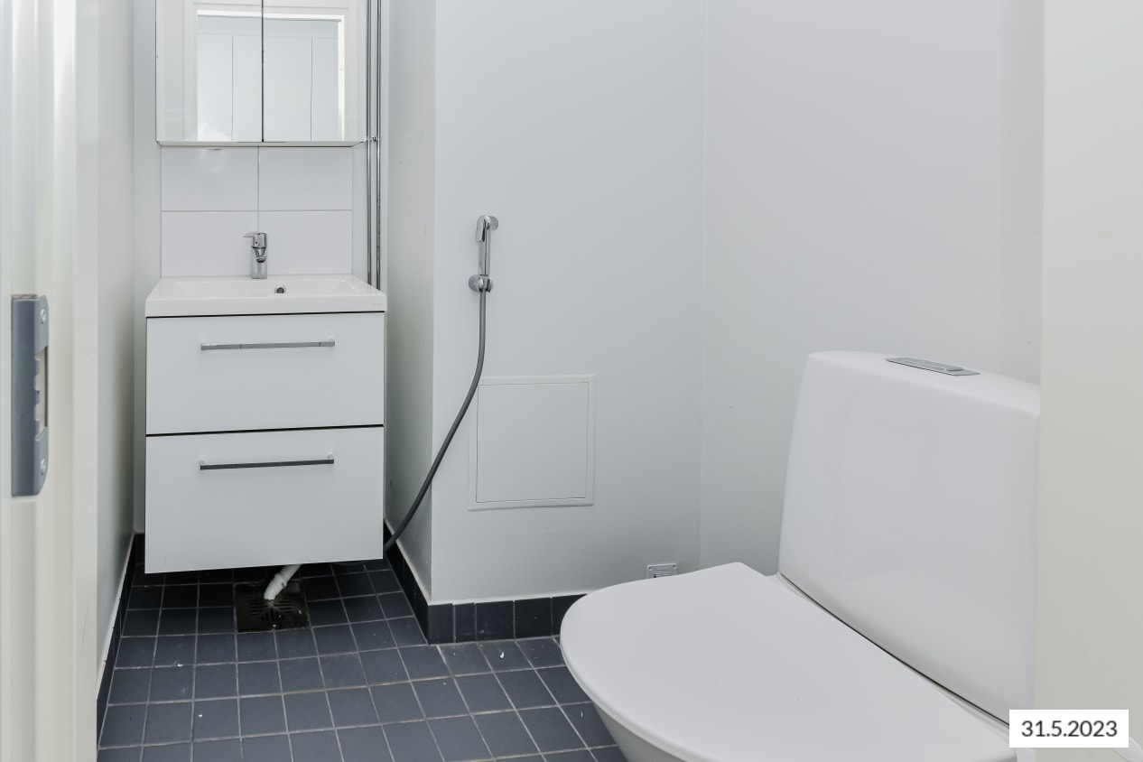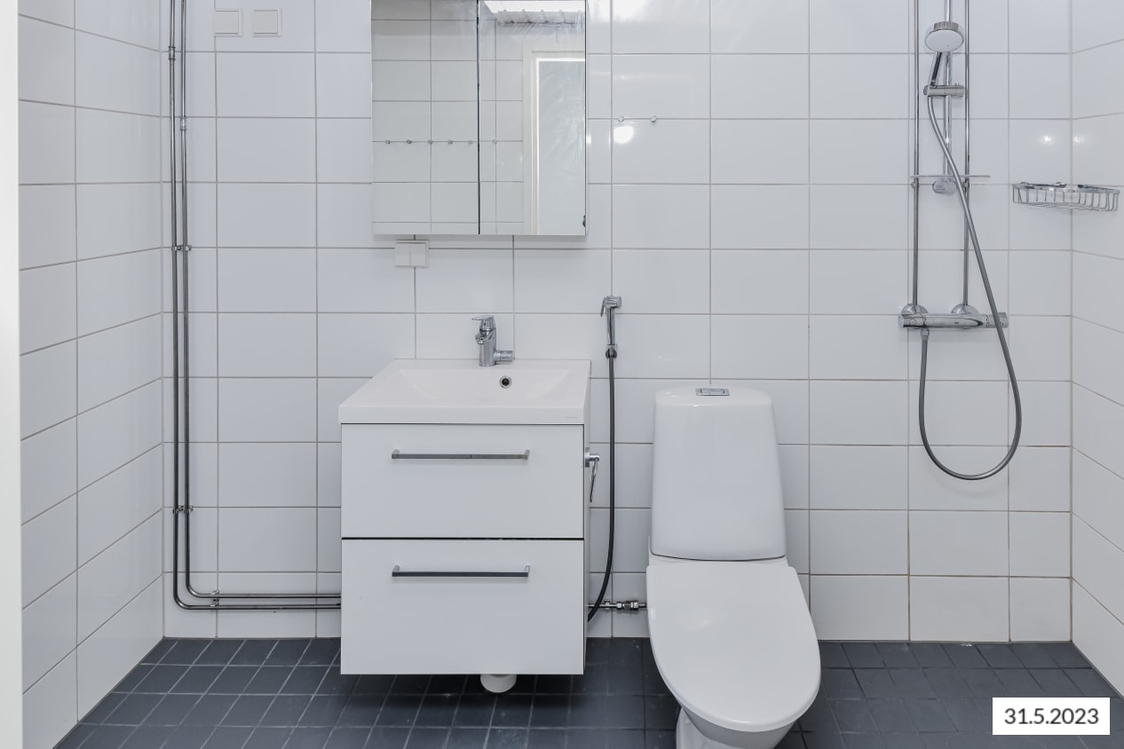 The bathroom furniture is from the Finnish Kide range, made from durable and beautiful white solid laminate. The bathroom walls are glossy white tiles, and the floor tiles are grey. There is a reservation for a washing machine and tumble dryer.