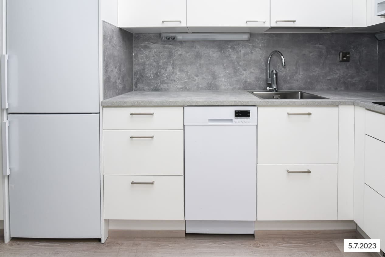 The bathroom floors are in dark grey 10x10 cm tiles and the walls in large white tiles. The ceilings are in alder wood panelling. The bathrooms have two floor drains. The bathrooms come with Finnish, durable and easy-care Kide range furniture, and most of the apartments also have a laundry cabinet. The bathrooms have space and hook-ups for a washing machine and dryer. The wet rooms have wet underfloor heating. The apartment walls are painted in an off-white shade, and the floors are in footfall sound-reducing pale oak-effect laminate. In the loft-style apartments, the frame of the wooden stairs is white and the bannister and steps are stained in dark grey. The windows are fitted with Venetian blinds and feature double curtain tracks. The modern kitchens are equipped with an induction cooktop with two or four burners. Other appliances are white: a 45- or 60-cm dishwasher, cooker hood, oven and either a fridge-freezer or a separate fridge and freezer. There is space for a microwave in the kitchen units. The buildings mainly feature centralised mechanical supply and exhaust ventilation with heat recovery, and the business spaces/loft-style apartments have space-specific supply and exhaust ventilation with cooling. The property is heated with geothermal energy. Heat distribution takes place via the heat distribution room though hot-water radiator heating.