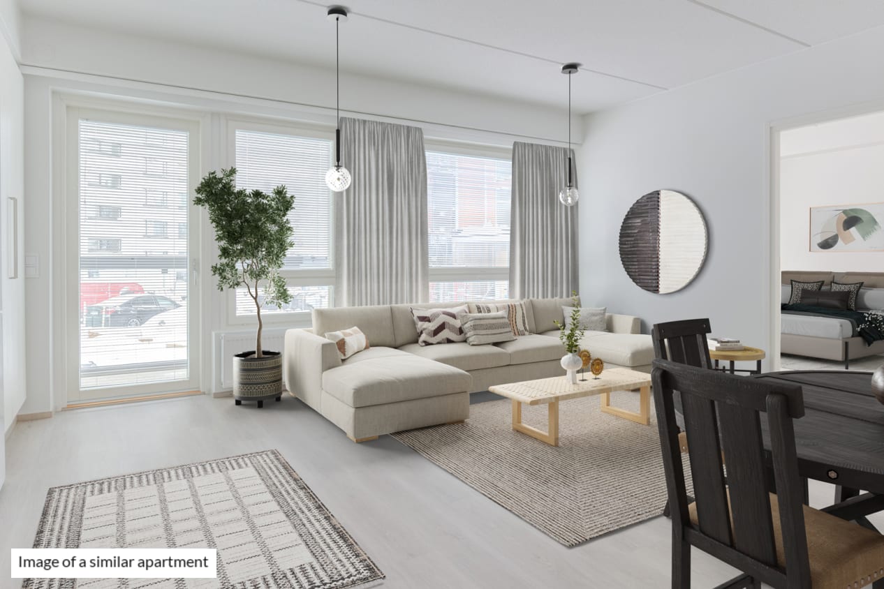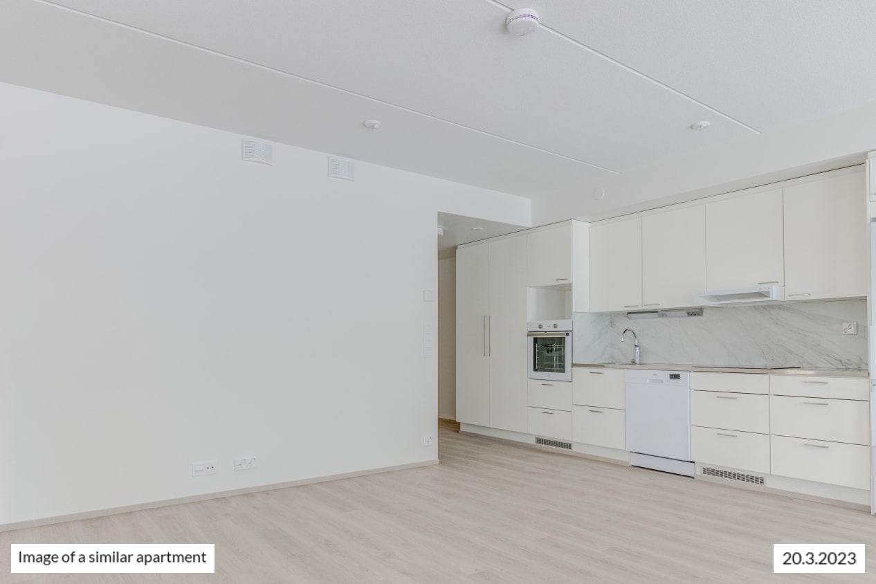 The bathroom floors are in dark grey 10x10 cm tiles and the walls in large white tiles. The ceilings are in alder wood panelling. The bathrooms have two floor drains. The bathrooms come with Finnish, durable and easy-care Kide range furniture, and most of the apartments also have a laundry cabinet. The bathrooms have space and hook-ups for a washing machine and dryer. The wet rooms have wet underfloor heating. The apartment walls are painted in an off-white shade, and the floors are in footfall sound-reducing pale oak-effect laminate. In the loft-style apartments, the frame of the wooden stairs is white and the bannister and steps are stained in dark grey. The windows are fitted with Venetian blinds and feature double curtain tracks. The modern kitchens are equipped with an induction cooktop with two or four burners. Other appliances are white: a 45- or 60-cm dishwasher, cooker hood, oven and either a fridge-freezer or a separate fridge and freezer. There is space for a microwave in the kitchen units. The buildings mainly feature centralised mechanical supply and exhaust ventilation with heat recovery, and the business spaces/loft-style apartments have space-specific supply and exhaust ventilation with cooling. The property is heated with geothermal energy. Heat distribution takes place via the heat distribution room though hot-water radiator heating.
