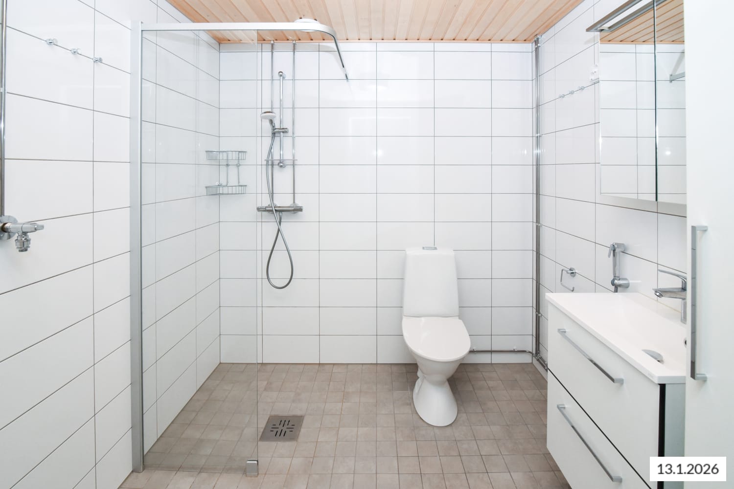 The fresh bathroom comes with hook-ups and space for a washing machine and a spacious laundry cabinet for sorting your washing. The bathroom walls are done in white and the floor in grey tiles.