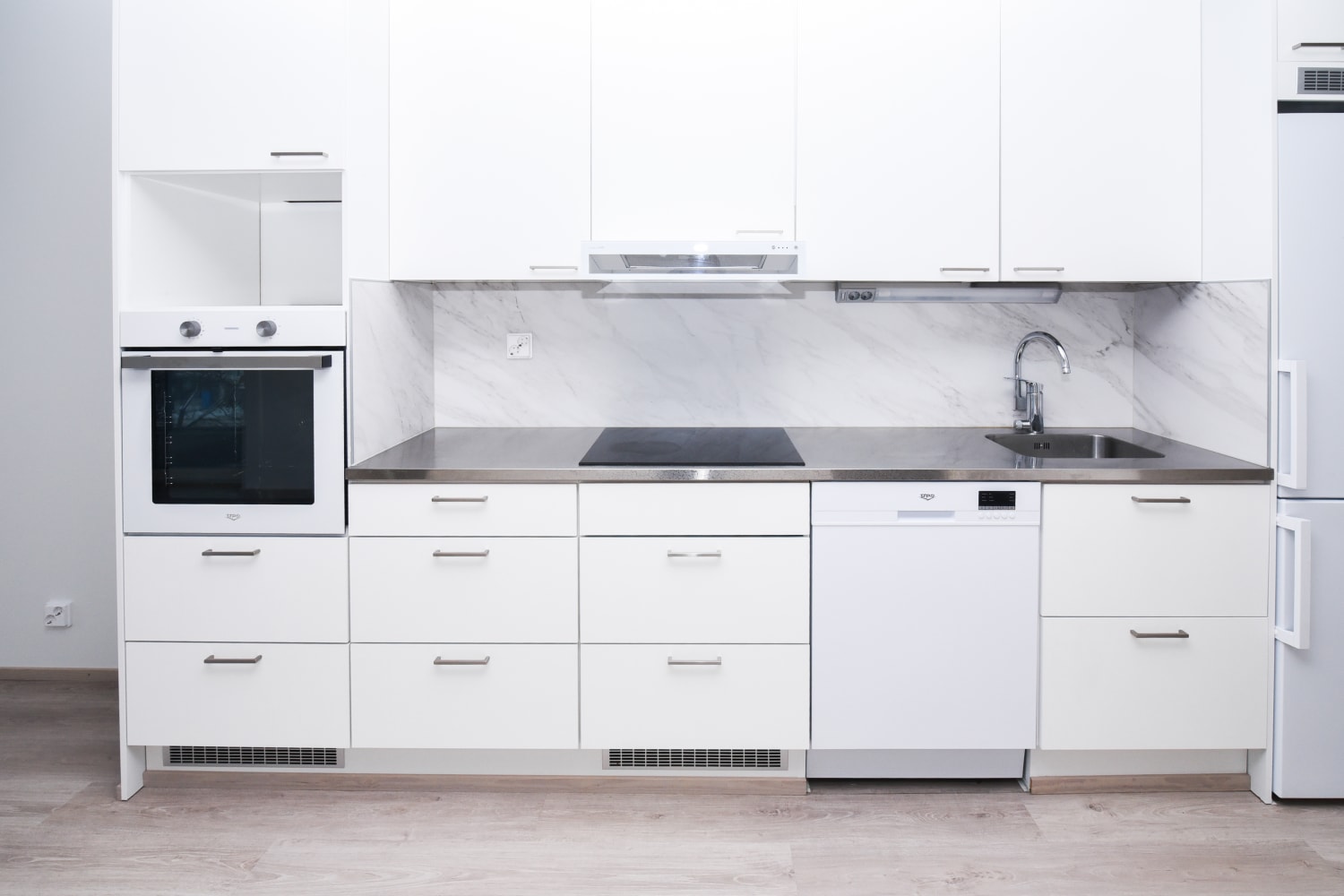 The pale surface materials of this home provide a neutral backdrop for your personal decor style. The floors are done in pale oak-effect laminate and the walls are painted in a pale shade. The windows are fitted with white Venetian blinds. The kitchen units are white and the backsplash and the countertops are in pale marble-effect laminate or stainless steel. The fully equipped kitchen has an induction cooktop, built-in oven, cooker hood, dishwasher and fridge-freezer. There is also space for a microwave. This kitchen is a joy to cook in!