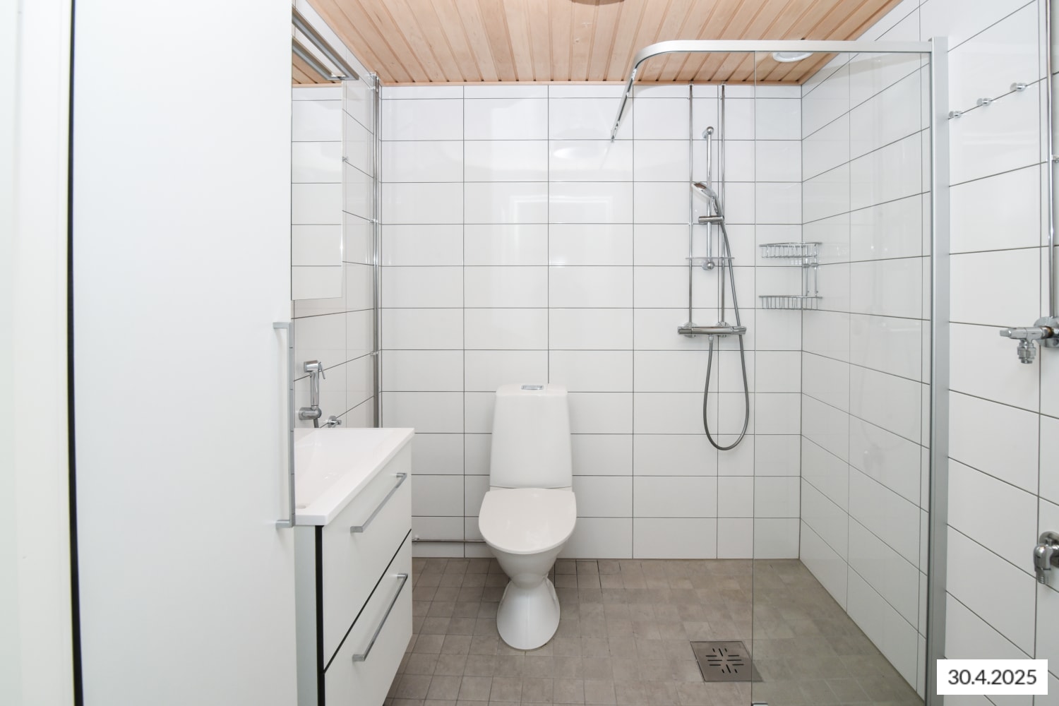 The fresh bathroom comes with hook-ups and space for a washing machine and a spacious laundry cabinet for sorting your washing. The bathroom walls are done in white and the floor in grey tiles.