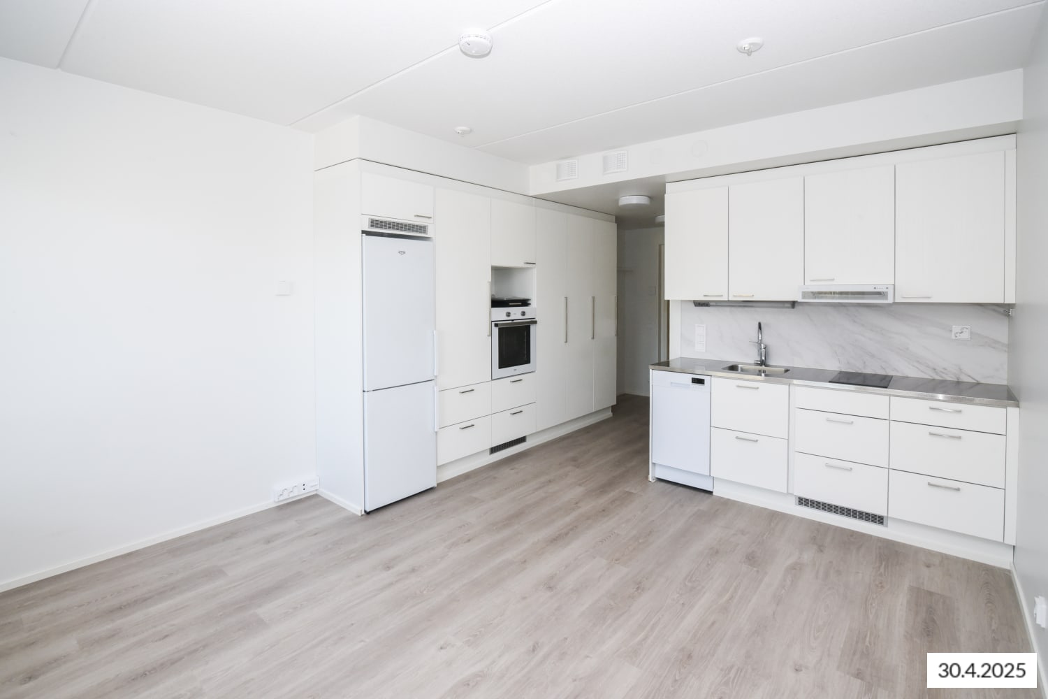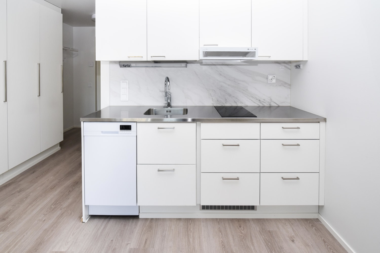 The pale surface materials of this home provide a neutral backdrop for your personal decor style. The floors are done in pale oak-effect laminate and the walls are painted in a pale shade. The windows are fitted with white Venetian blinds. The kitchen units are white and the backsplash and the countertops are in pale marble-effect laminate or stainless steel. The fully equipped kitchen has an induction cooktop, built-in oven, cooker hood, dishwasher and fridge-freezer. There is also space for a microwave. This kitchen is a joy to cook in!