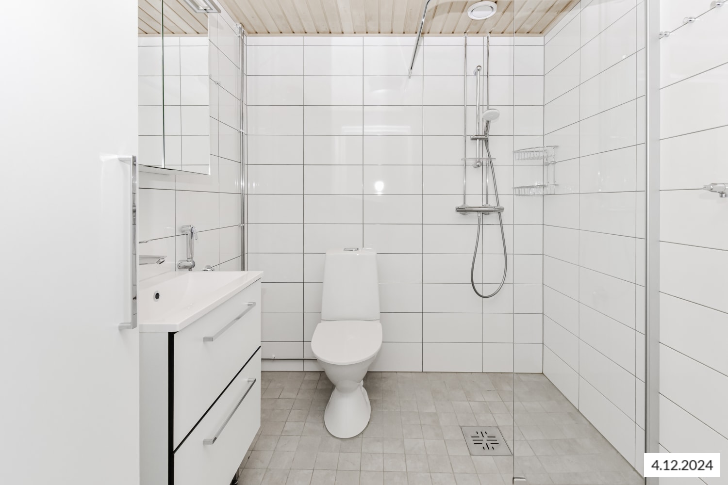 The fresh bathroom comes with hook-ups and space for a washing machine and a spacious laundry cabinet for sorting your washing. The bathroom walls are done in white and the floor in grey tiles.