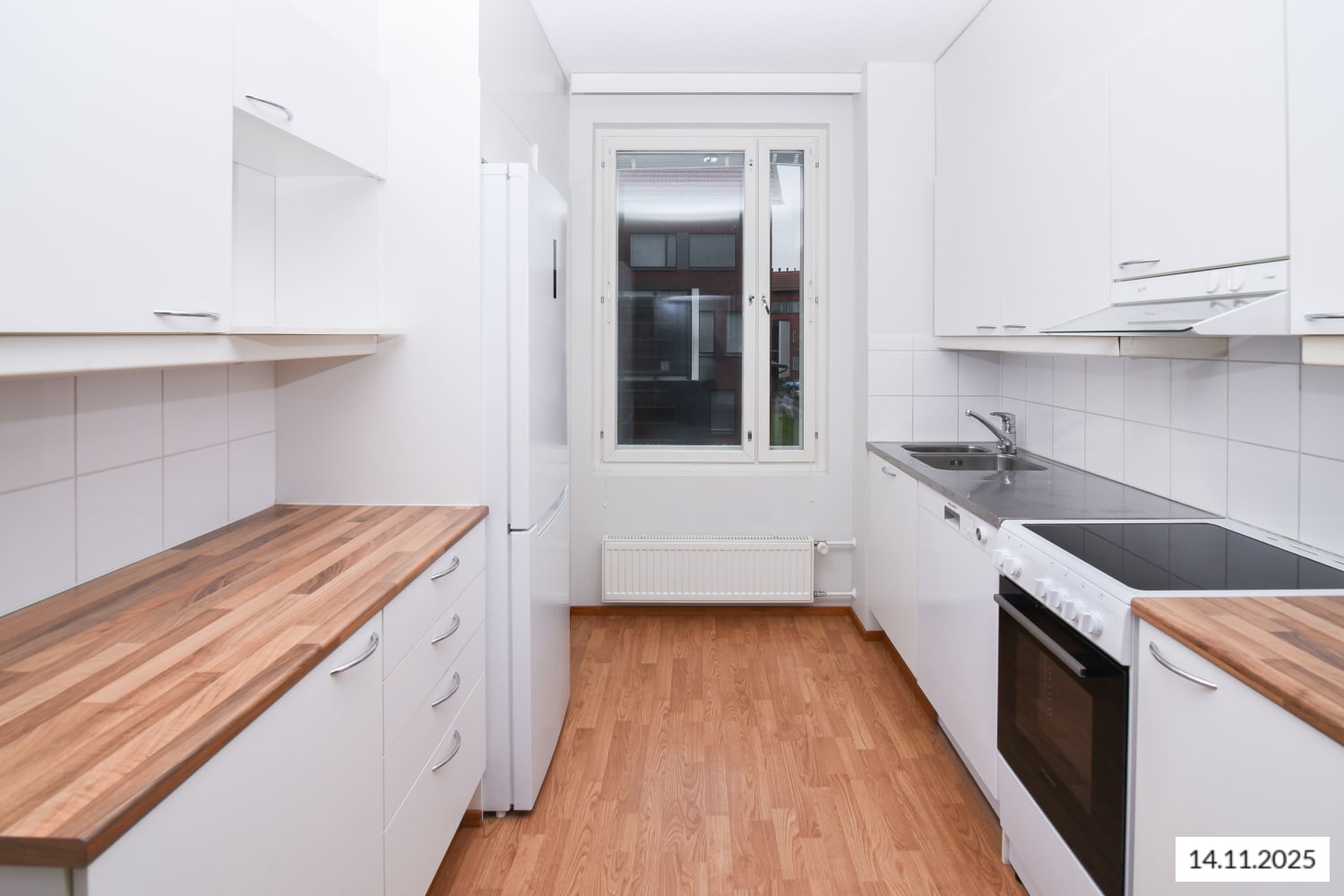 The kitchen is equipped with white cabinets, a cooker, a refrigerator, and there is space for a dishwasher.