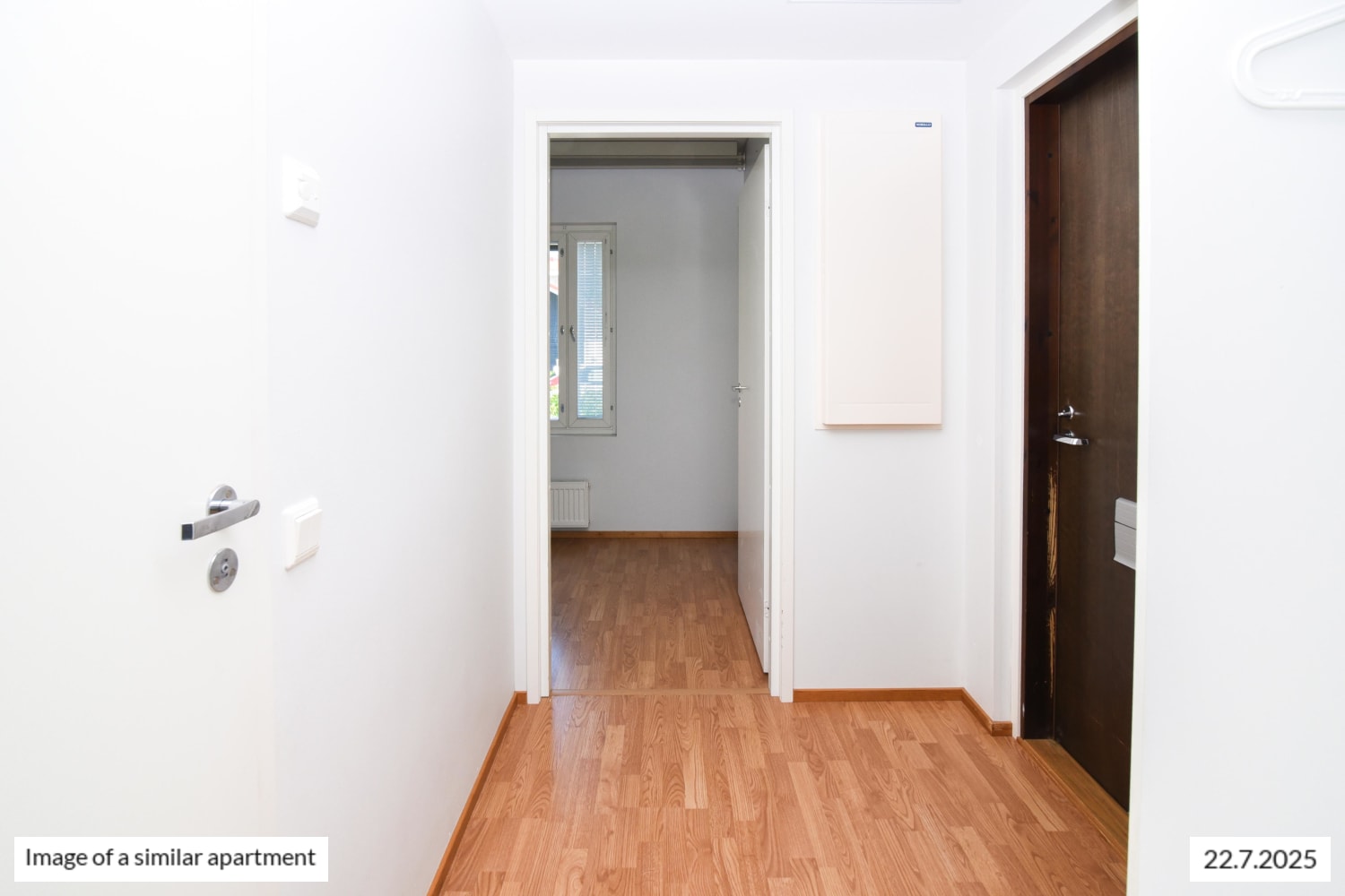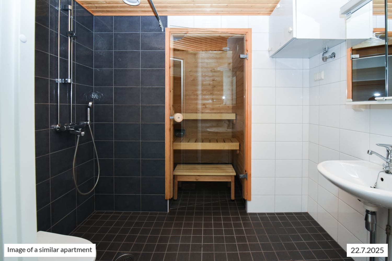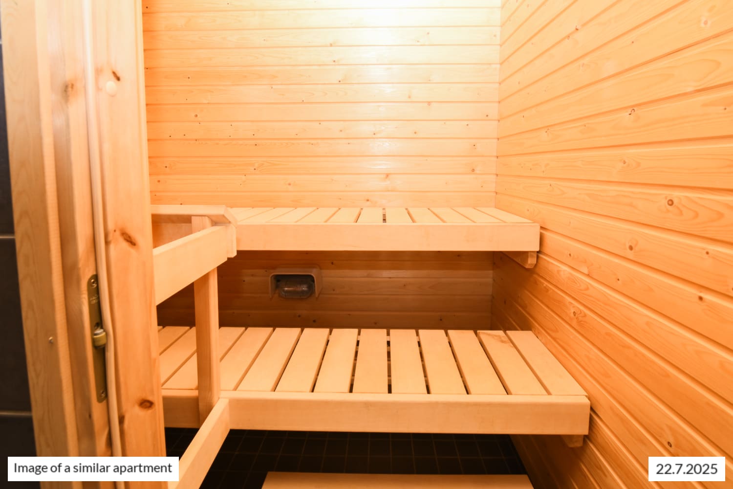 This through-apartment is cosy and airy. The flooring throughout the residence is durable laminate, and the bathrooms are fully tiled with storage space and a designated area for a washing machine. The home is topped off with its own sauna.