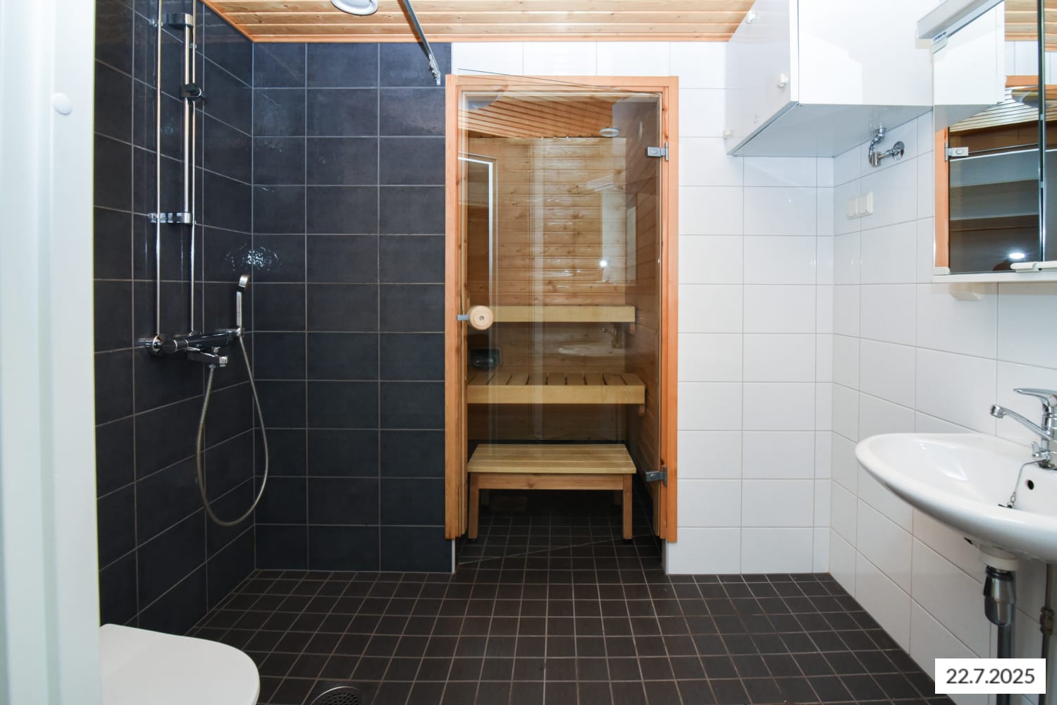 This through-apartment is cosy and airy. The flooring throughout the residence is durable laminate, and the bathrooms are fully tiled with storage space and a designated area for a washing machine. The home is topped off with its own sauna.