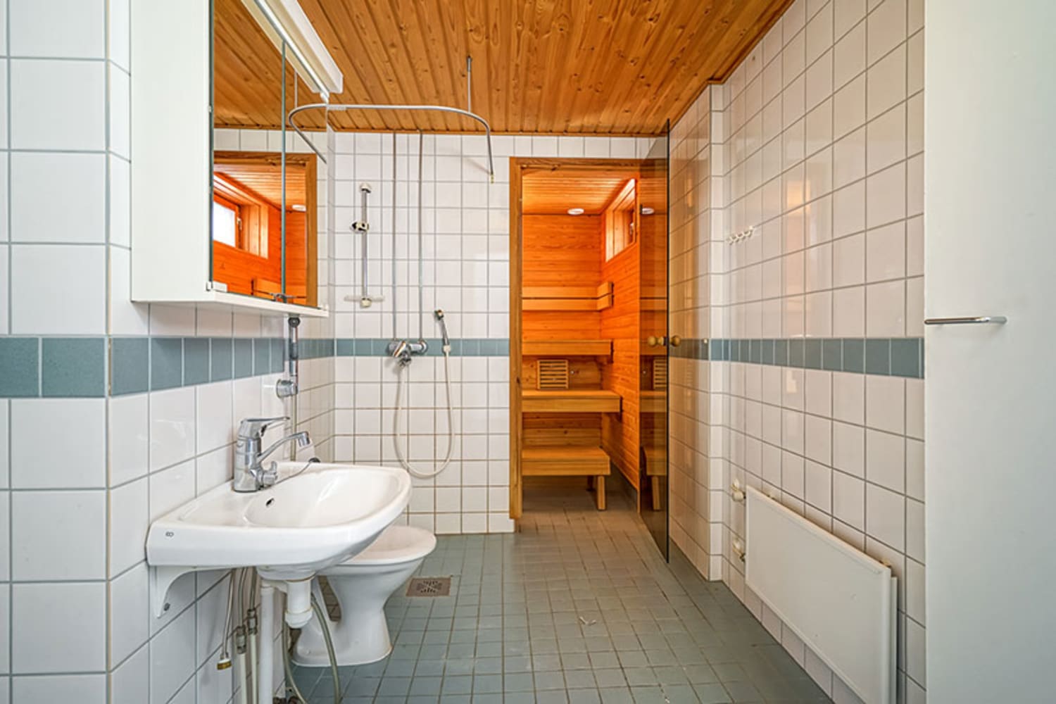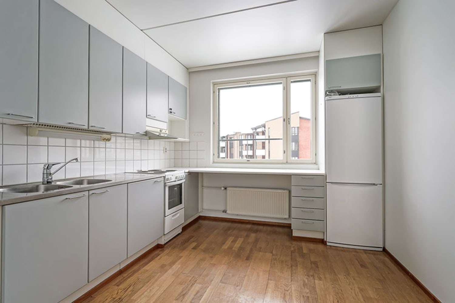 The best features of this cosy end apartment include a glazed balcony overlooking the sunny courtyard and its own windowed sauna. The living room is filled with natural light from two directions, and both bedrooms have closet space.