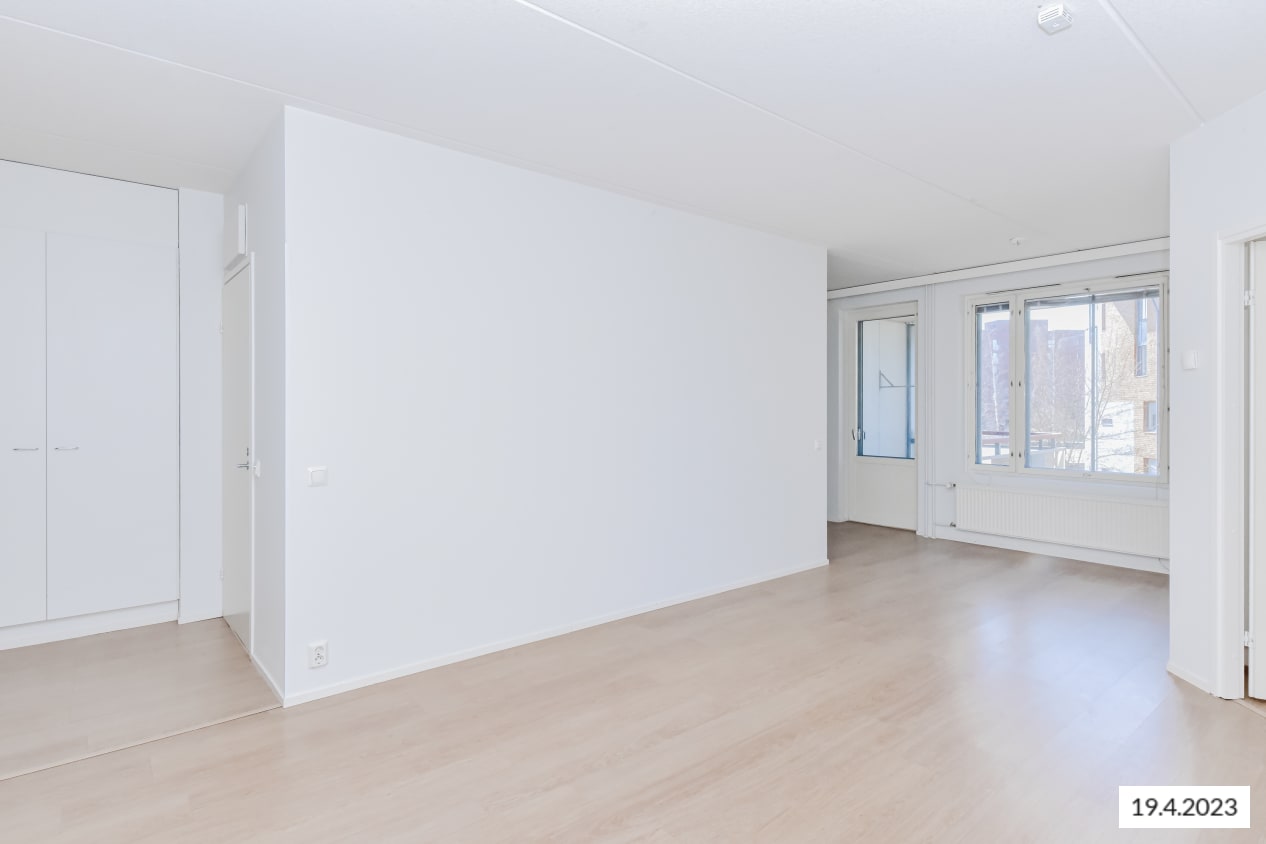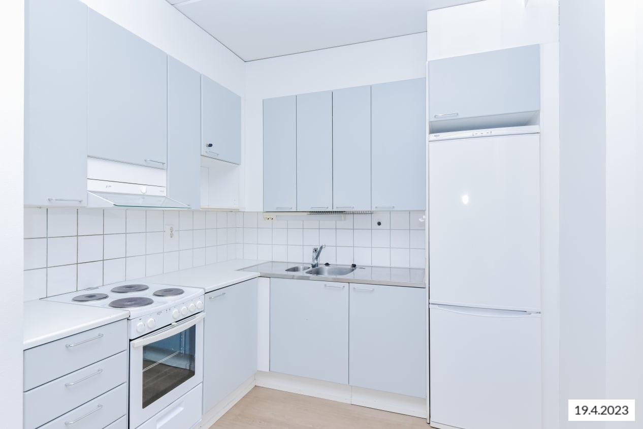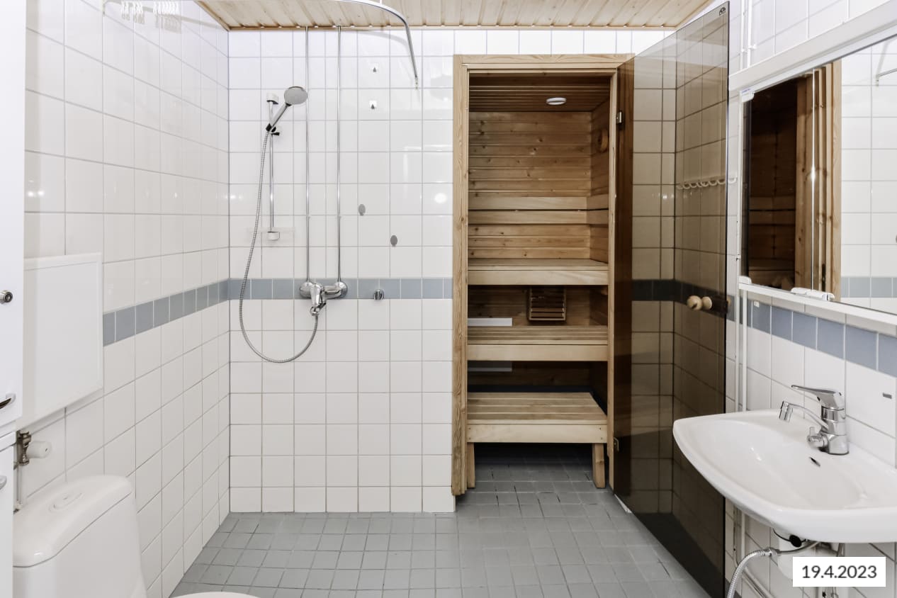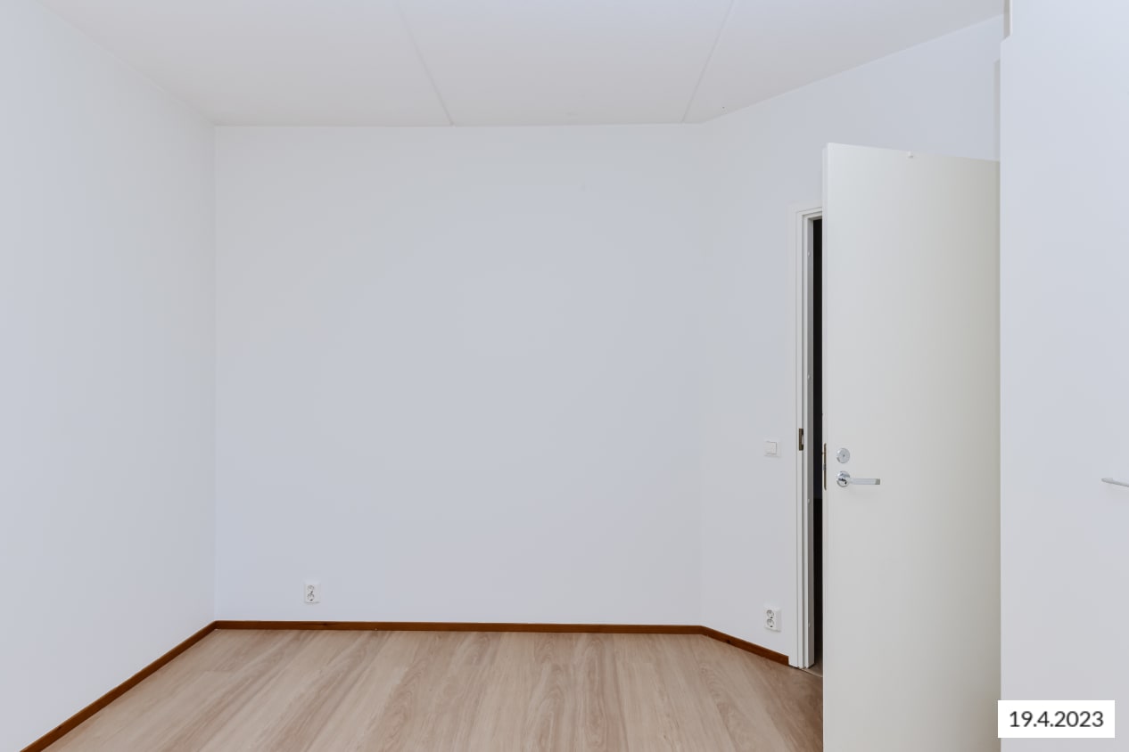 This understated three-room apartment provides an excellent and neutral foundation for any interior design style. The floors are light oak-colored laminate, and the walls are painted white. The living room has entrances to two bedrooms and the kitchen area. The balcony, accessible from the living room, adds a sense of spaciousness. The highlight of the home is its private sauna, perfect for relaxation and unwinding.