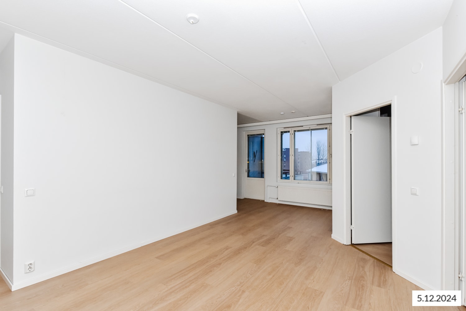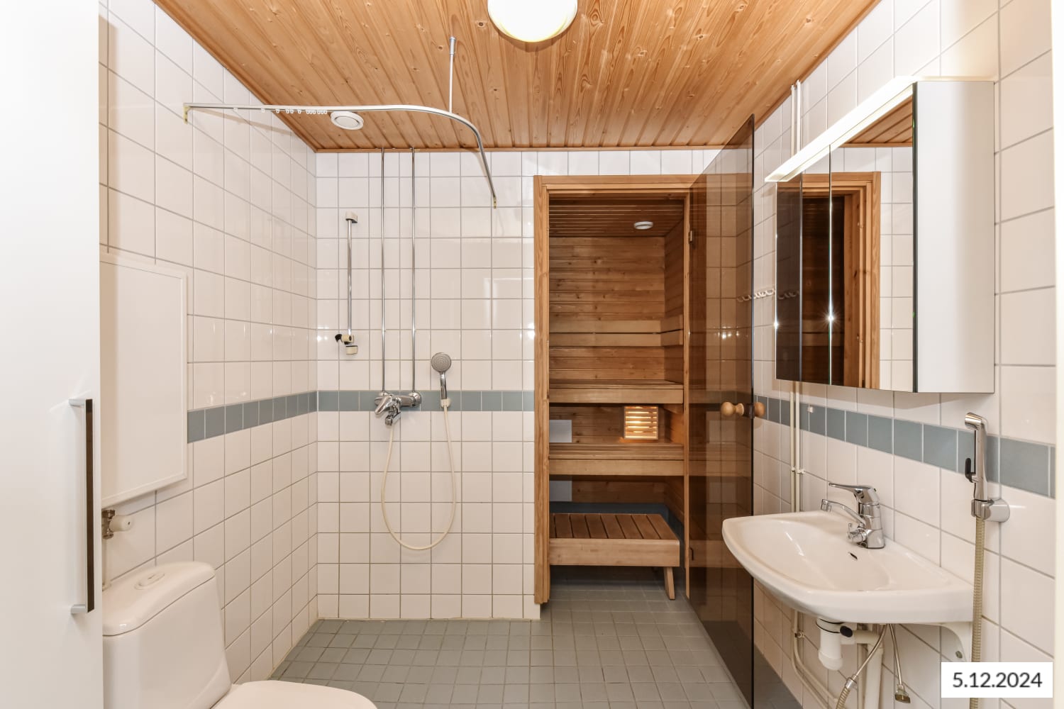 This compact two-bedroom apartment offers the comfort of a private sauna and a cozy, functional layout. The kitchen is connected to the living room yet thoughtfully positioned slightly apart from the main living area.