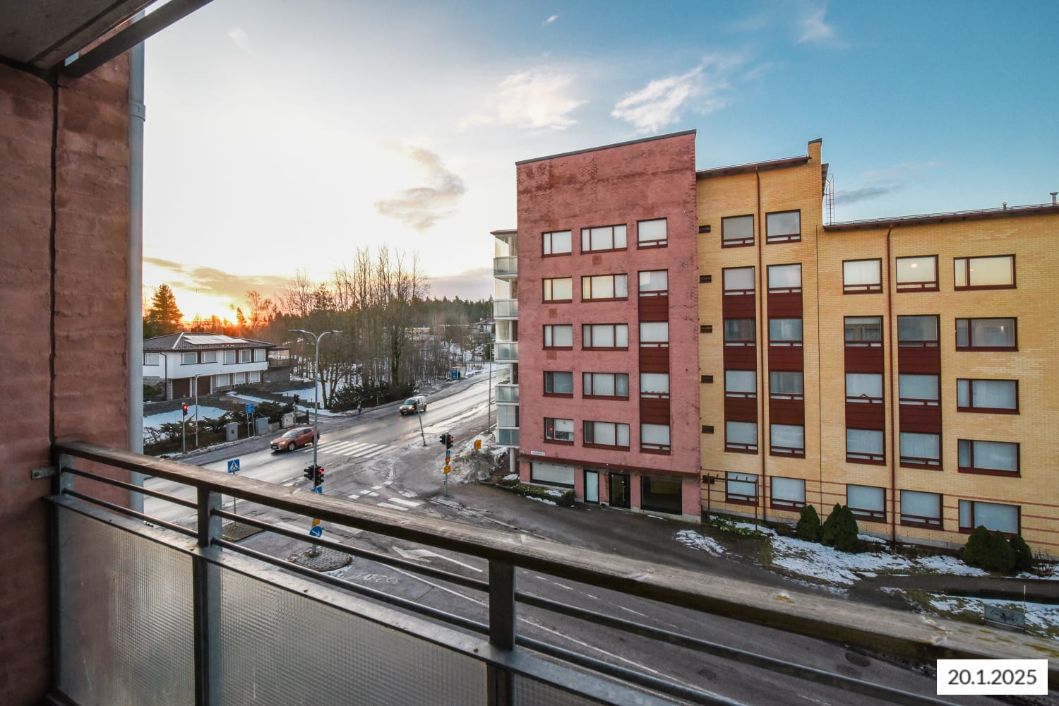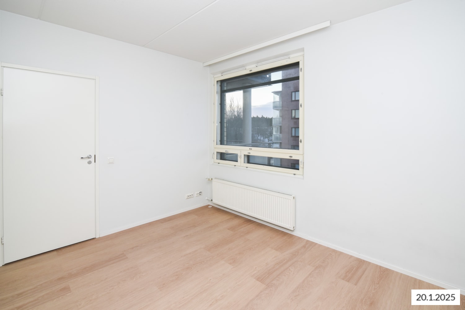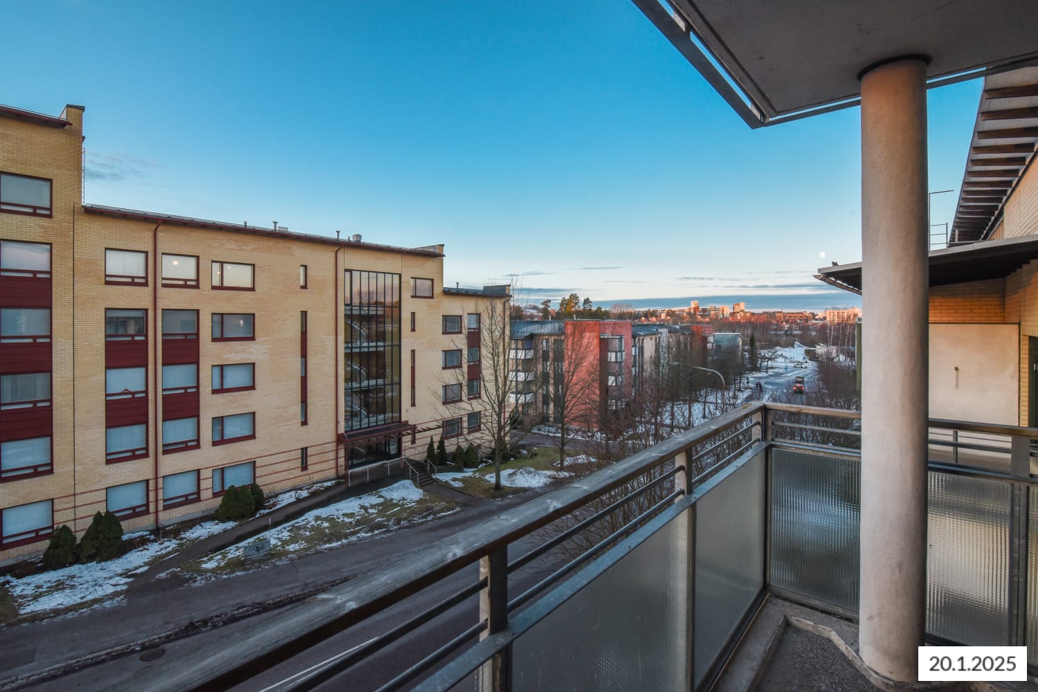 In a peaceful residential building near the Helsinki-Vantaa border, about a kilometre from Myyrmäki’s amenities, a spacious through-apartment with two bedrooms has become available. The balcony offers a south-southwest view towards Vaskipellontie, while the kitchen window overlooks the playground.