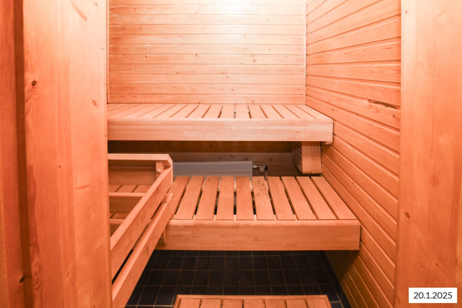 The apartment features wood-toned laminate flooring. The fully tiled bathroom includes space and connections for a washing machine, and the home is complete with its own sauna—perfect for relaxing, with the balcony providing a refreshing cool-down spot. A separate guest toilet adds extra convenience to everyday life.